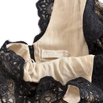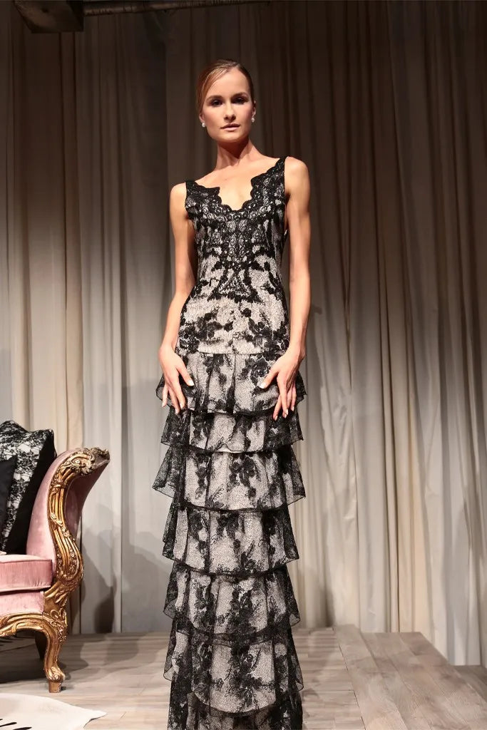 Alice and Olivia 'Powell' tiered ruffle evening gown in black lace with a contrast beige lining. Featuring a v-neckline, a lowered back, and black zipper closure.