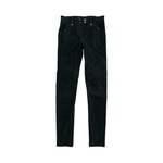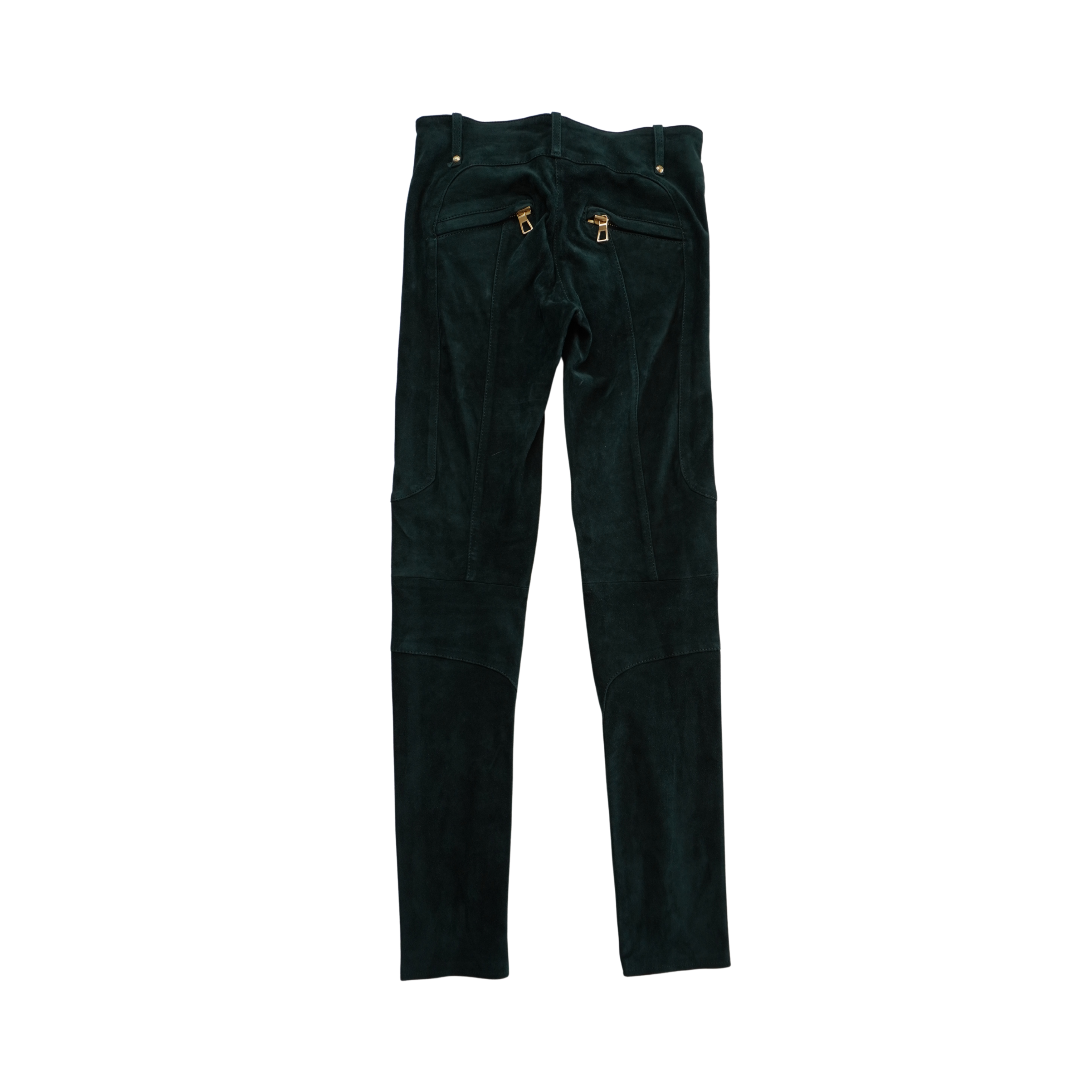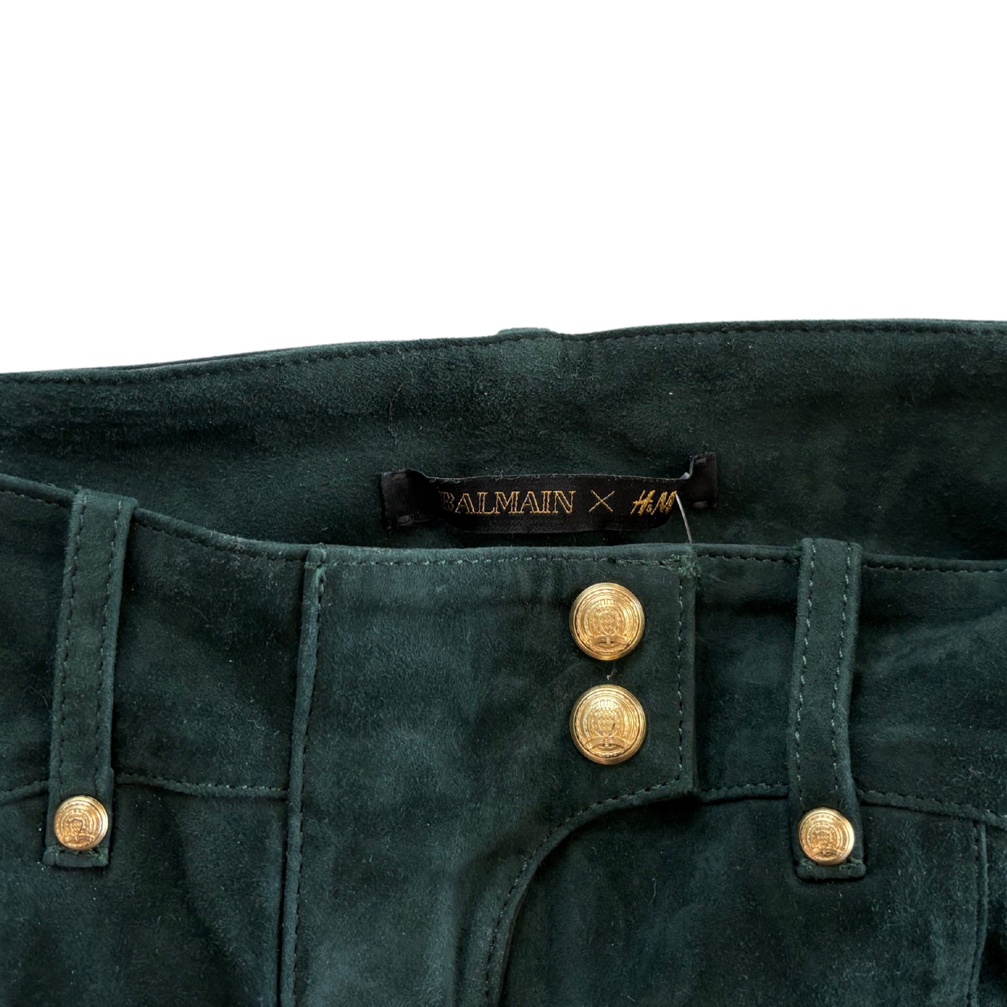 Balmain x H&M low rise skinny biker pants in dark green suede with gold logo engraved hardware.
