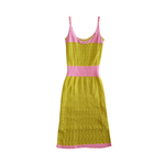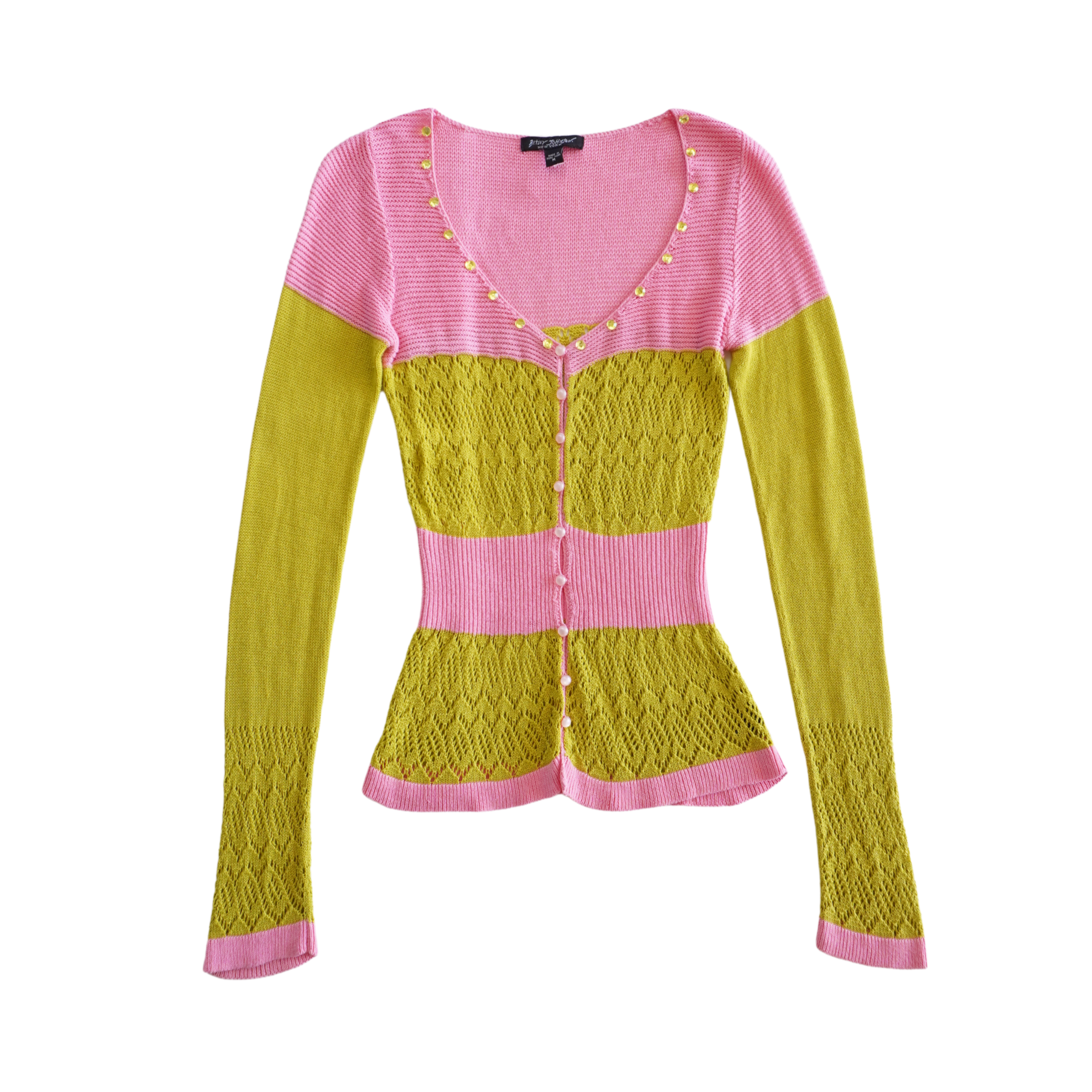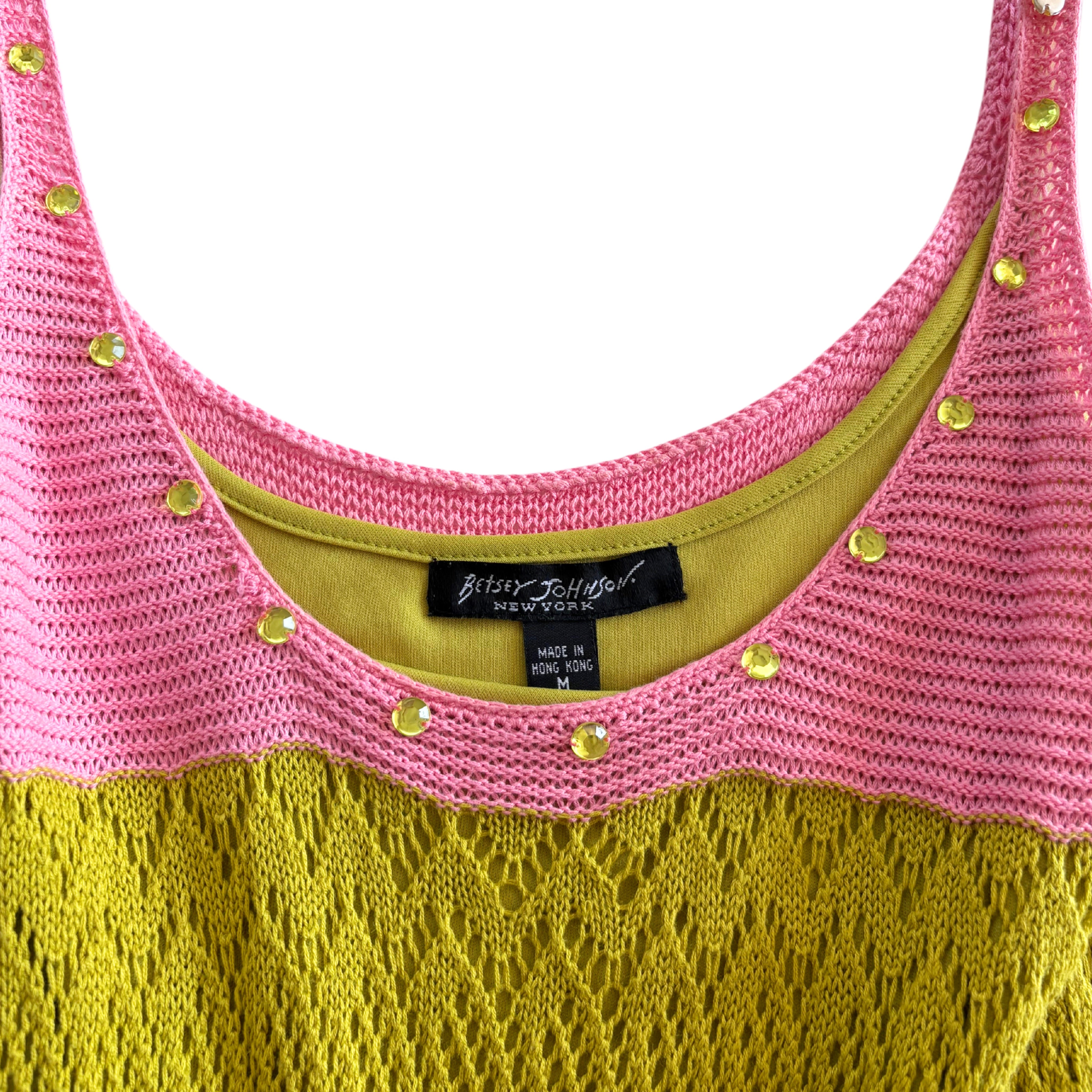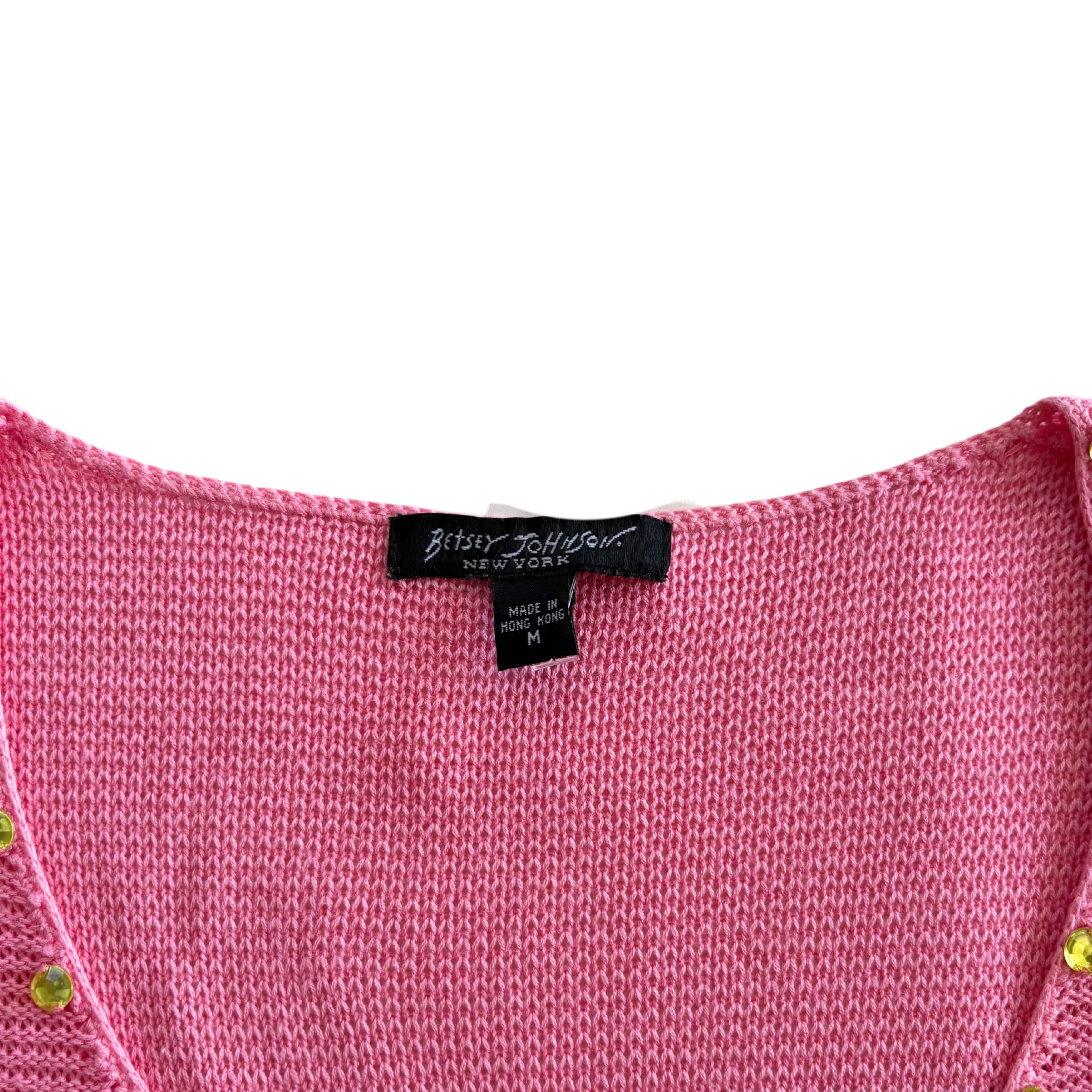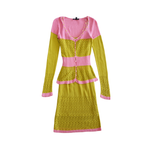 Betsey Johnson two-piece knit set in pink and chartreuse green knit cotton. The set includes a long-sleeved, button-down cardigan top with rhinestone embellishments around the neckline and pearl buttons, and a matching knit midi dress.