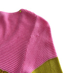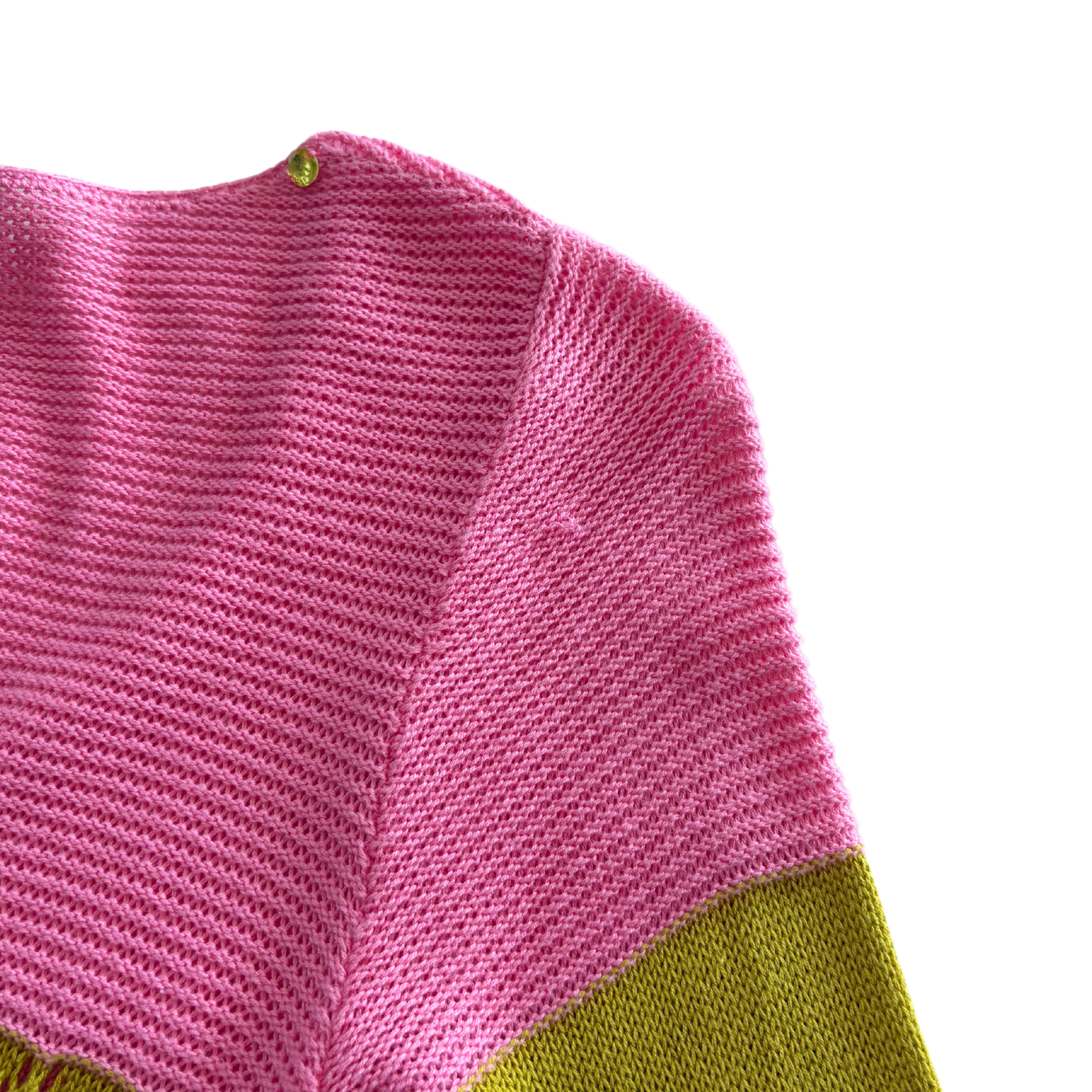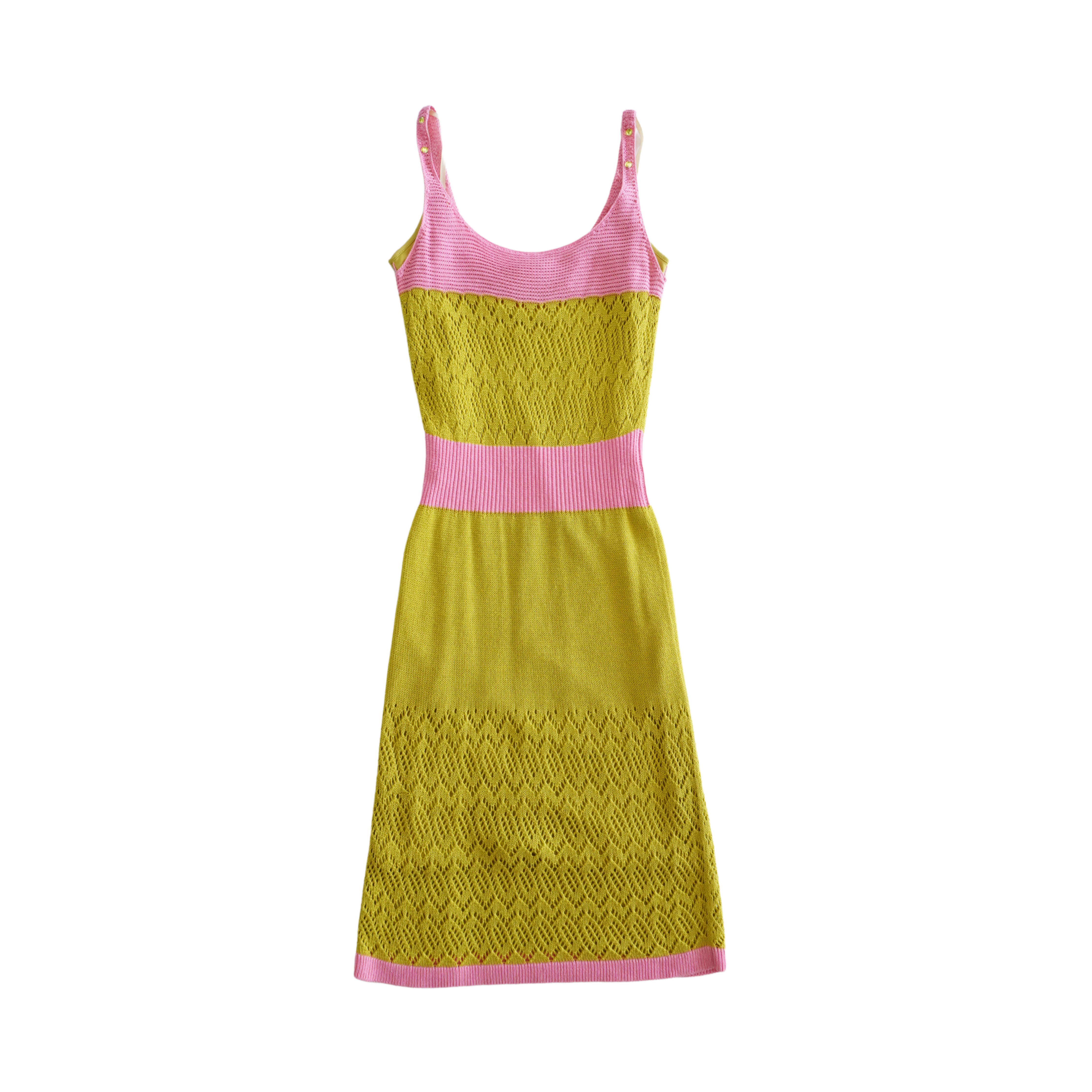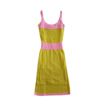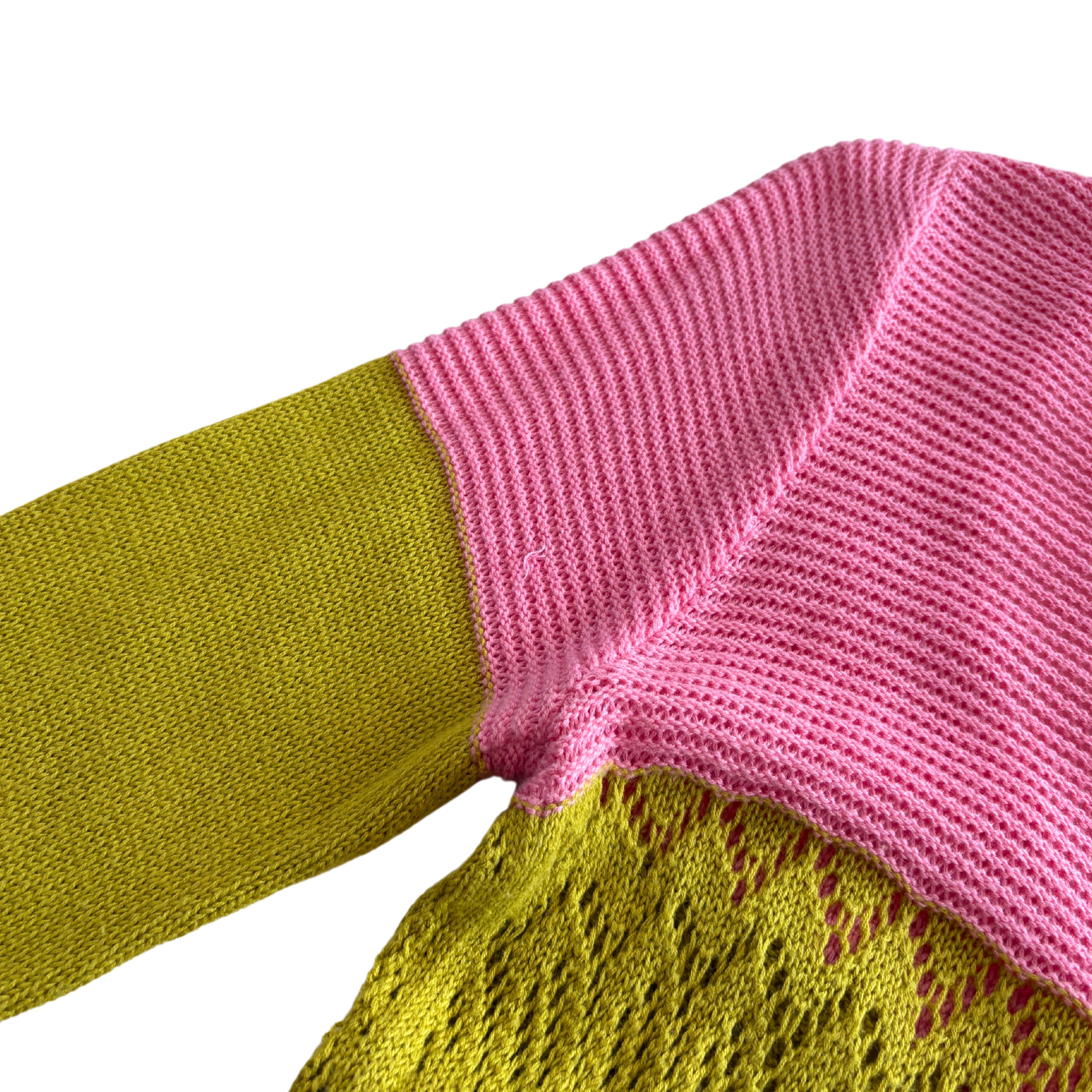 Betsey Johnson two-piece knit set in pink and chartreuse green knit cotton. The set includes a long-sleeved, button-down cardigan top with rhinestone embellishments around the neckline and pearl buttons, and a matching knit midi dress.