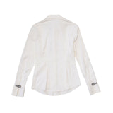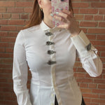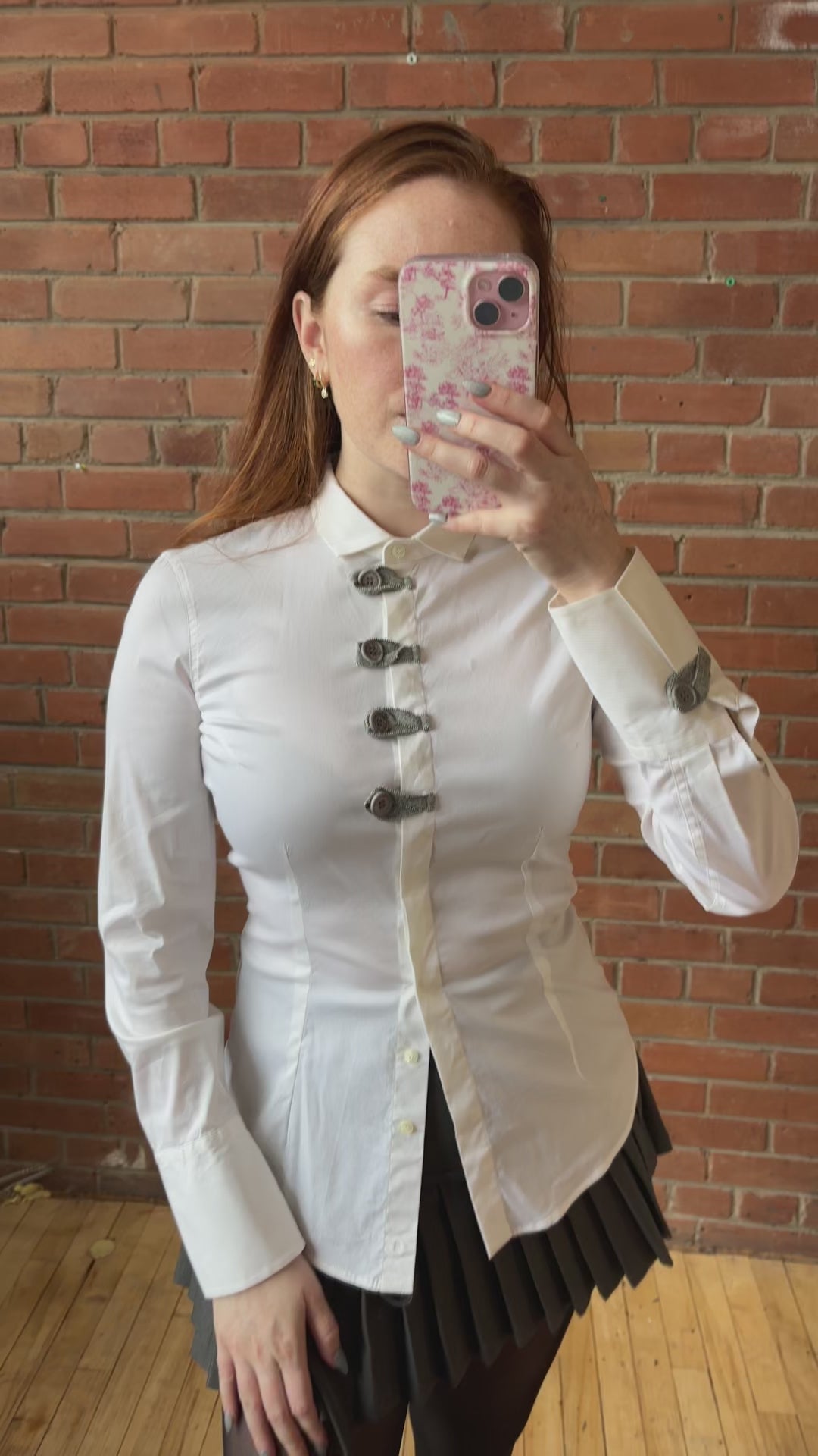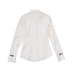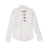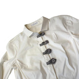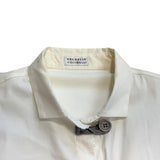 Brunello Cucinelli blouse top in white cotton with a hidden front-button closure and a grey cotton beaded latch closures on the chest and sleeves.