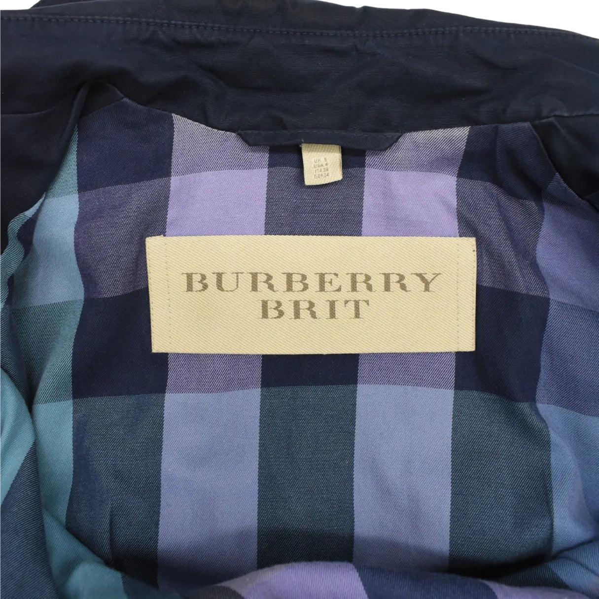 Burberry Brit Trench Jacket in navy blue cotton with a double-breasted button-down closure in black hardware. Features a latch collar and clip closure with a belted waistband, open side pockets and purple nova check lining.