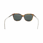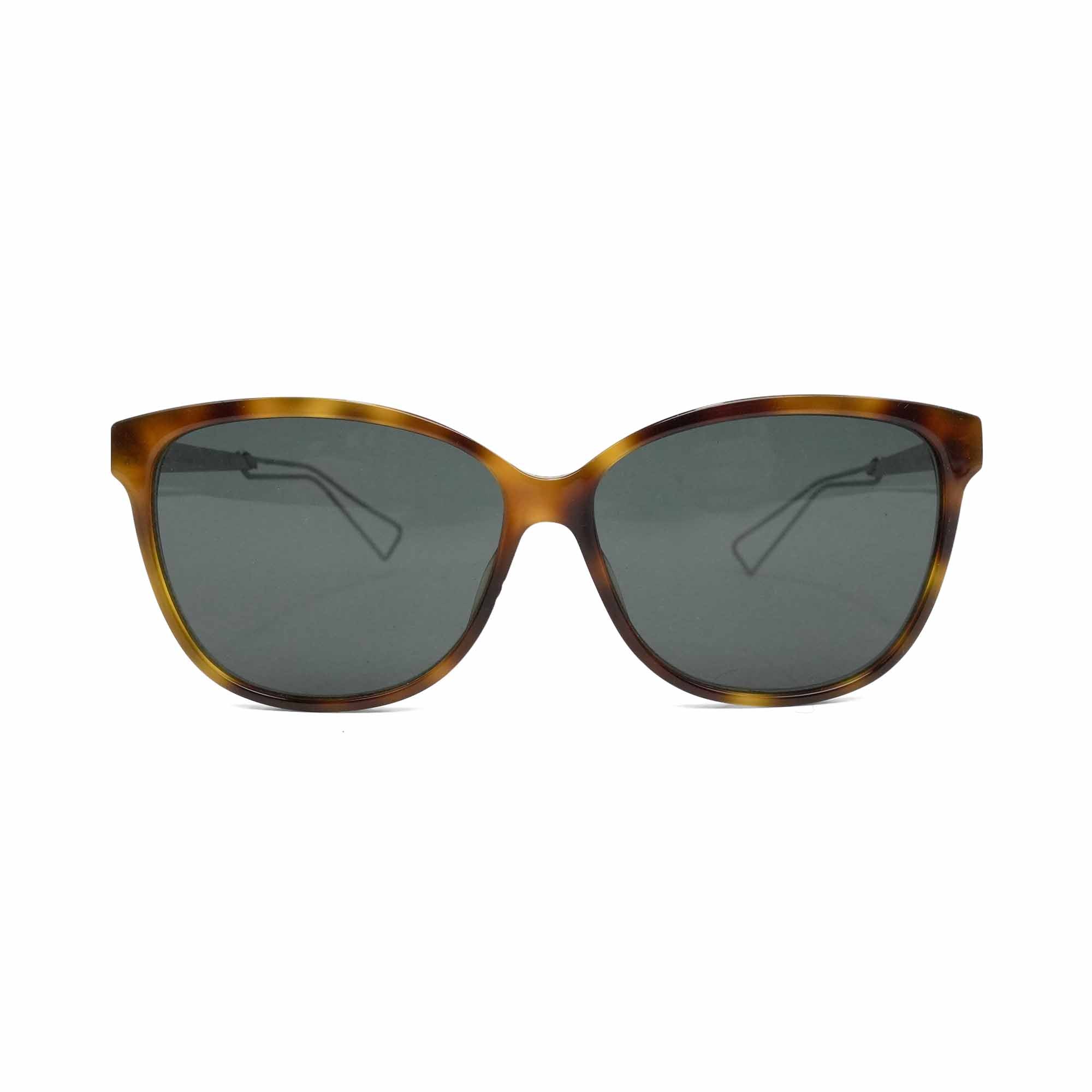 Christian Dior 'Confident2' wayfarer style sunglasses with tortoiseshell frames with small CD logo on top of nose bridge, grey lenses, and silver and black arms with small Dior logo.