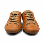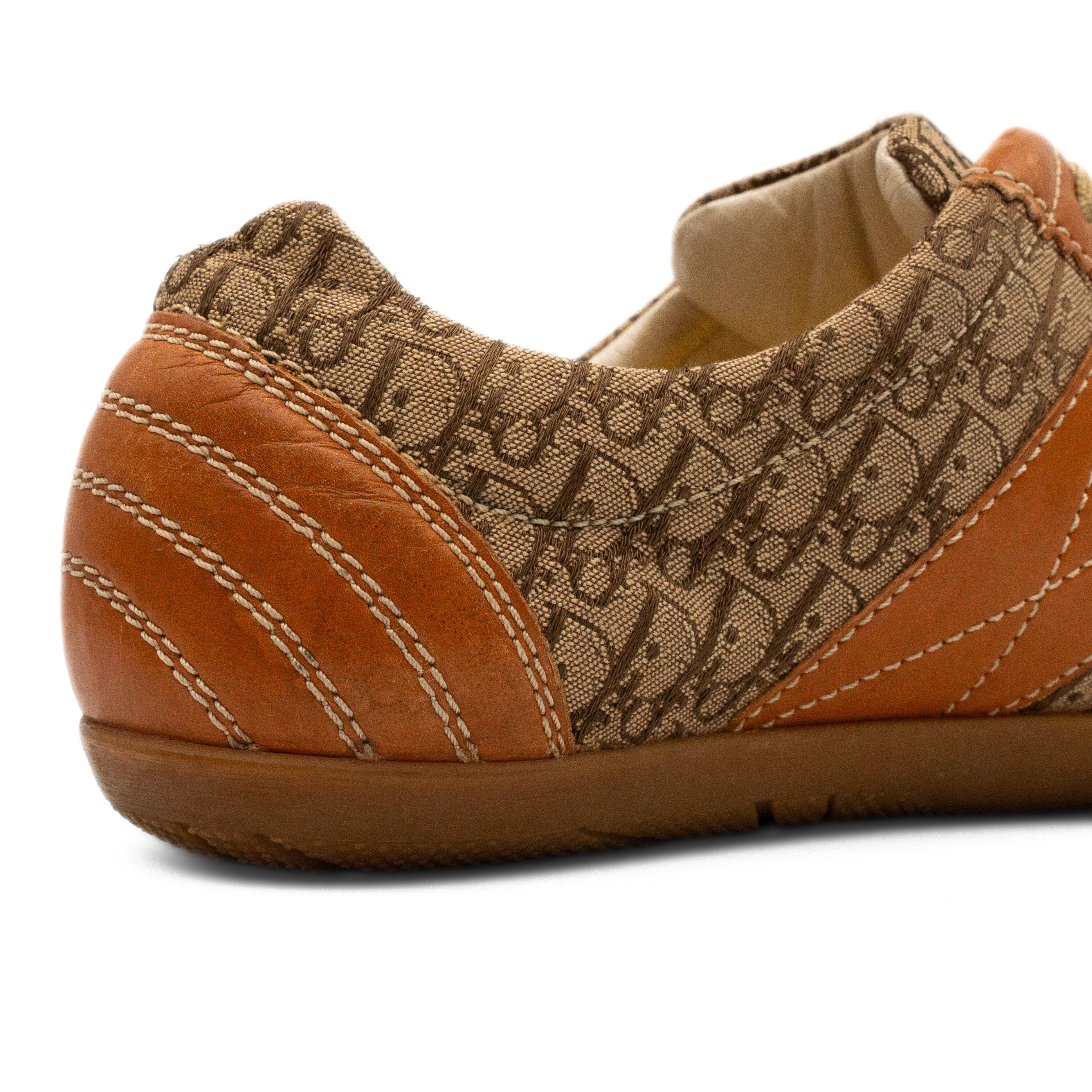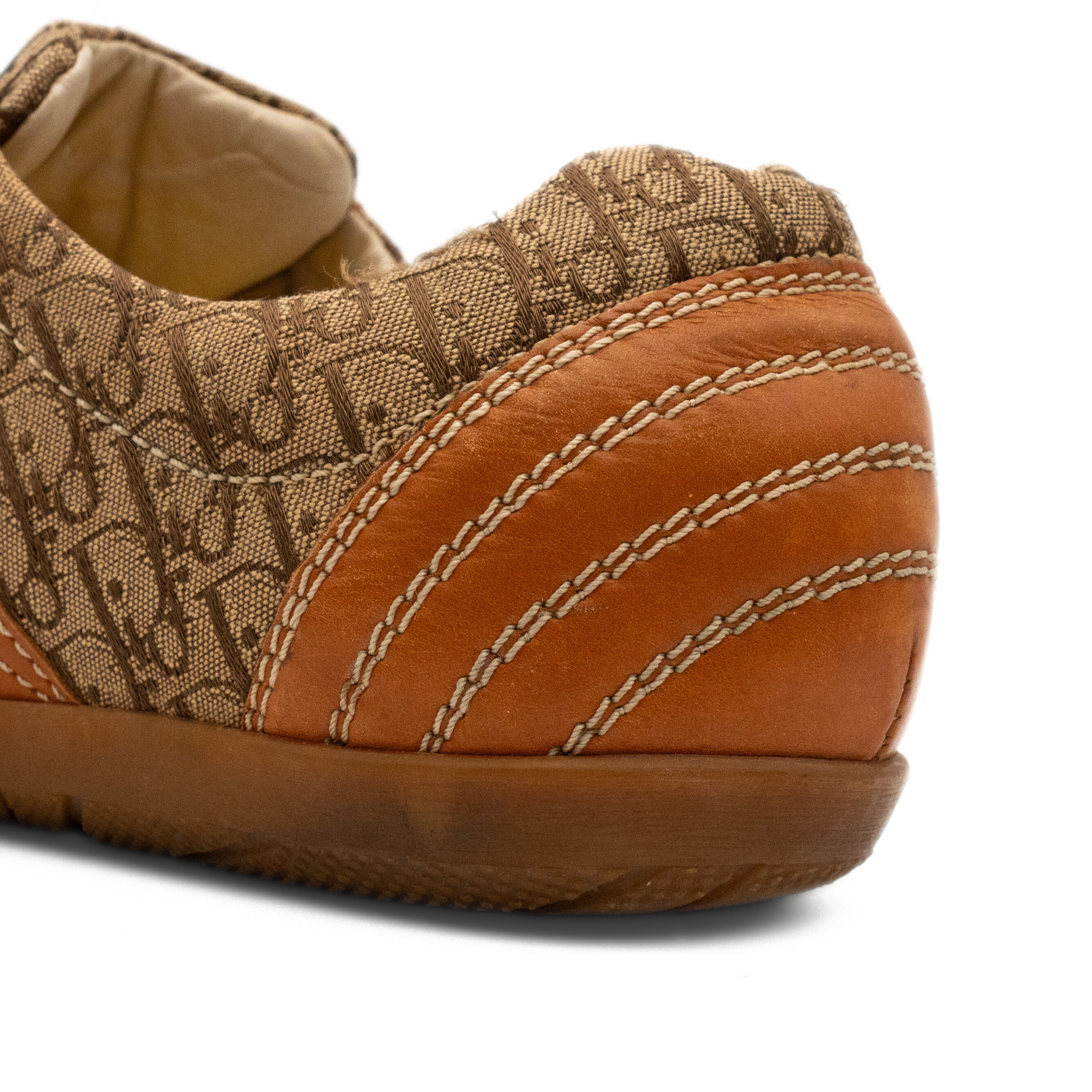 Christian Dior vintage sneakers in beige diorissimo printed canvas with tan brown leather panels throughout, beige laces, and a flat sole.