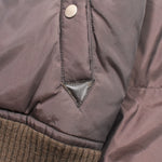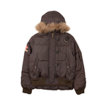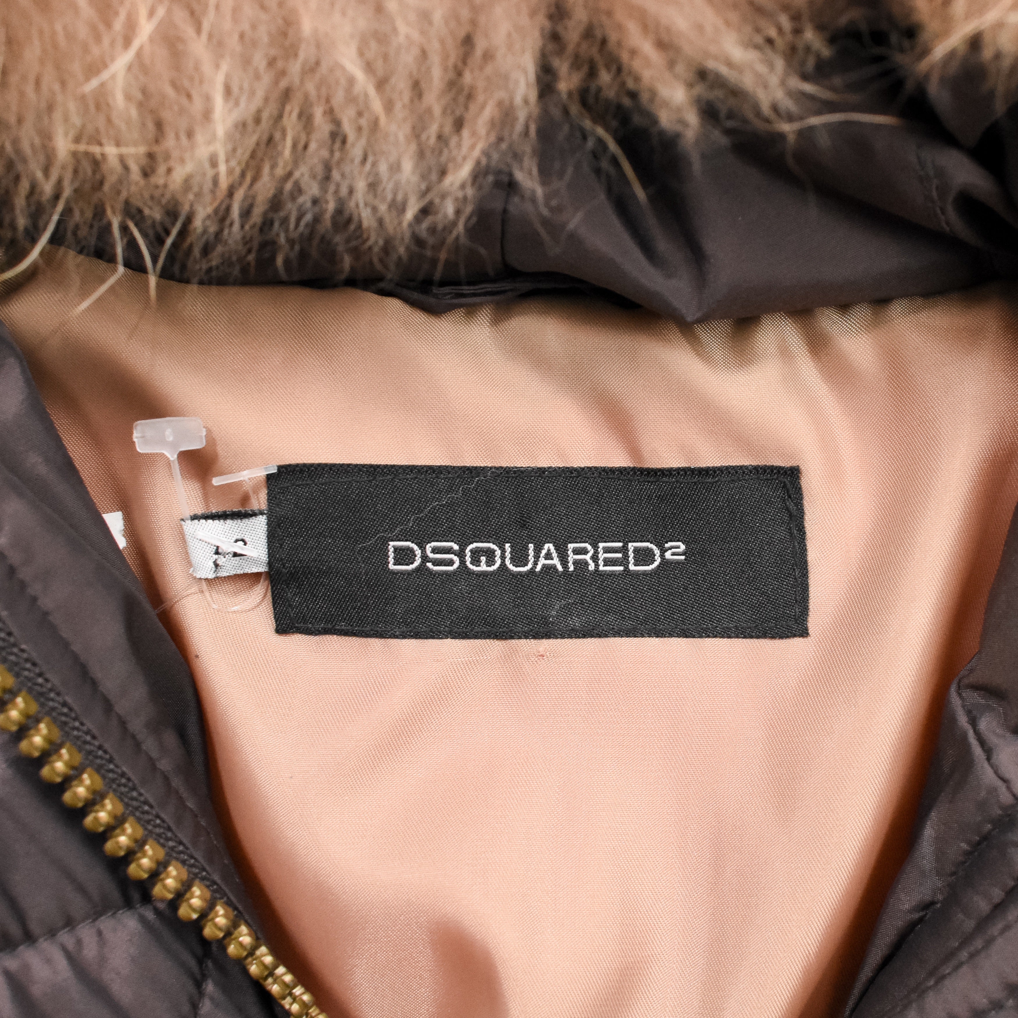 DSquared2 bomber style puffer jacket in brown nylon with a front zip opening in gold hardware, front toggle buttons, pocket and harness details throughout, and a fur trim hood.