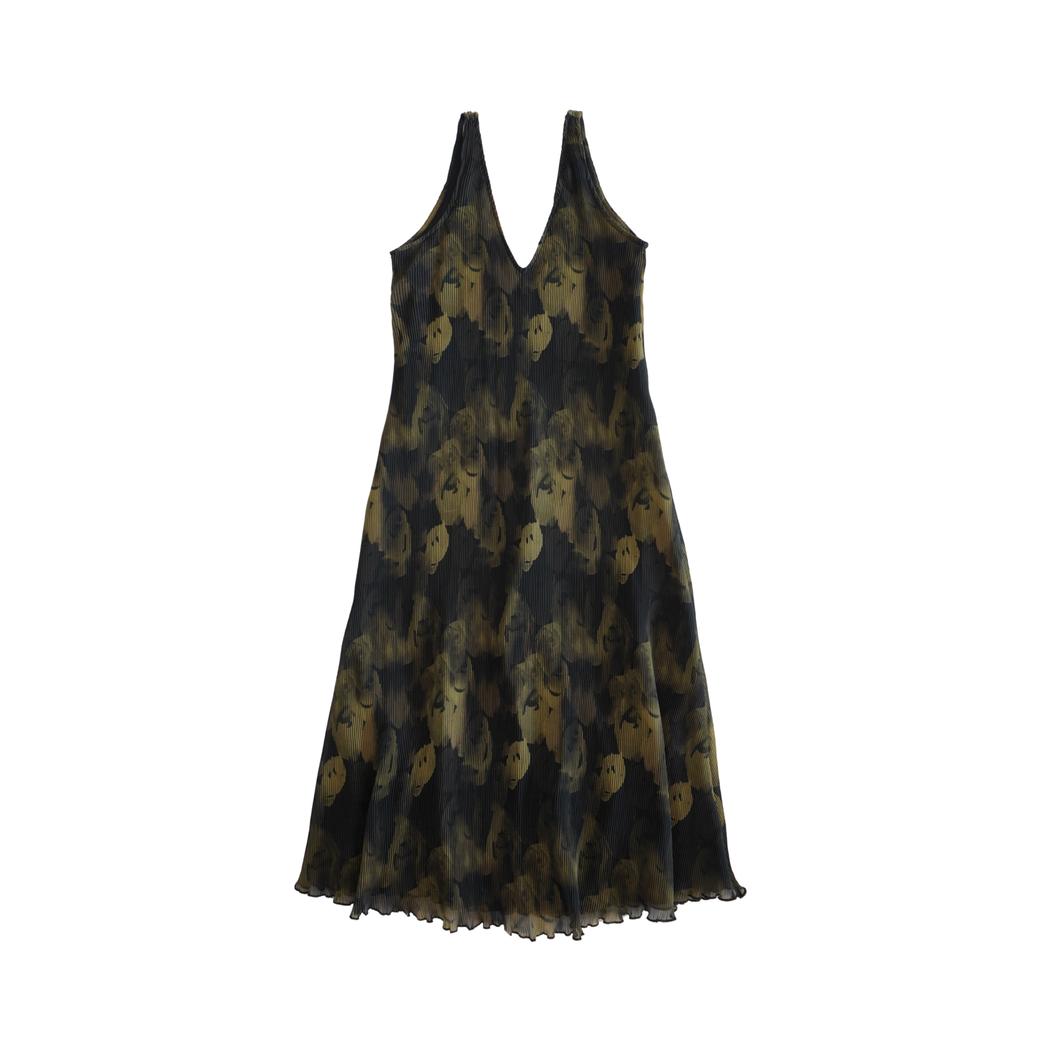 Ganni mid-length micro pleated dress in black and green abstract floral print with V-neck and back.