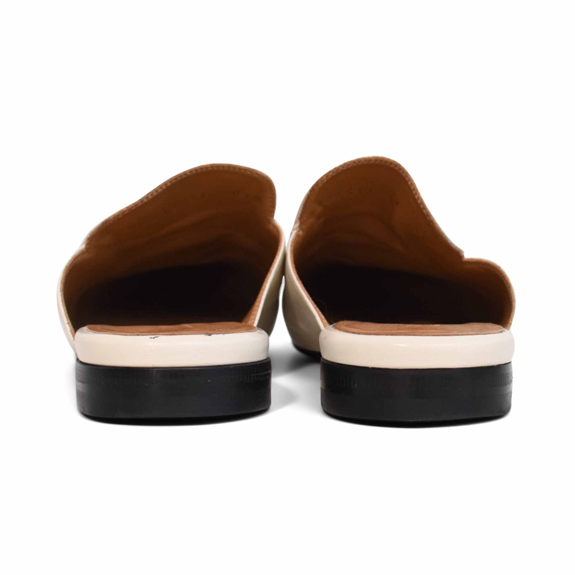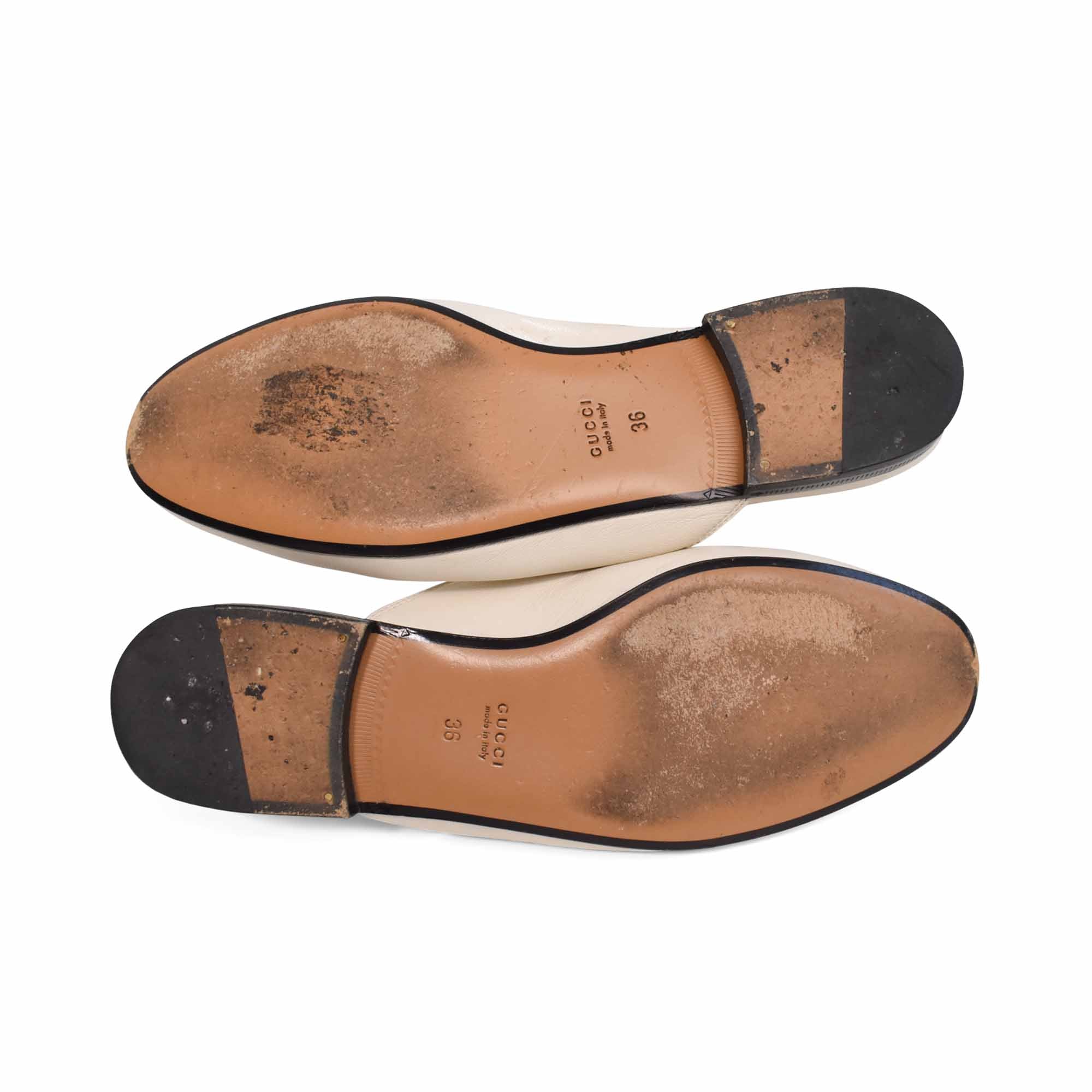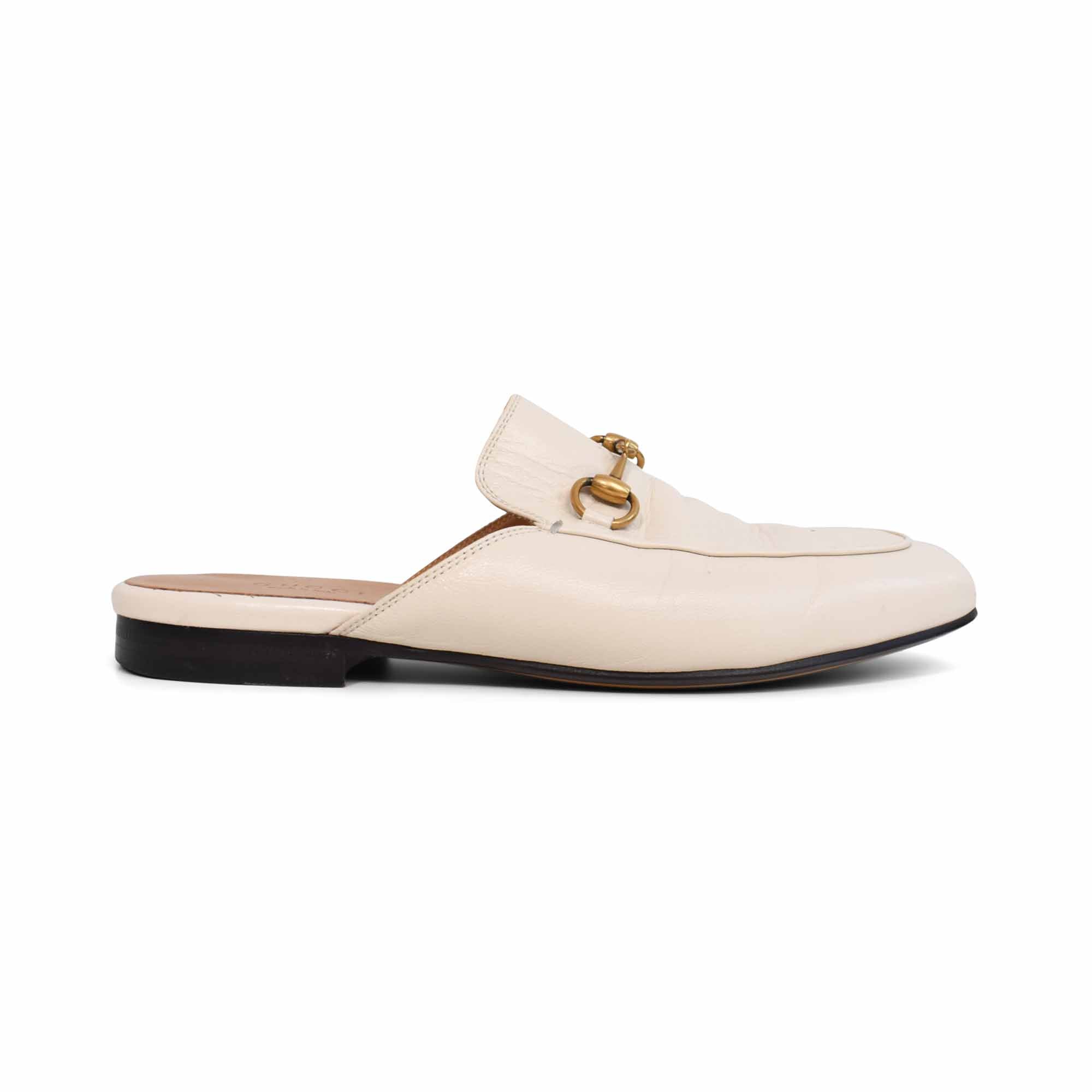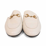 Gucci 'Princetown' slip on, flat mules in cream leather with a gold tone horsebit on front.