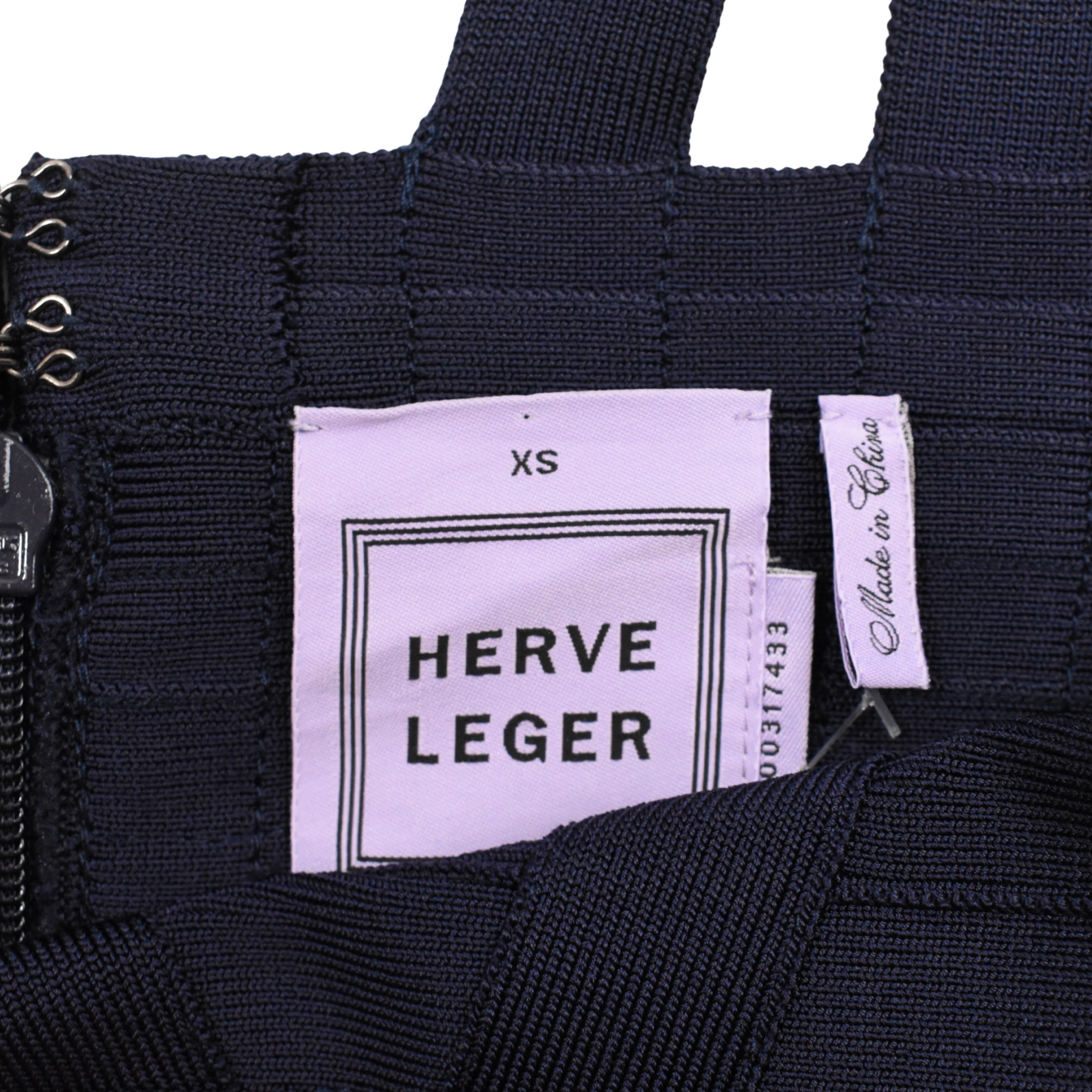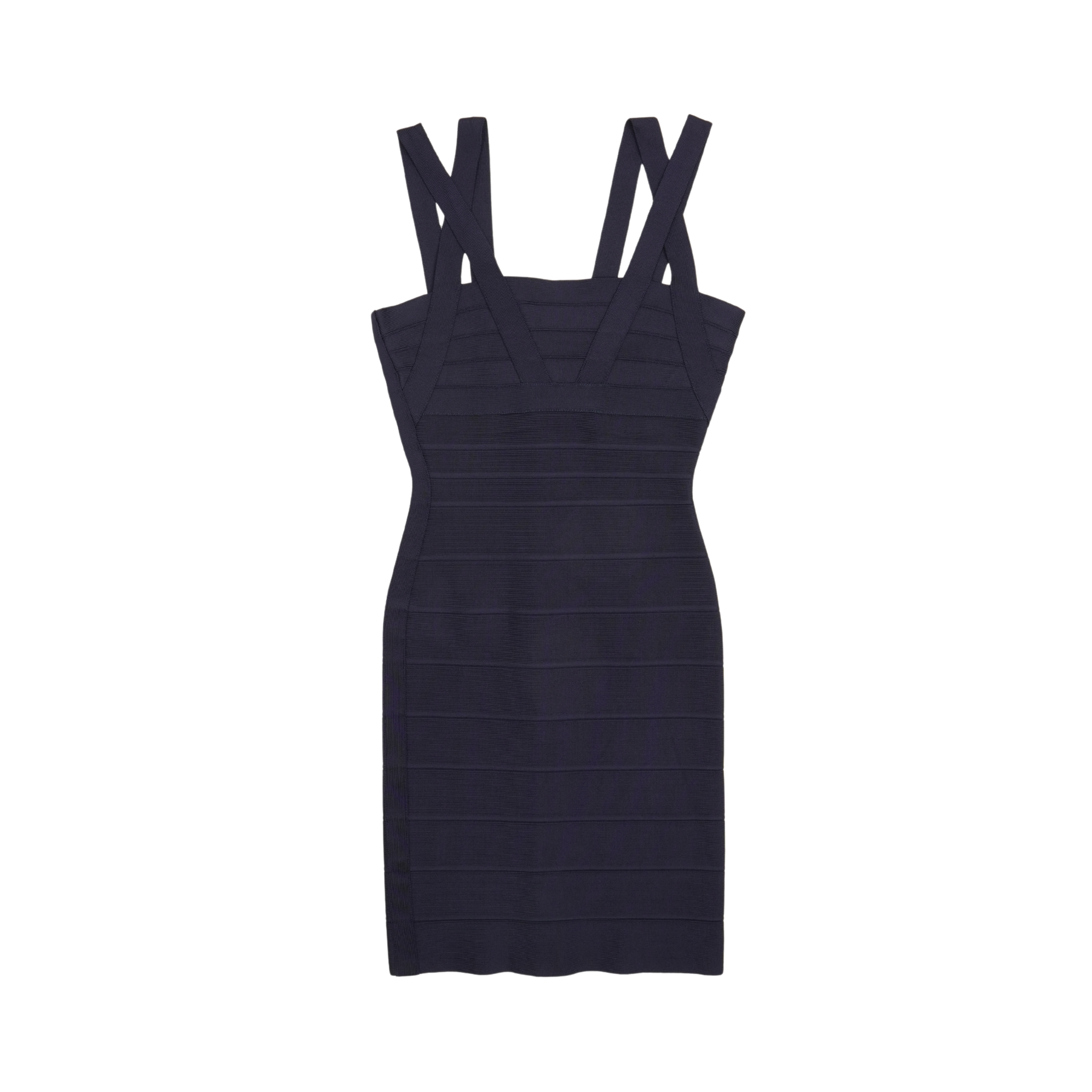 Herve Leger bandage dress in navy stretch rayon with bandage panelling throughout, crossed shoulder straps, and a back zip opening in navy hardware.