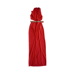 Just Cavalli maxi dress in red with a cutout at the waist, a deep v-neckline, a ruffle down the centre of the dress, and a gold triangle stud belt.