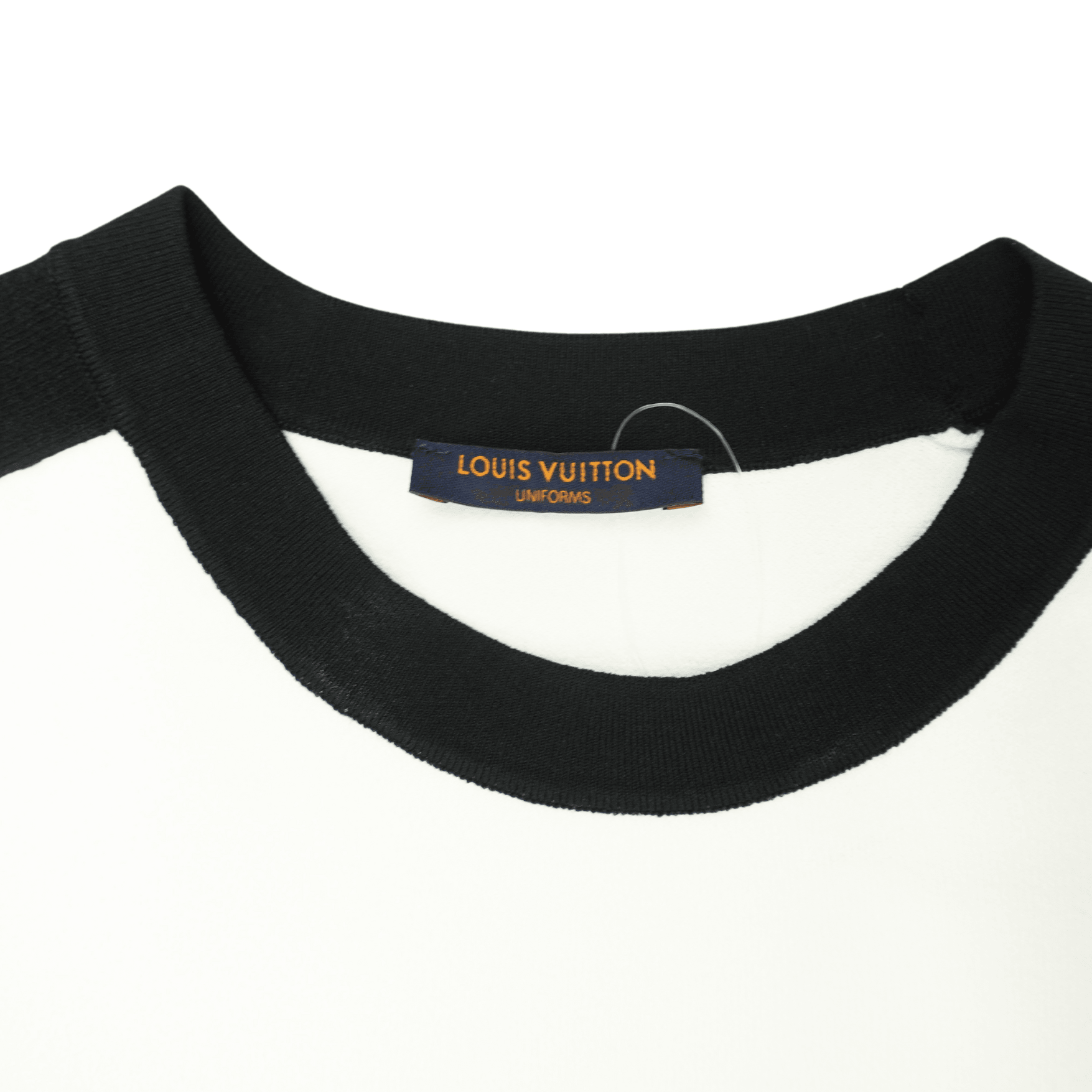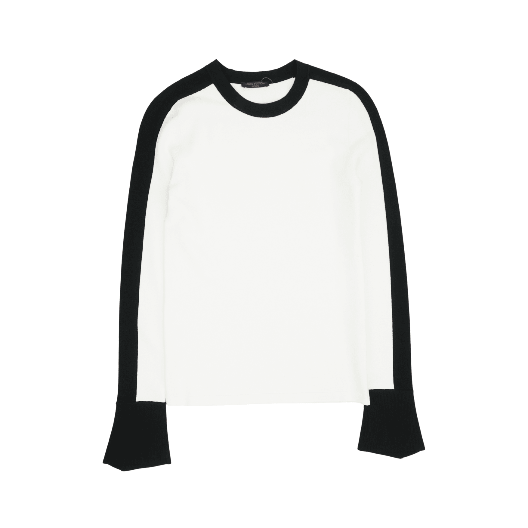 Louis Vuitton Uniform Top in white stretch knit with a black trim on the sleeves and neckline. Features flare arm detail with a slip.
