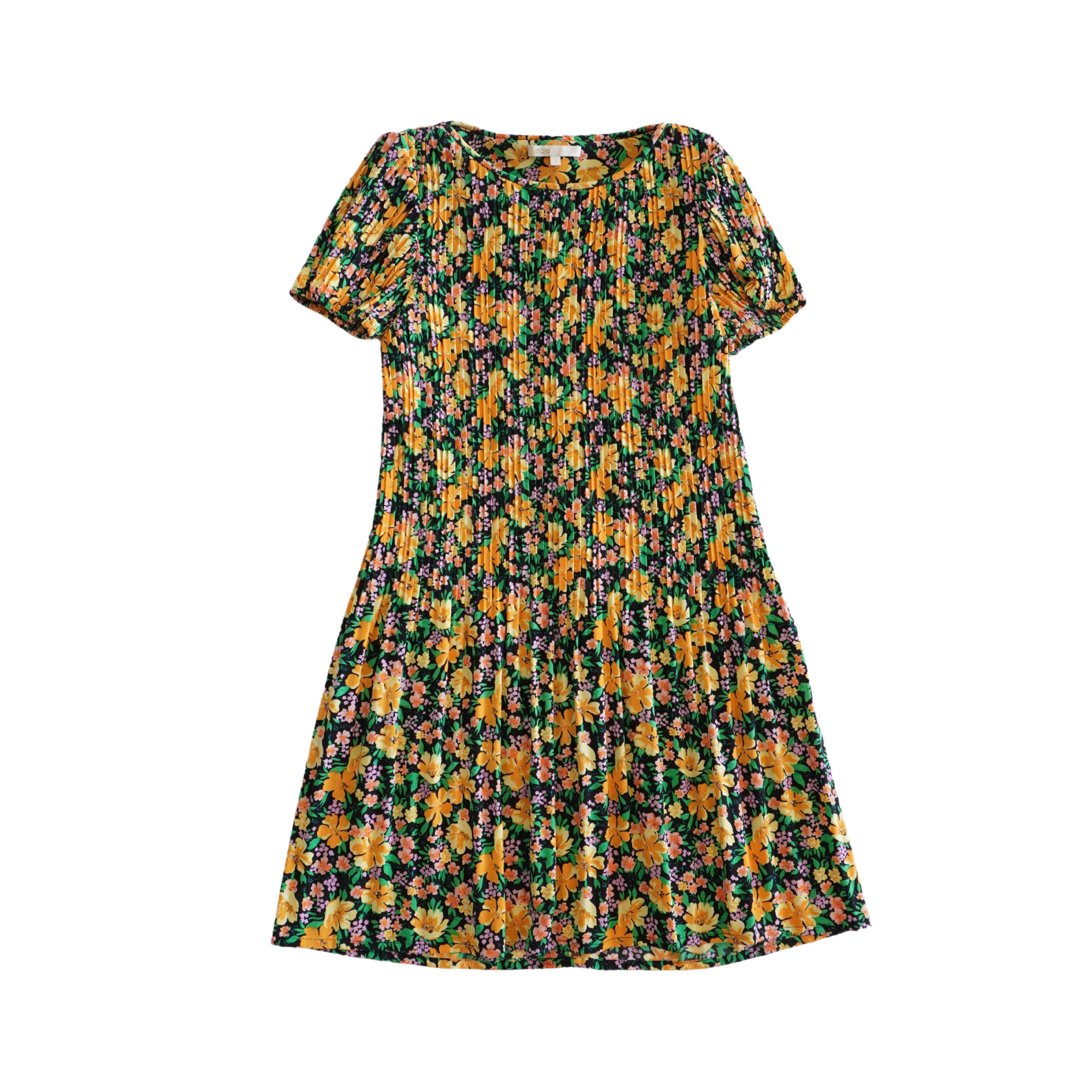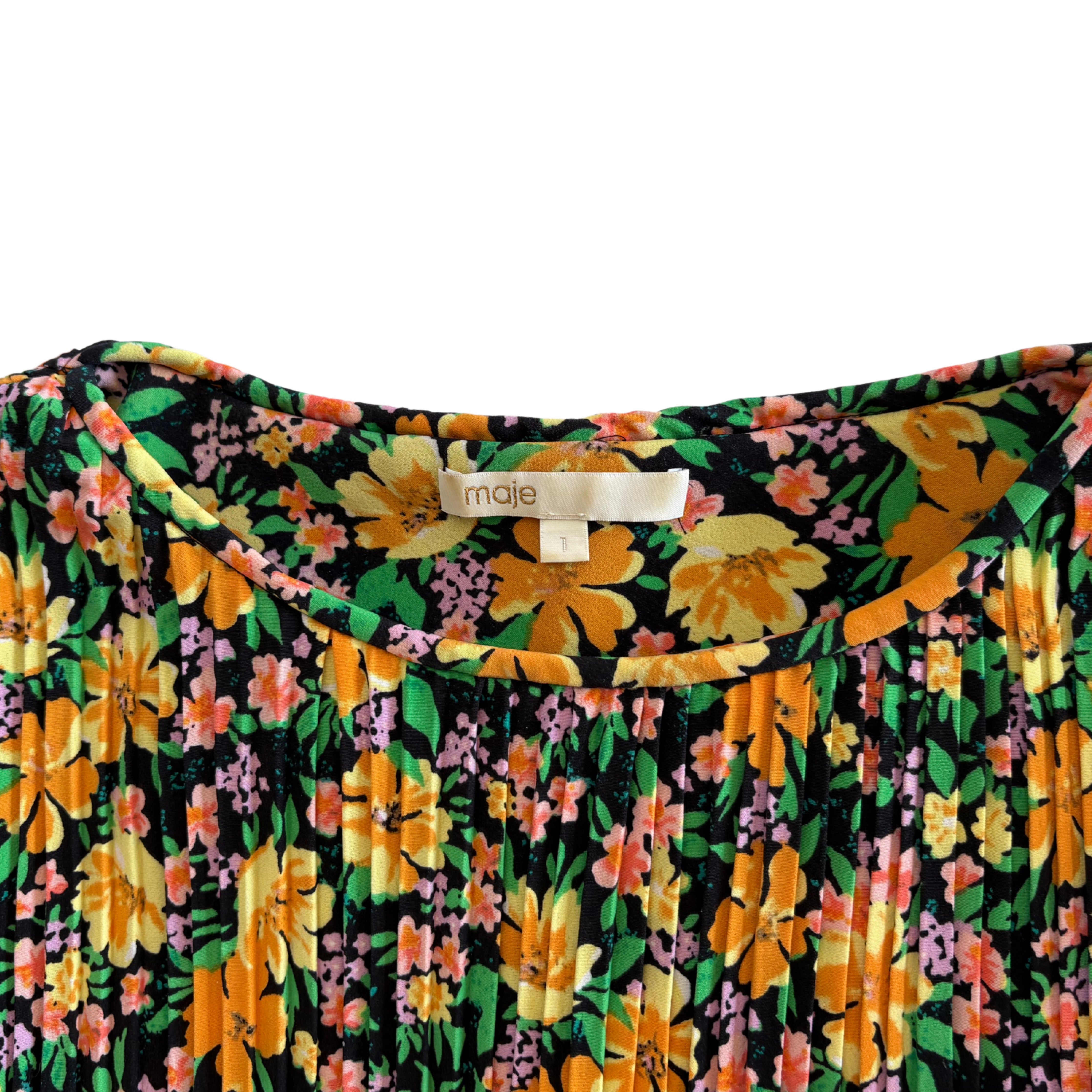Maje 'Rockinie' floral pleated mini dress with short puff sleeves and dropped waist with a-line skirt.