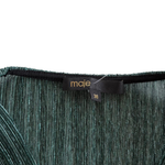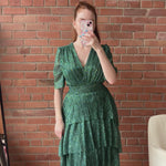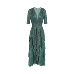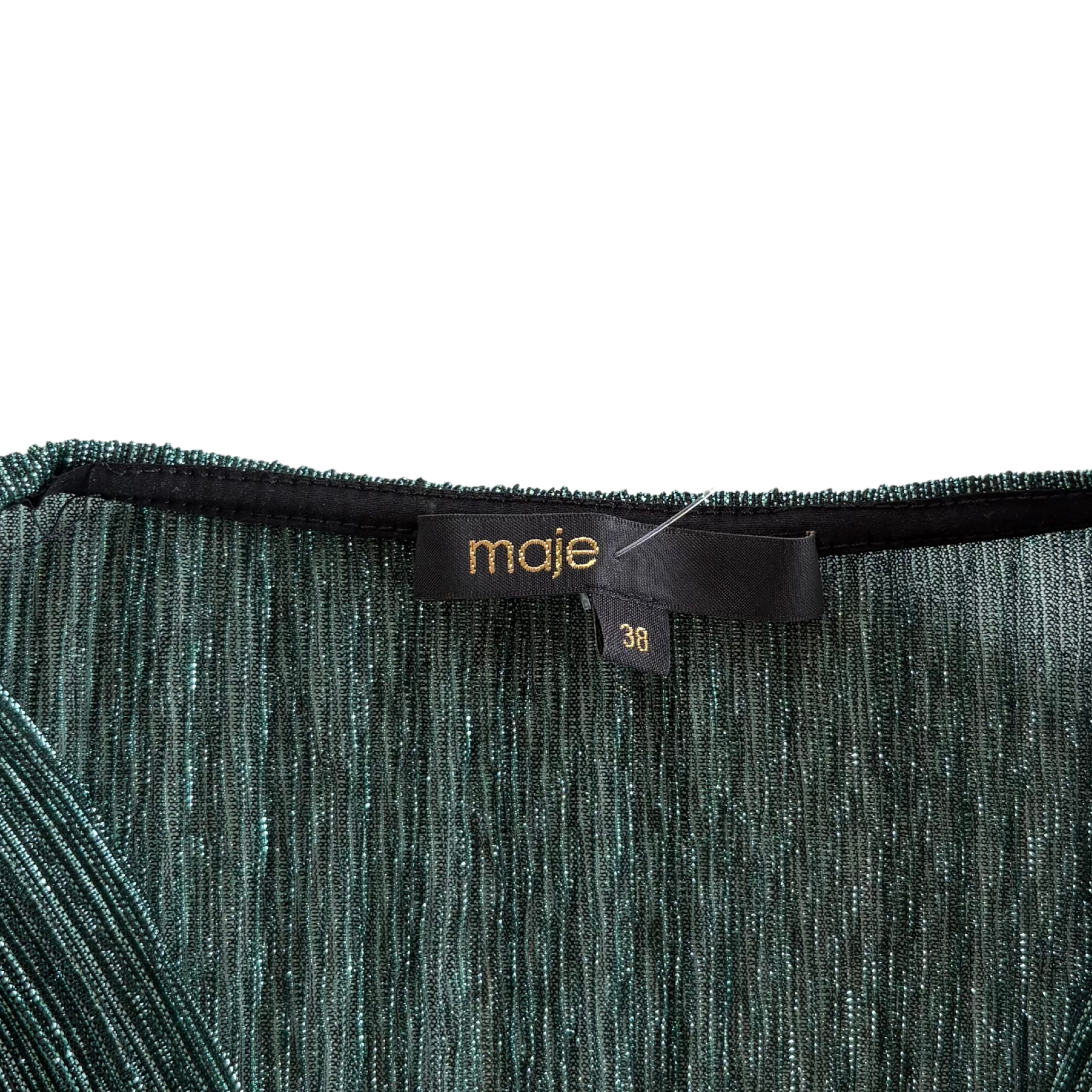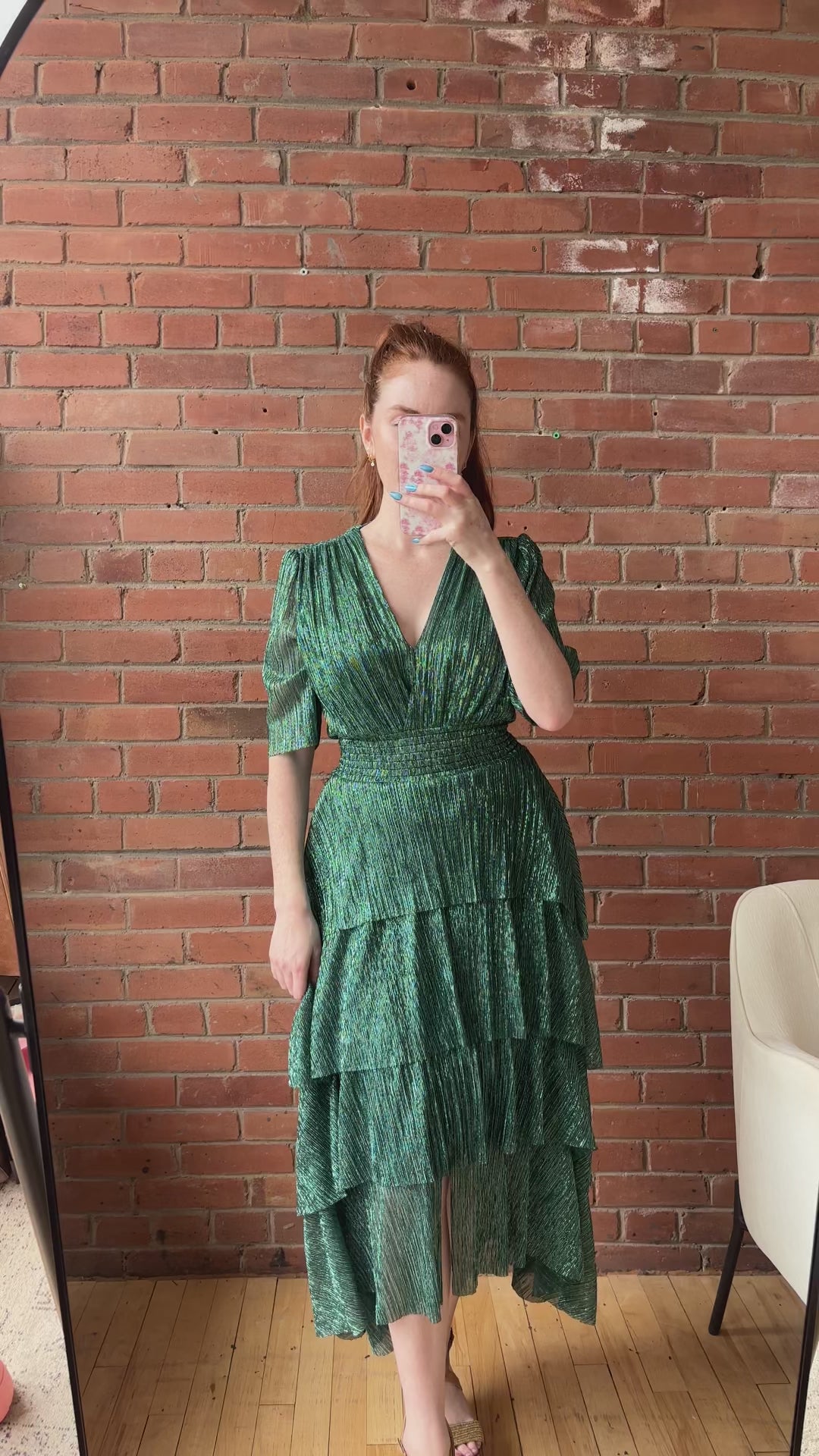 Maje midi dress in a green metallic polyester blend with a tiered ruffle skirt, elastic cinched waistband and wrap v-neckline and an asymmetrical hem.
