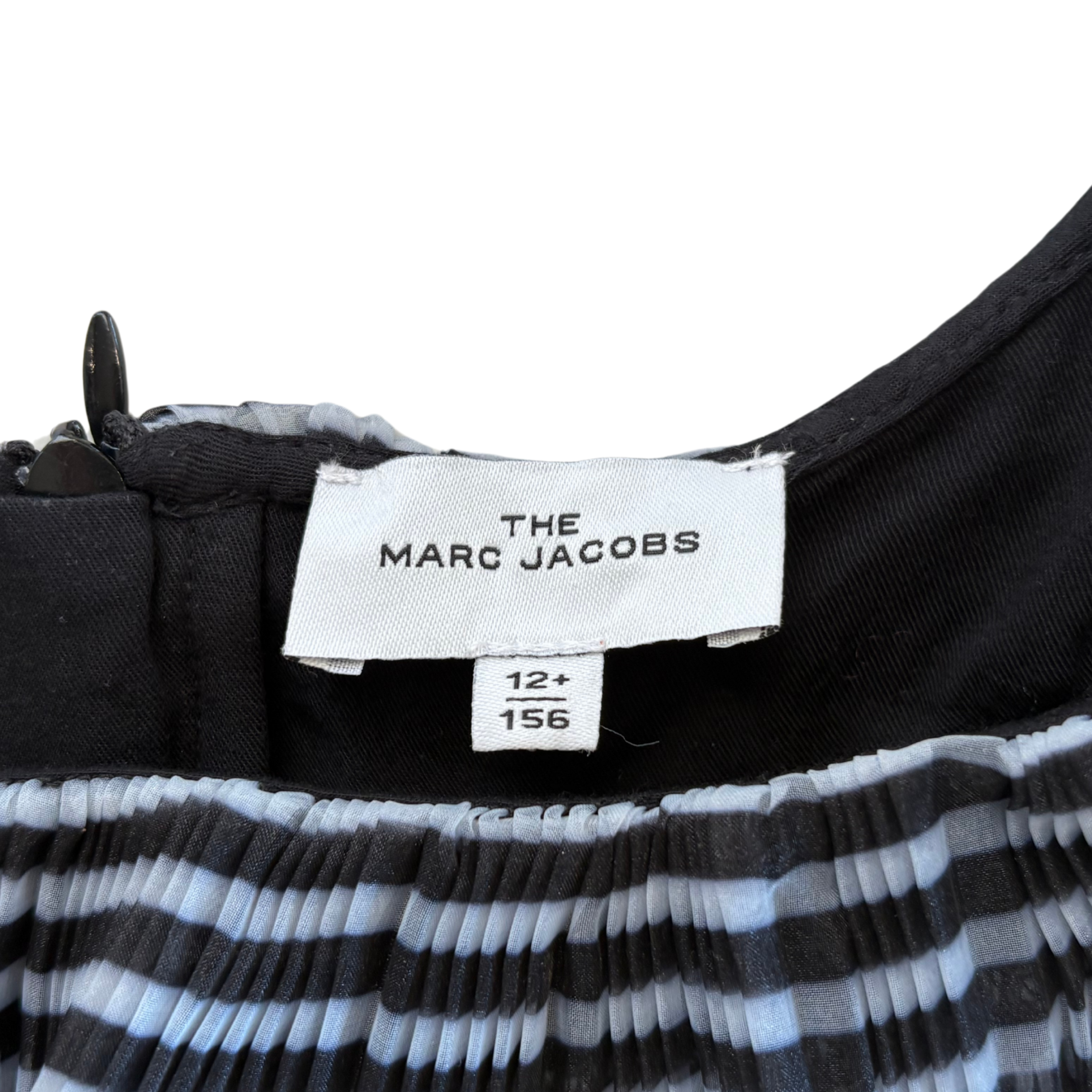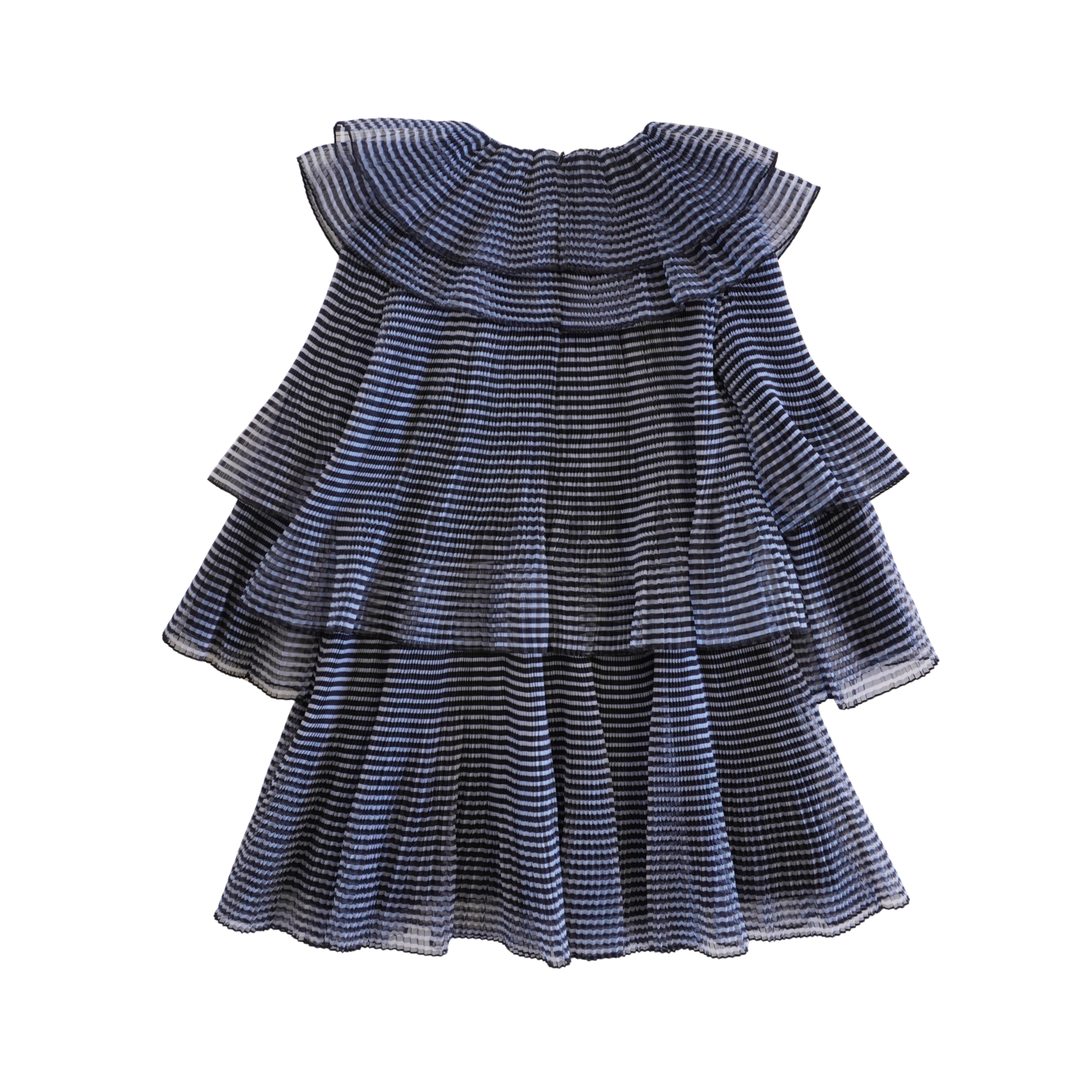 The Marc Jacobs tiered dress in black and blue pleated striped chiffon with layered collar and sleeves.