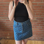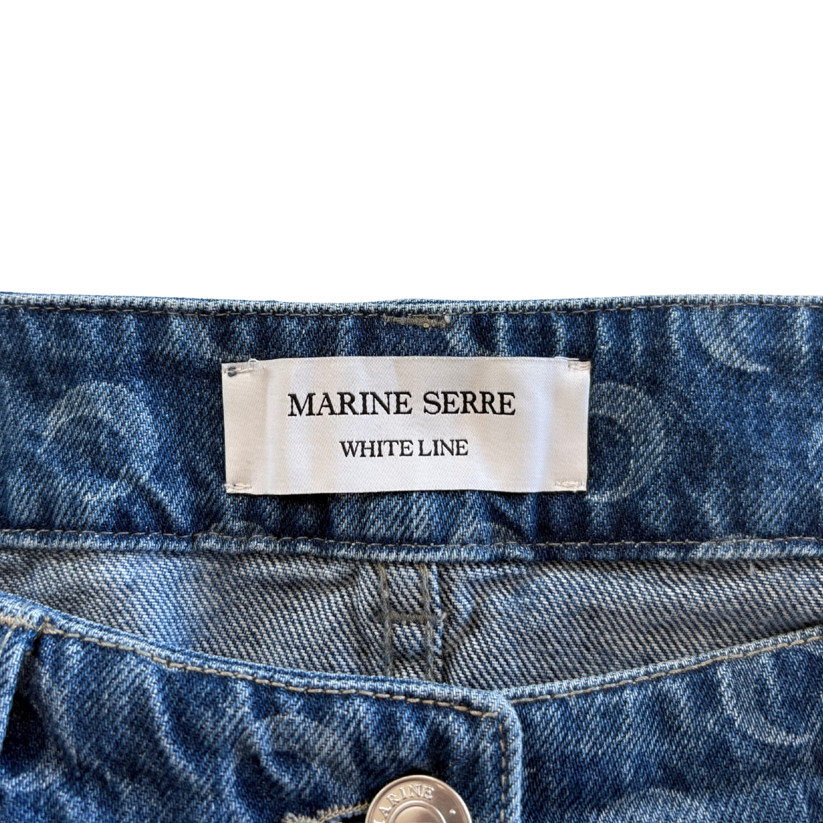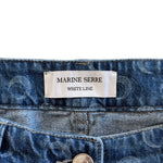 Marine Serre White Line 'Moon Laser' mini skirt with signature crescent moon print denim with angle side seams and leather logo patch on the back.