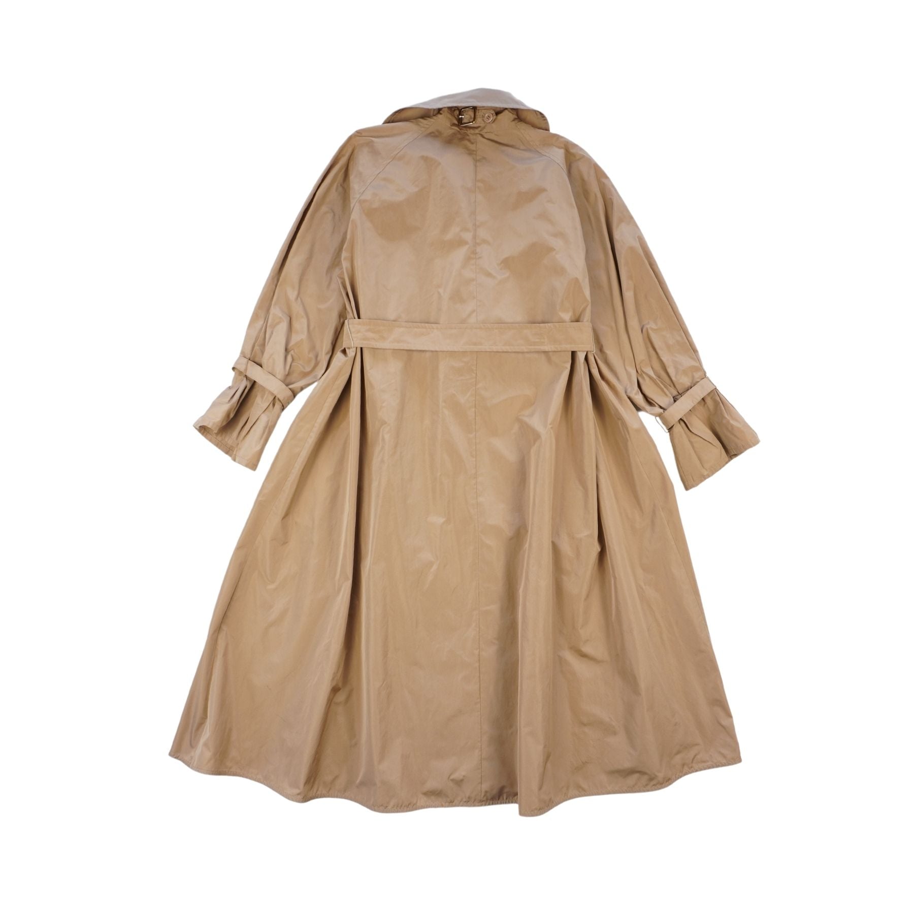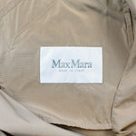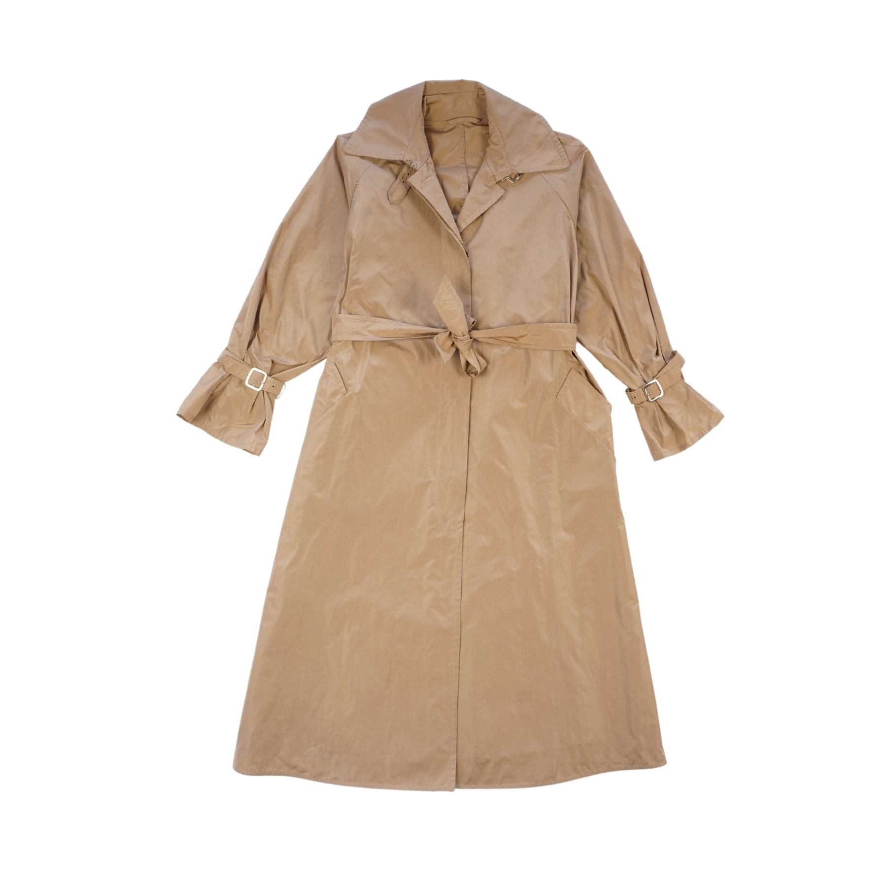 Max Mara full length beige trench coat with an a-line silhouette and flared cuffs. Features gold buckles and hidden buttons down the front.