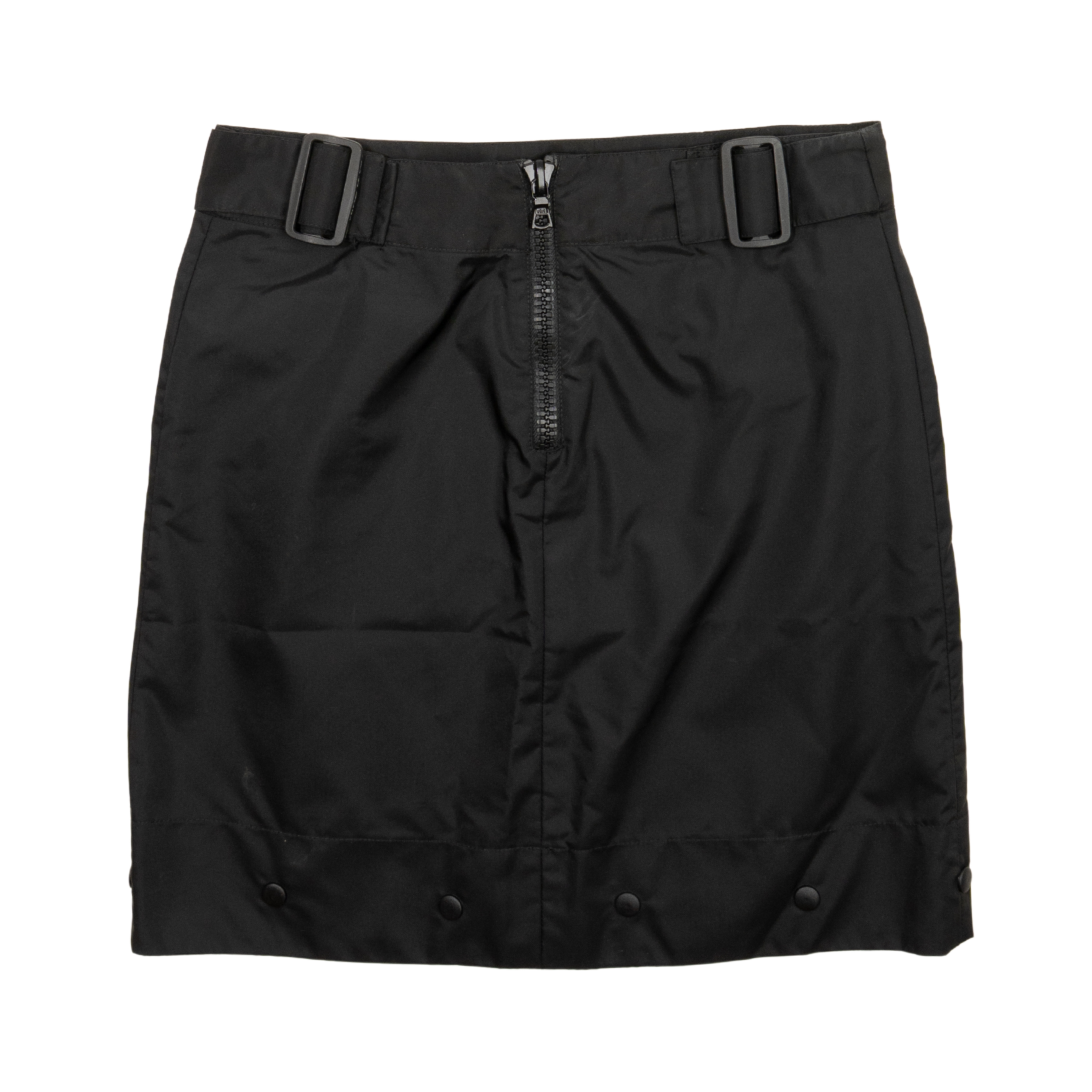 Miu Miu mid length cargo skirt in black nylon. Features adjustable belt details at back waist, flap pockets on front , zip up closure in back, and button snap hem at bottom.