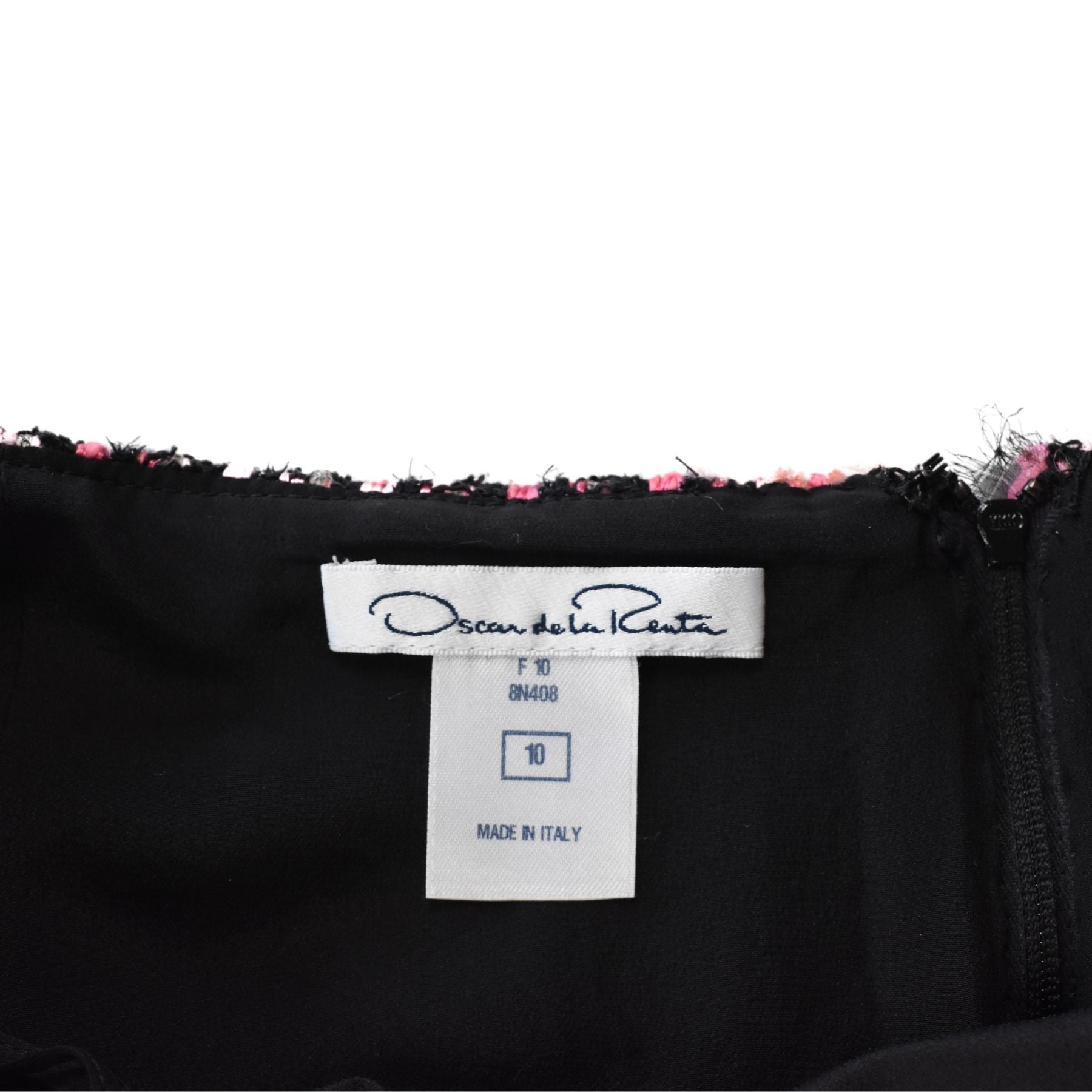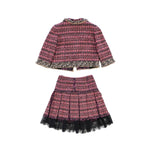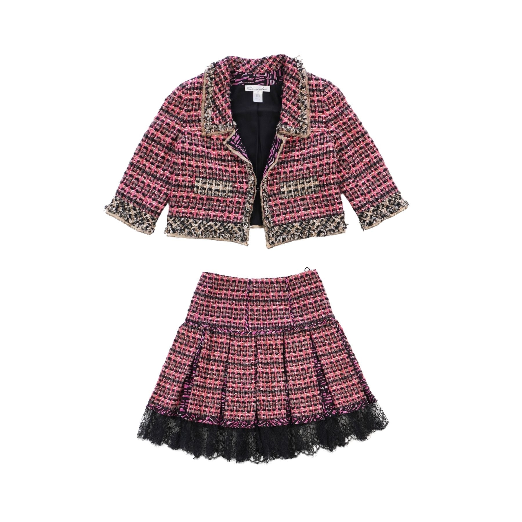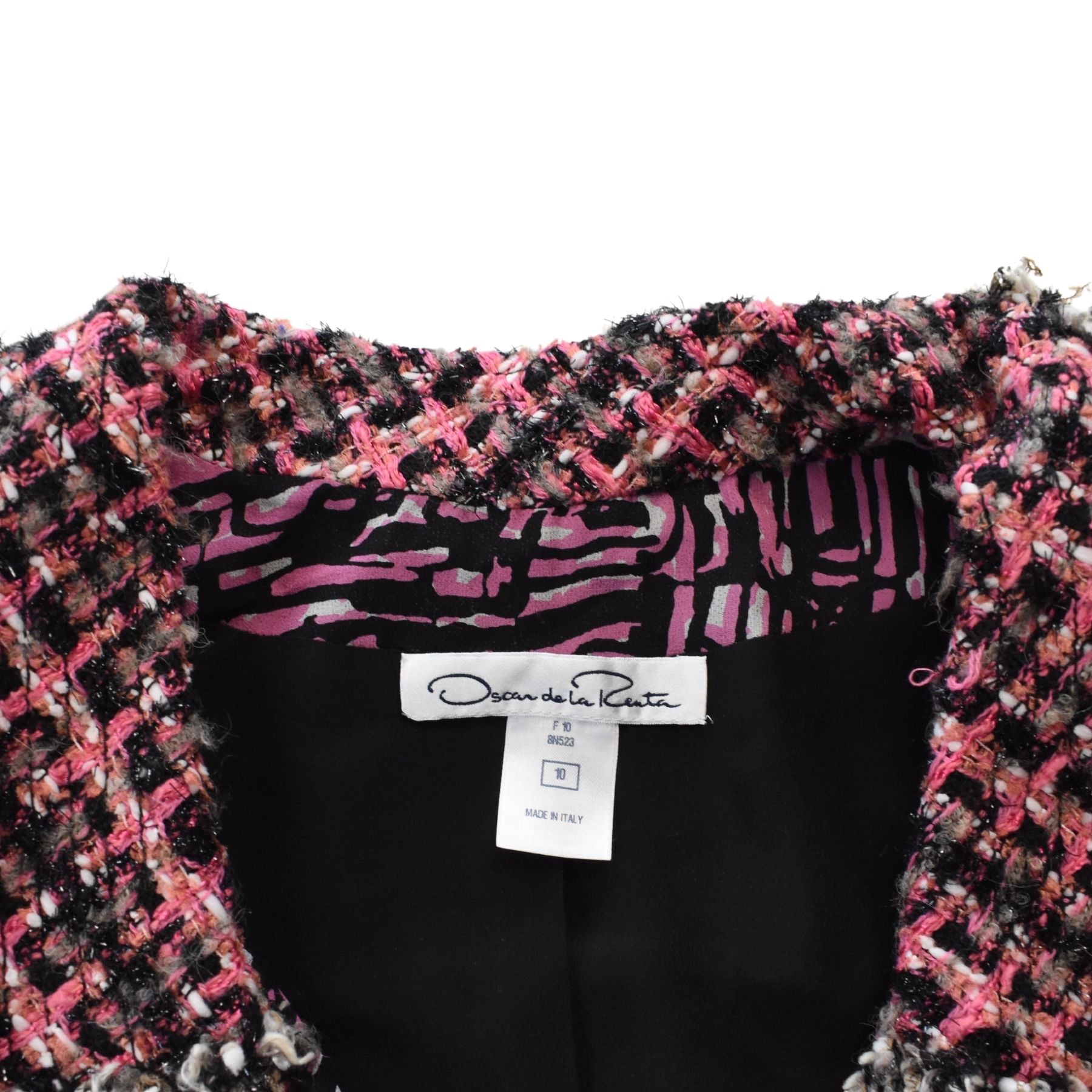 Oscar De La Renta two-piece set in pink, cream, and black tweed with a matching blazer and skirt. The blazer is cropped with 3/4 length sleeves, a notch lapel collar, a front clip closure, and a tan and black silk trim. The skirt is a pleated ruffle skirt with a thick waistband, black and pink geometric silk paneling, and a black lace trim.