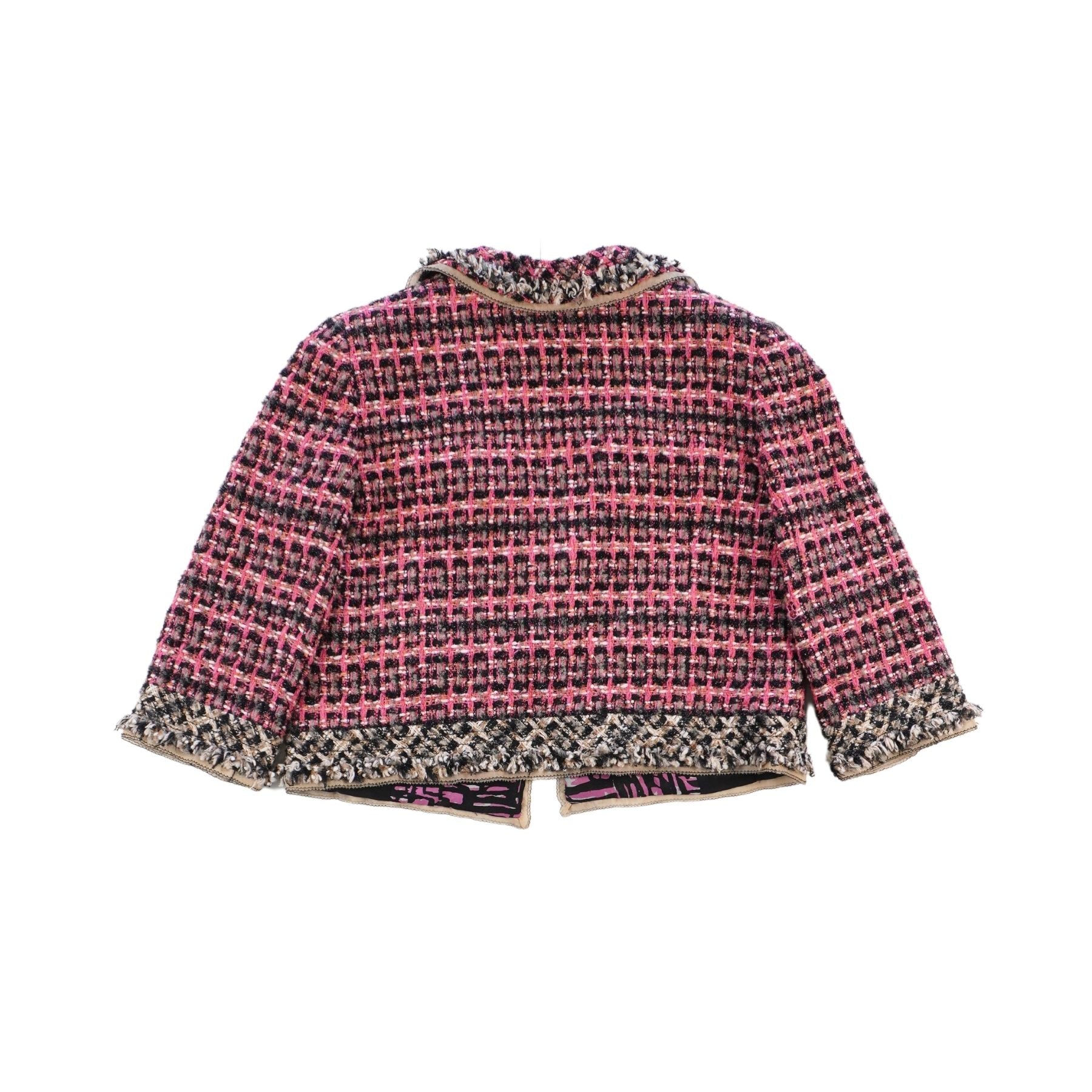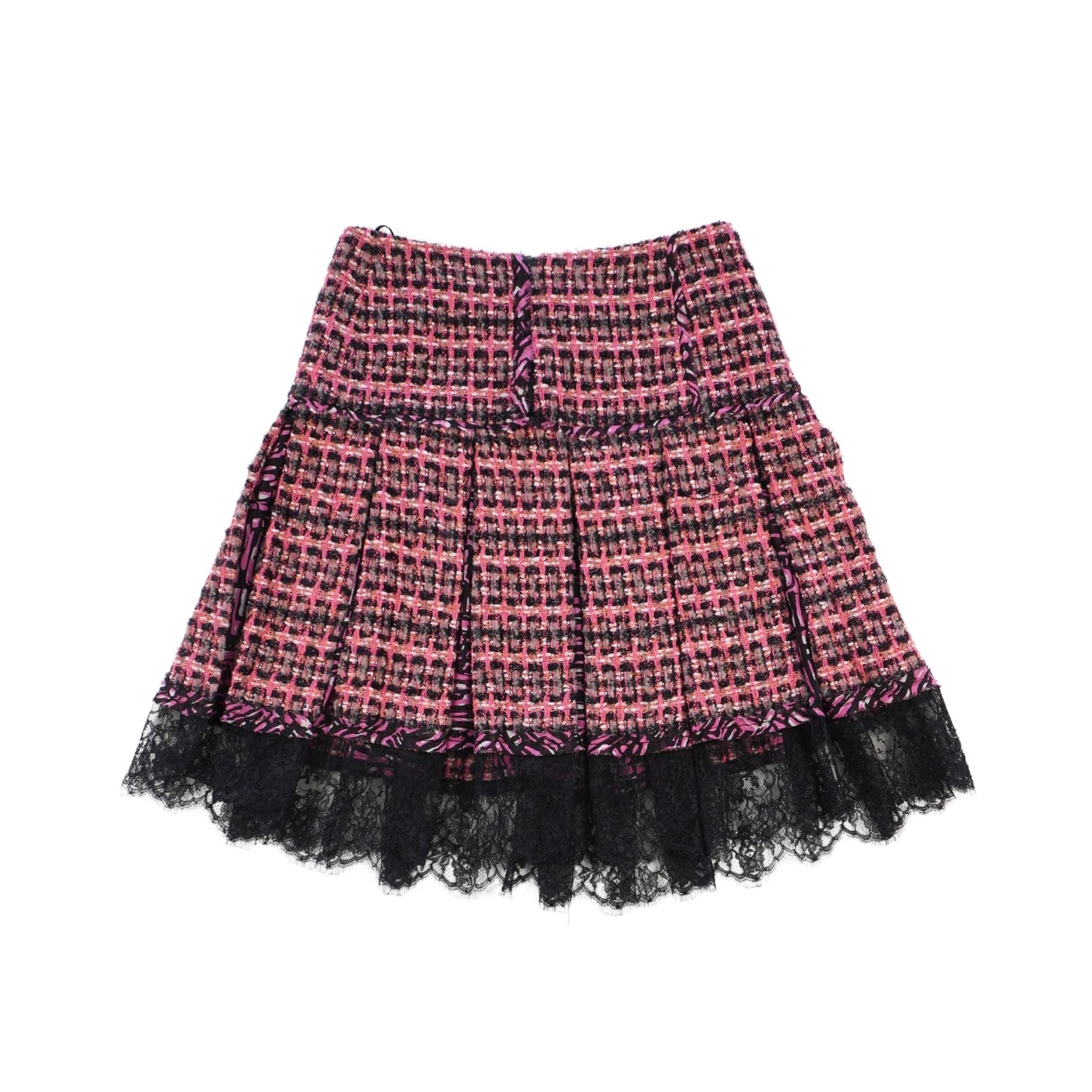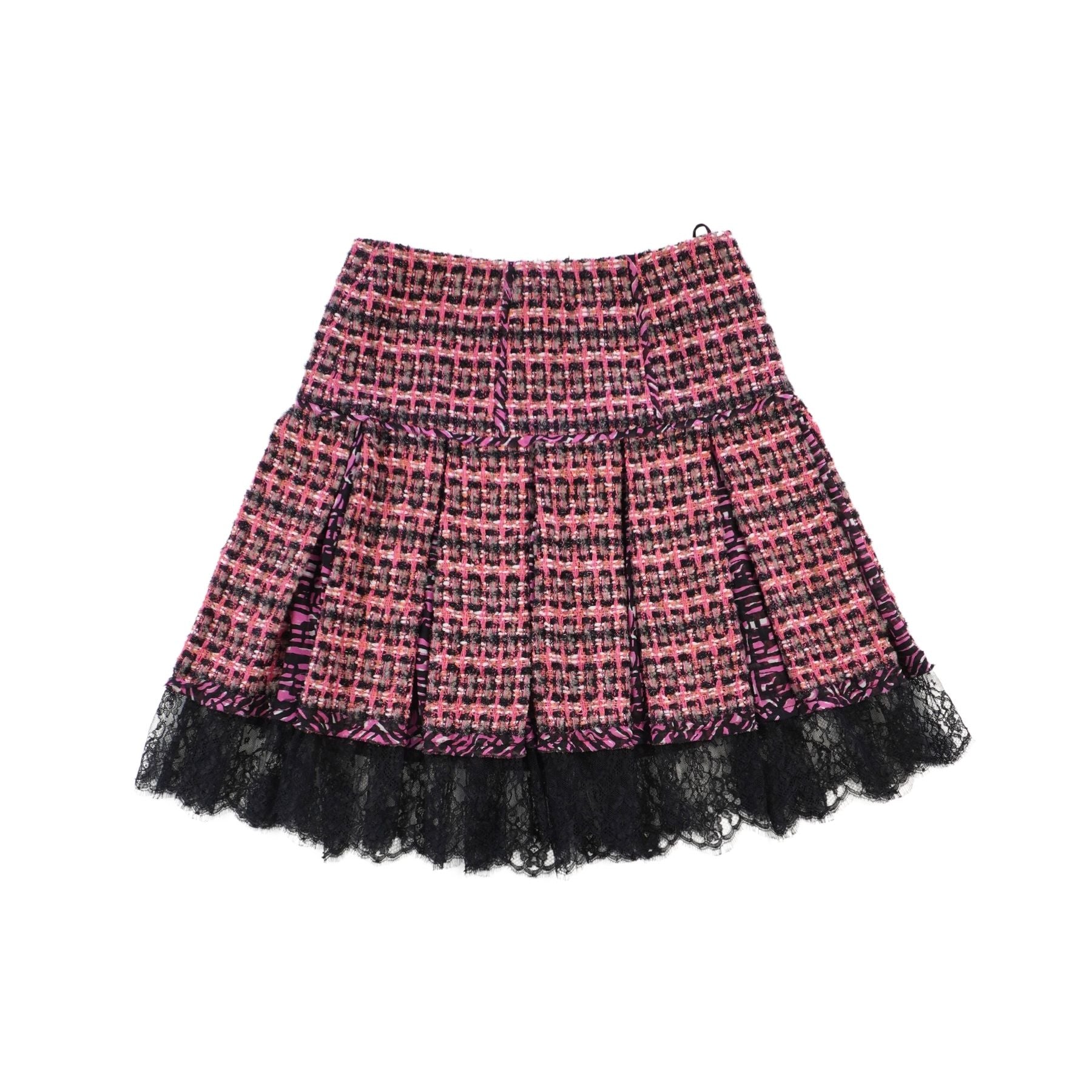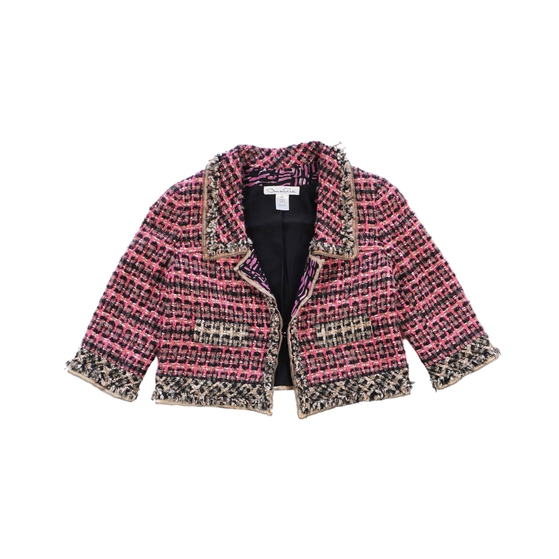 Oscar De La Renta two-piece set in pink, cream, and black tweed with a matching blazer and skirt. The blazer is cropped with 3/4 length sleeves, a notch lapel collar, a front clip closure, and a tan and black silk trim. The skirt is a pleated ruffle skirt with a thick waistband, black and pink geometric silk paneling, and a black lace trim.