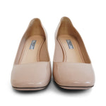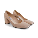 Prada heels in nude patent leather featuring a square toe and block heel.