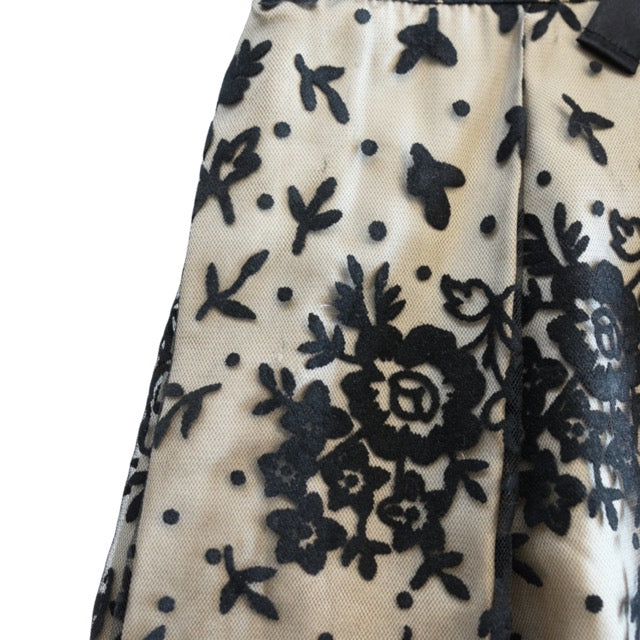 Red Valentino a-line dress in beige silk and black lace all-over print overlay. Featuring ribbon spaghetti straps, front and back pleats, double satin bow waistband and a tulle ruffle trim.