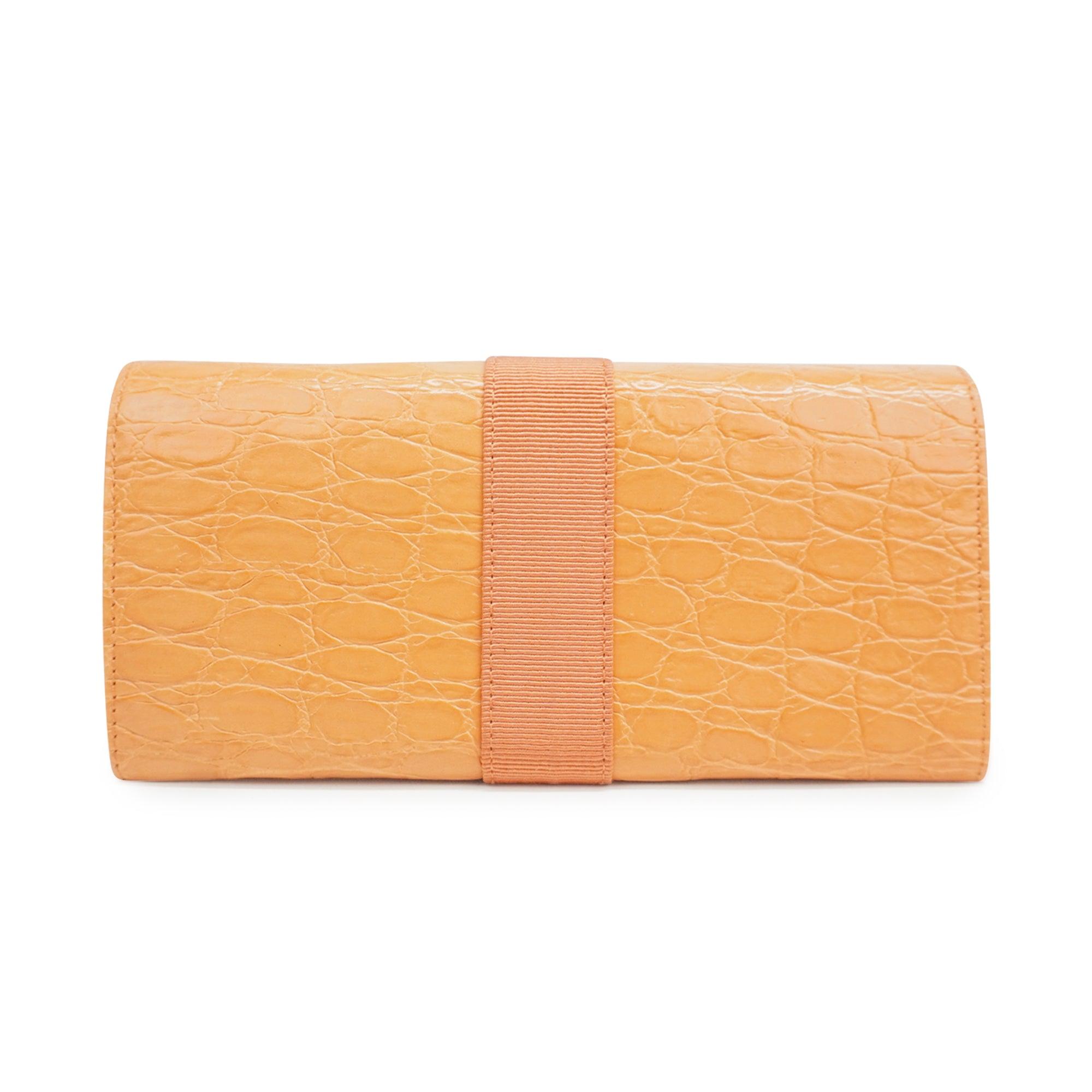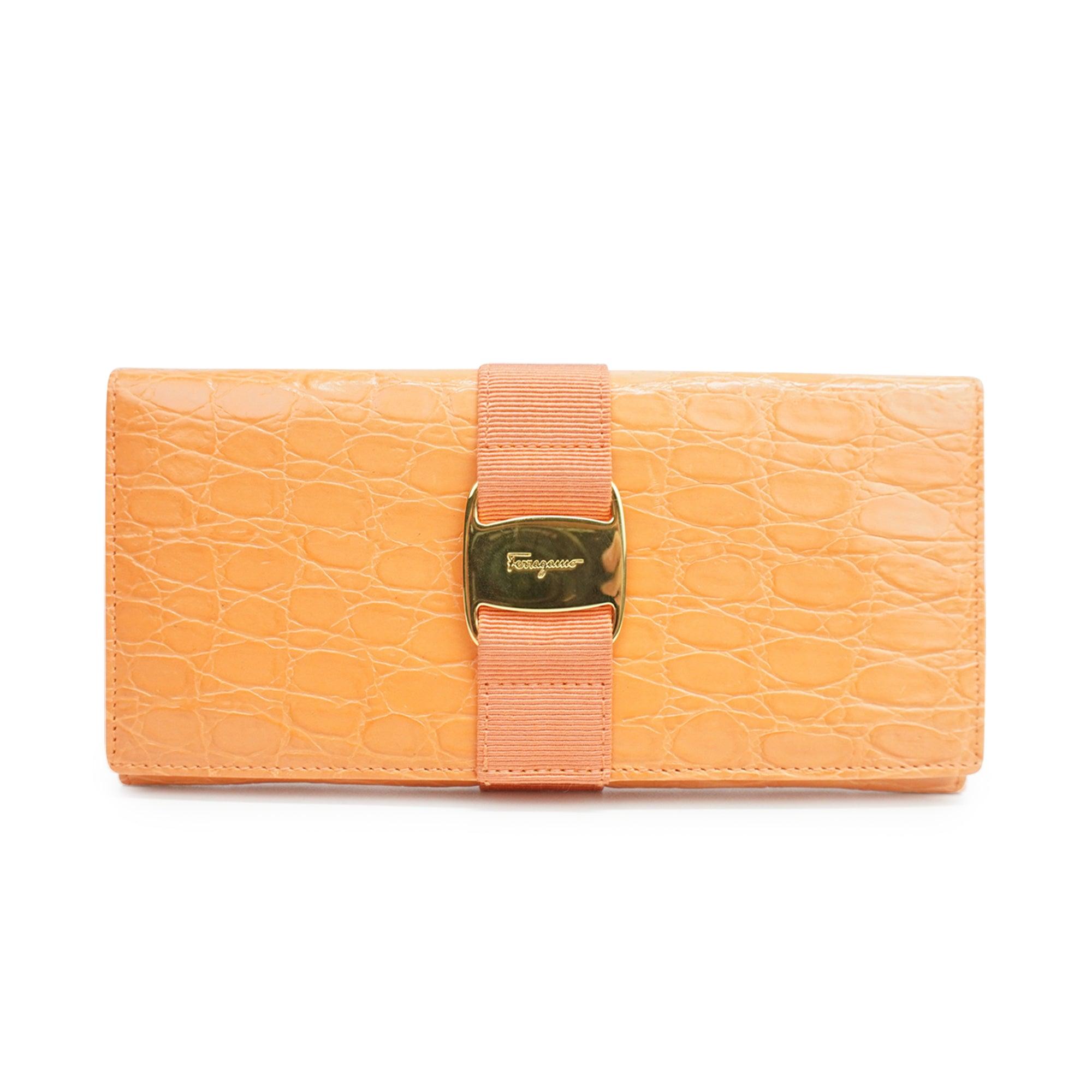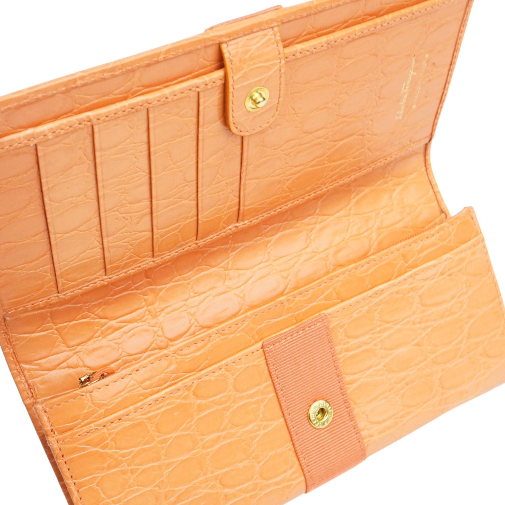 Salvatore Ferragamo wallet in orange croc embossed leather with ribbon details, gold buckle hardware and a snap closure.