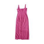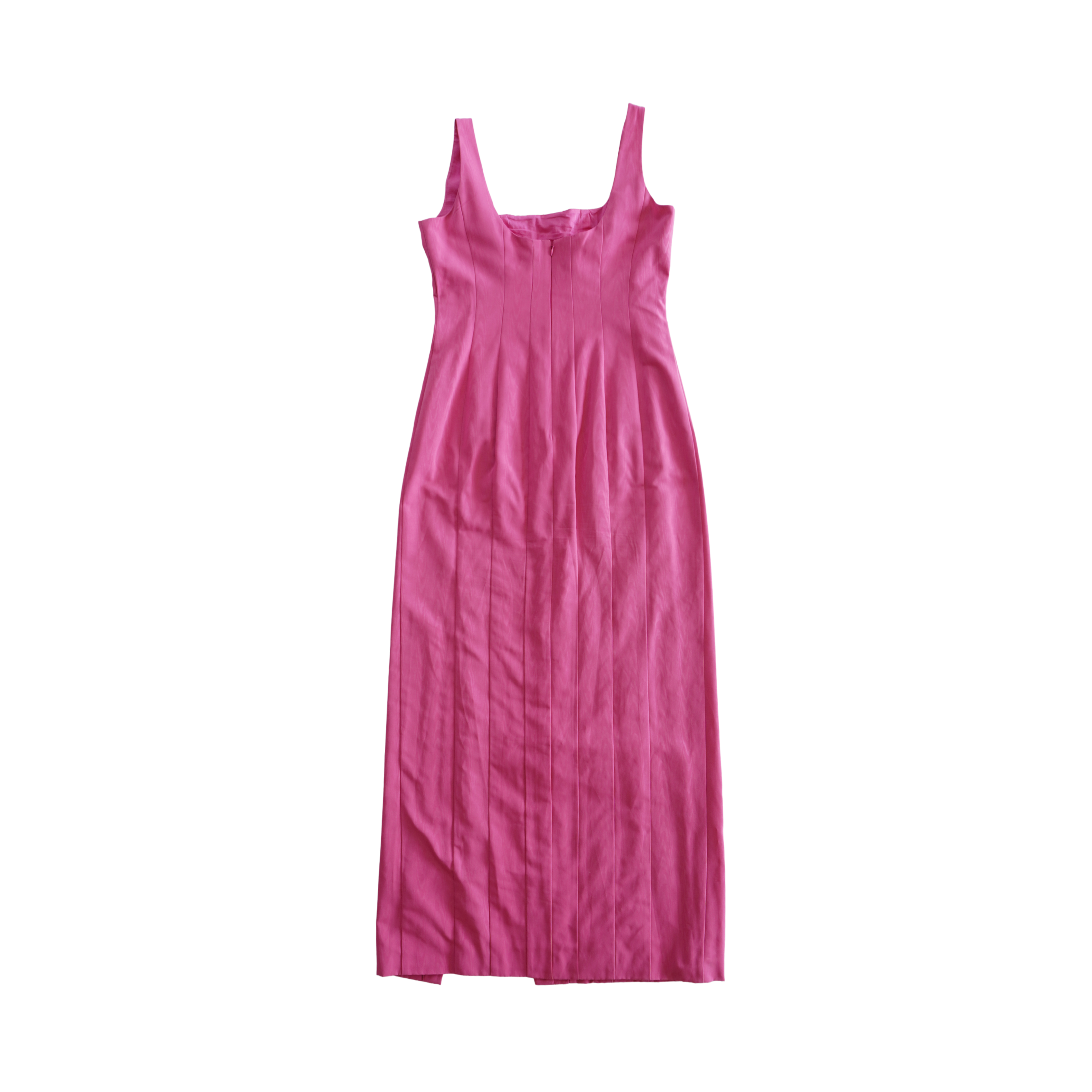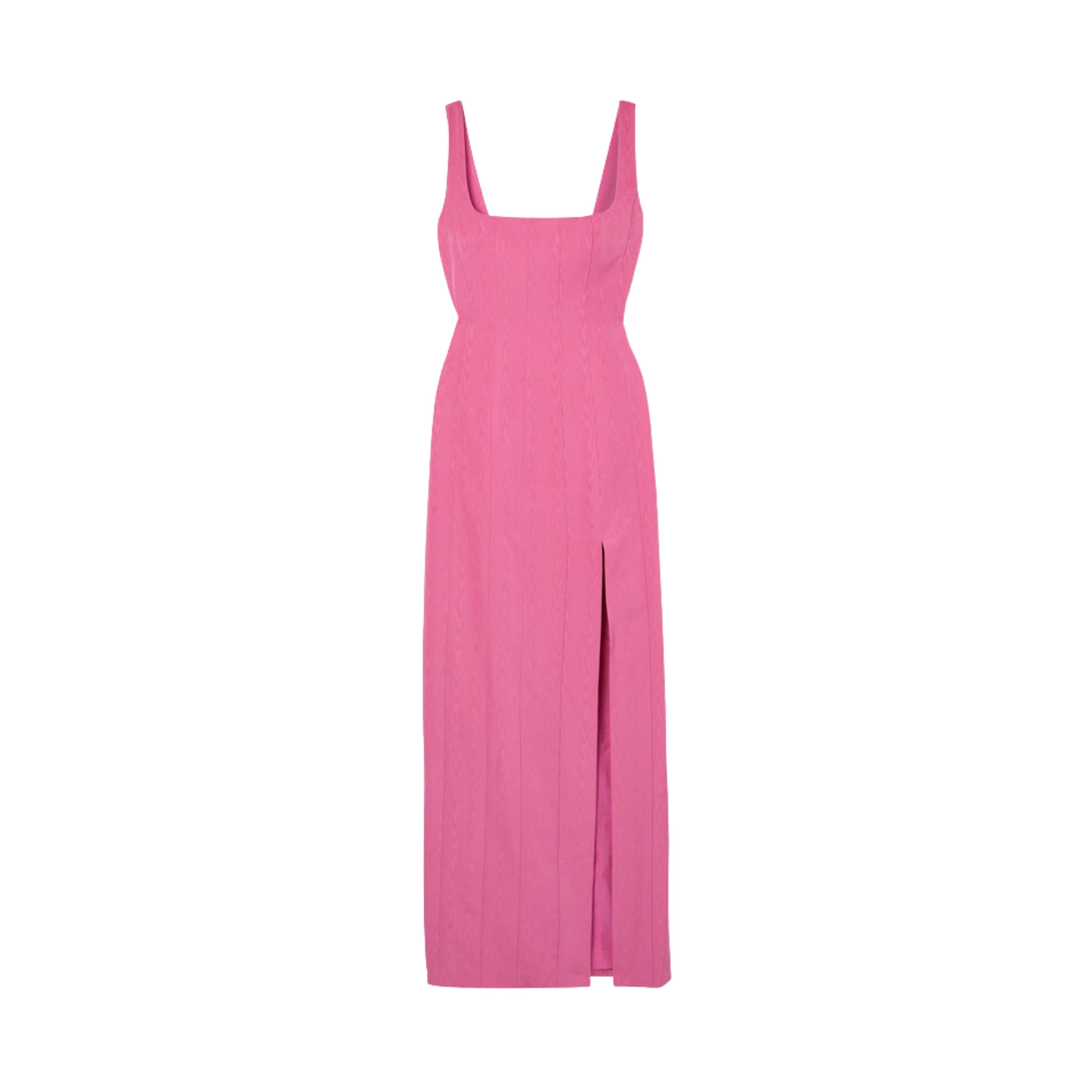 Staud 'Portrait Moire' maxi dress in thin vertical bright pink moiré panels with a square neck and high front slit.