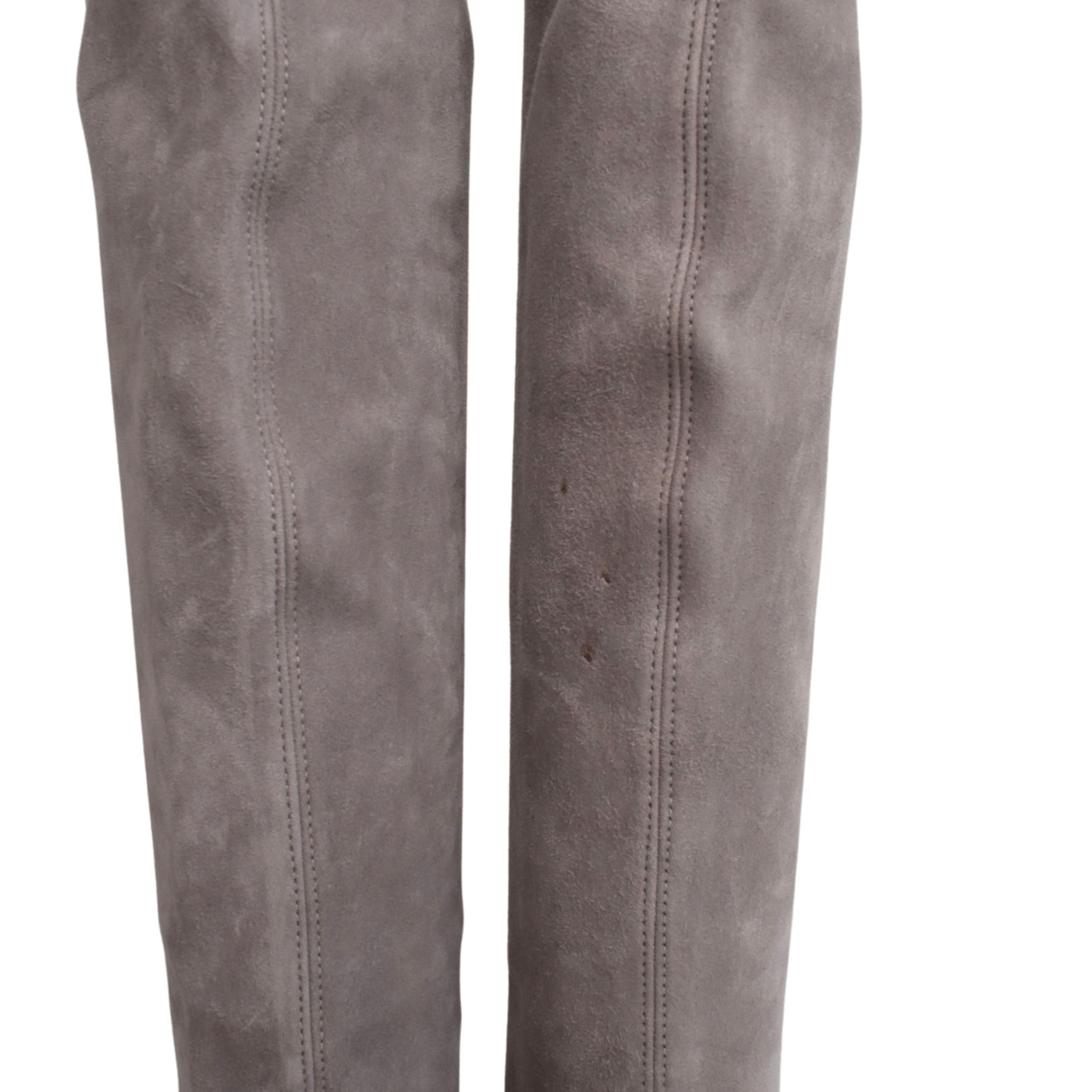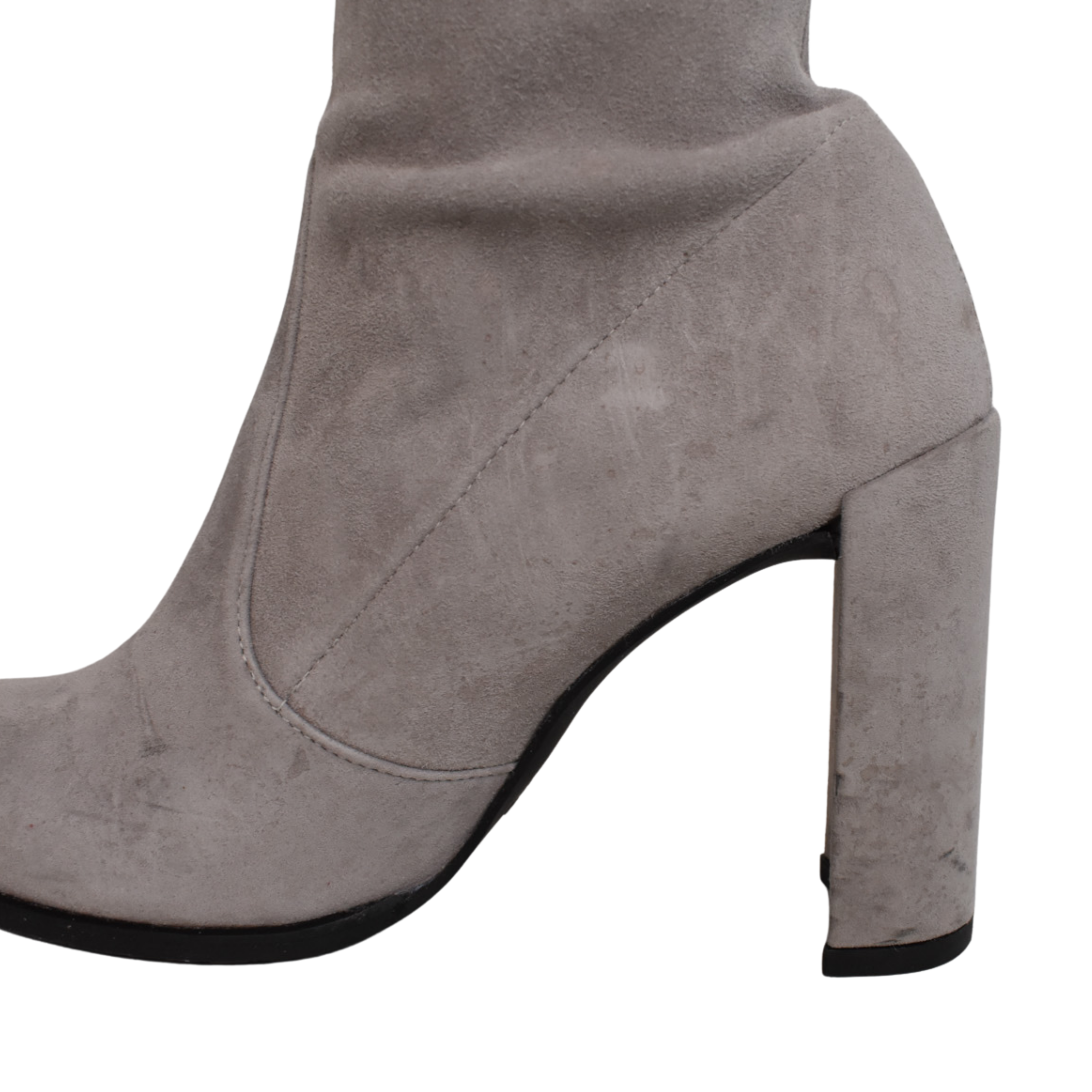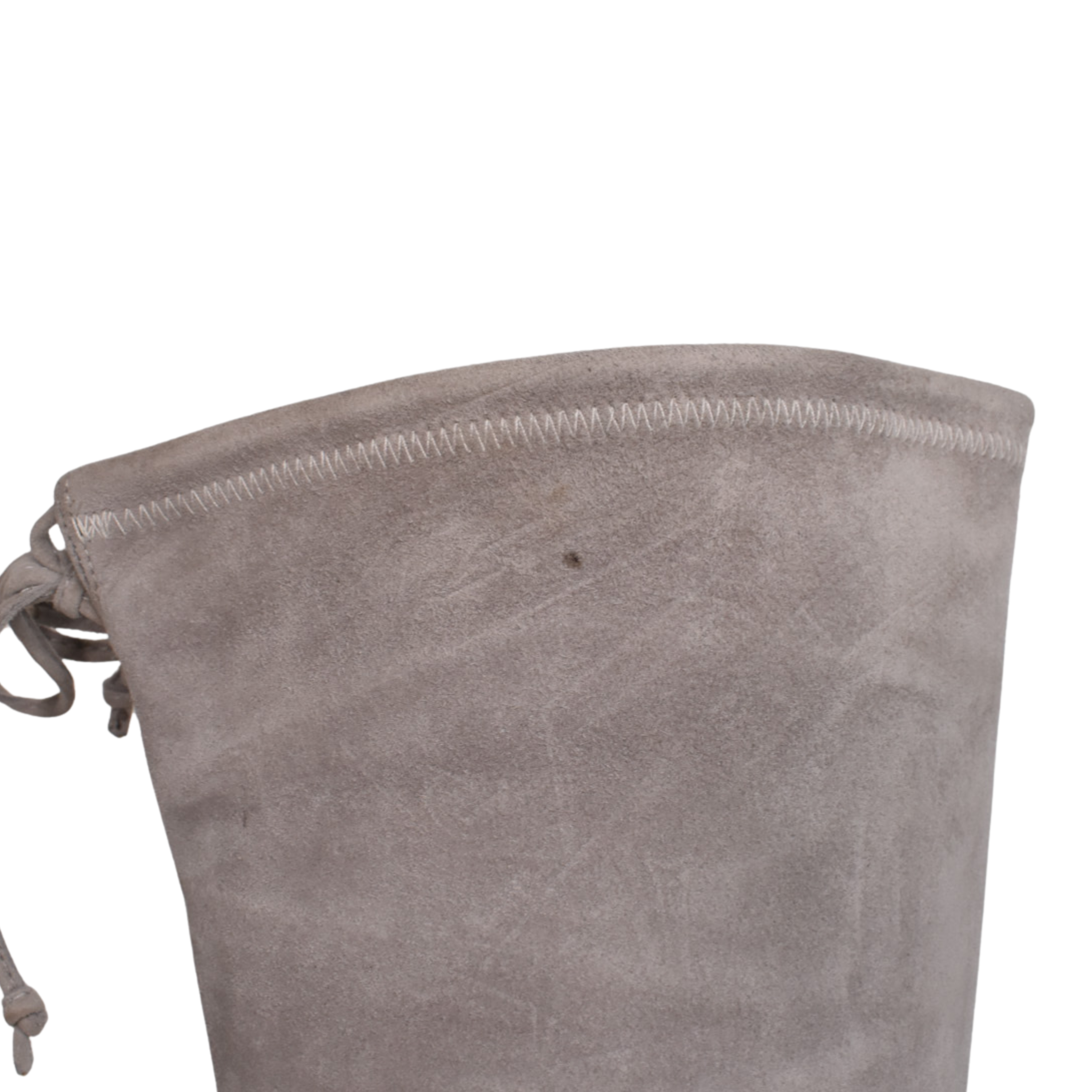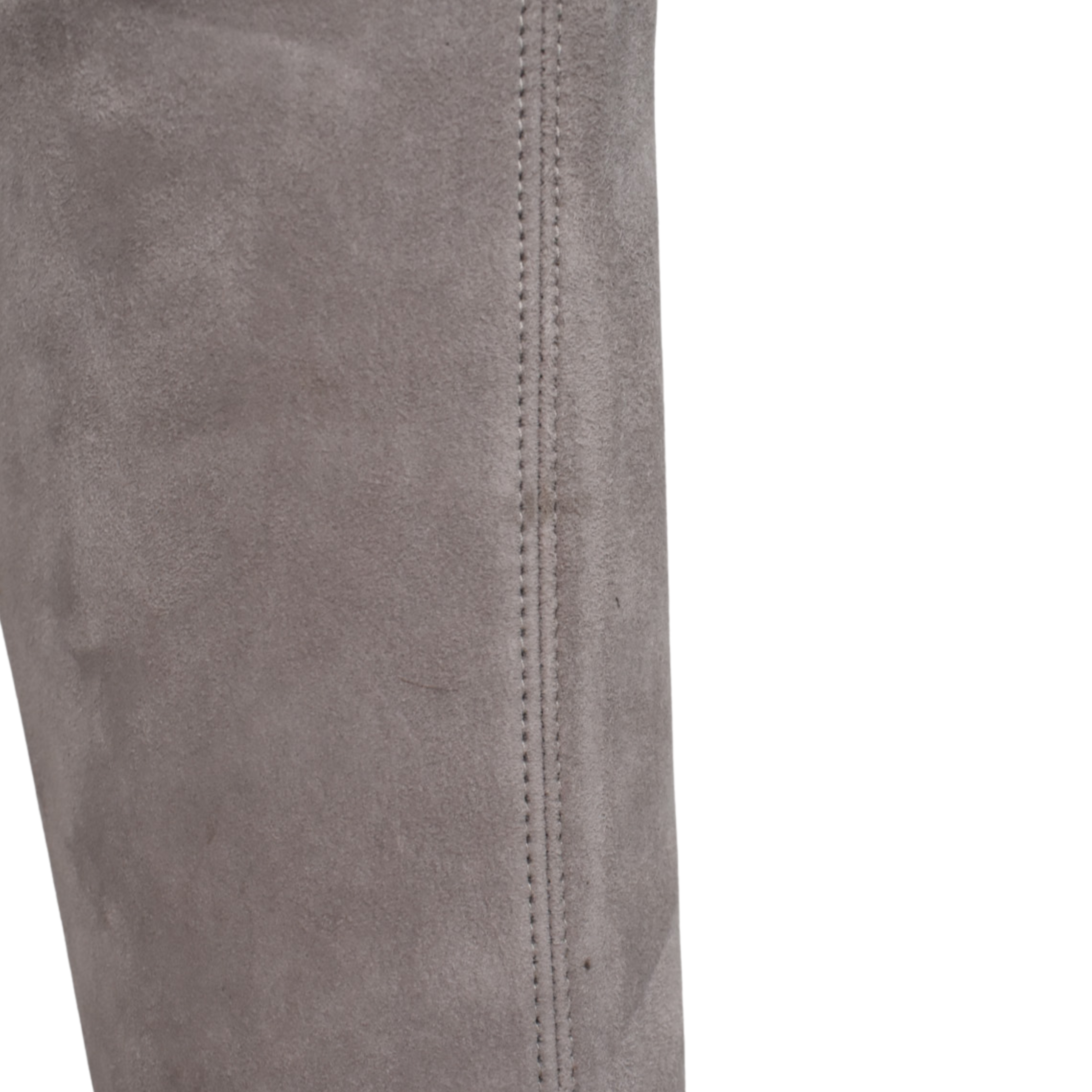 Stuart Weitzman 'Hiline' over the knee heeled boots in a light grey suede. Features an almond toe, a block heel, and a drawstring at the back.