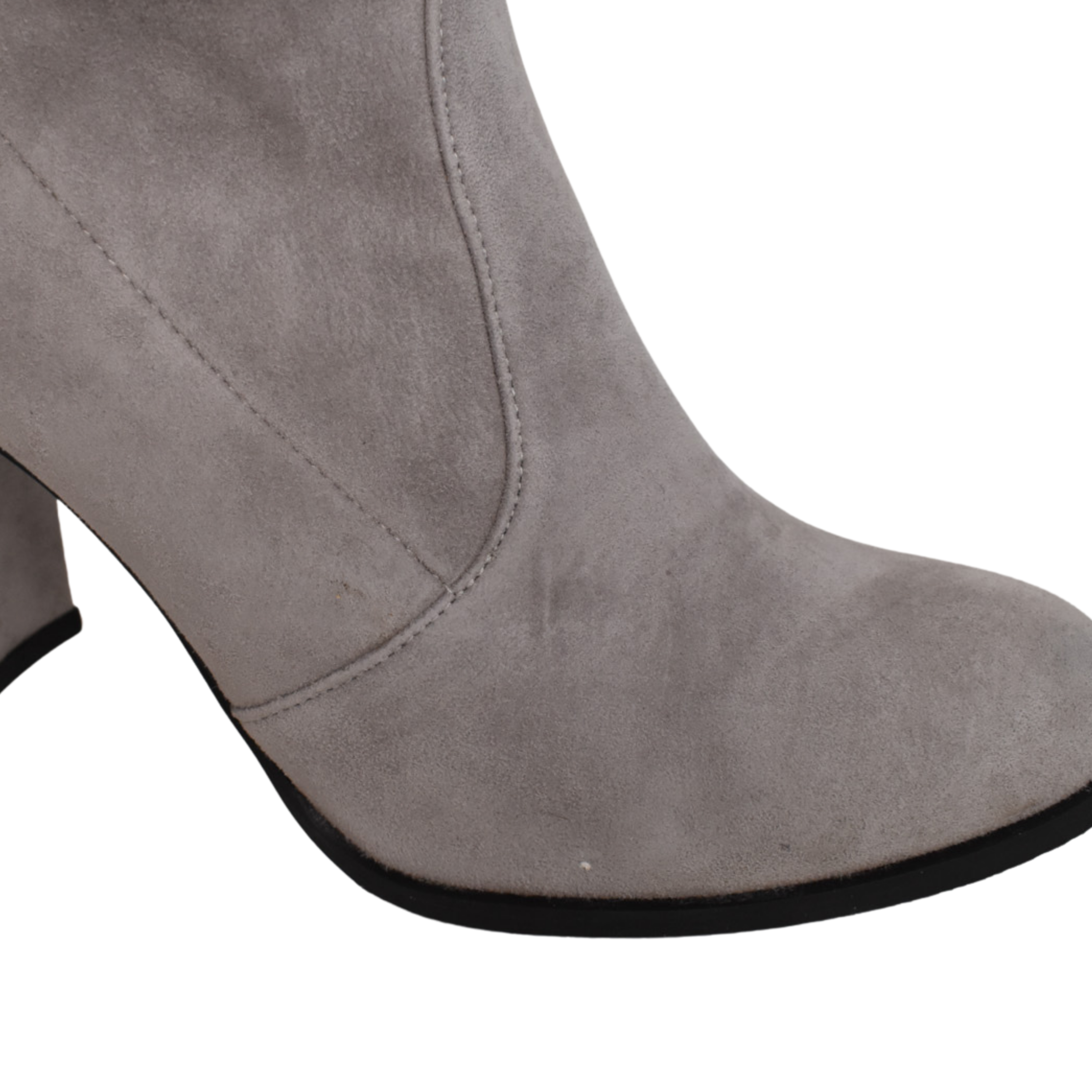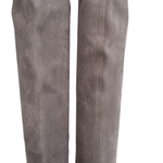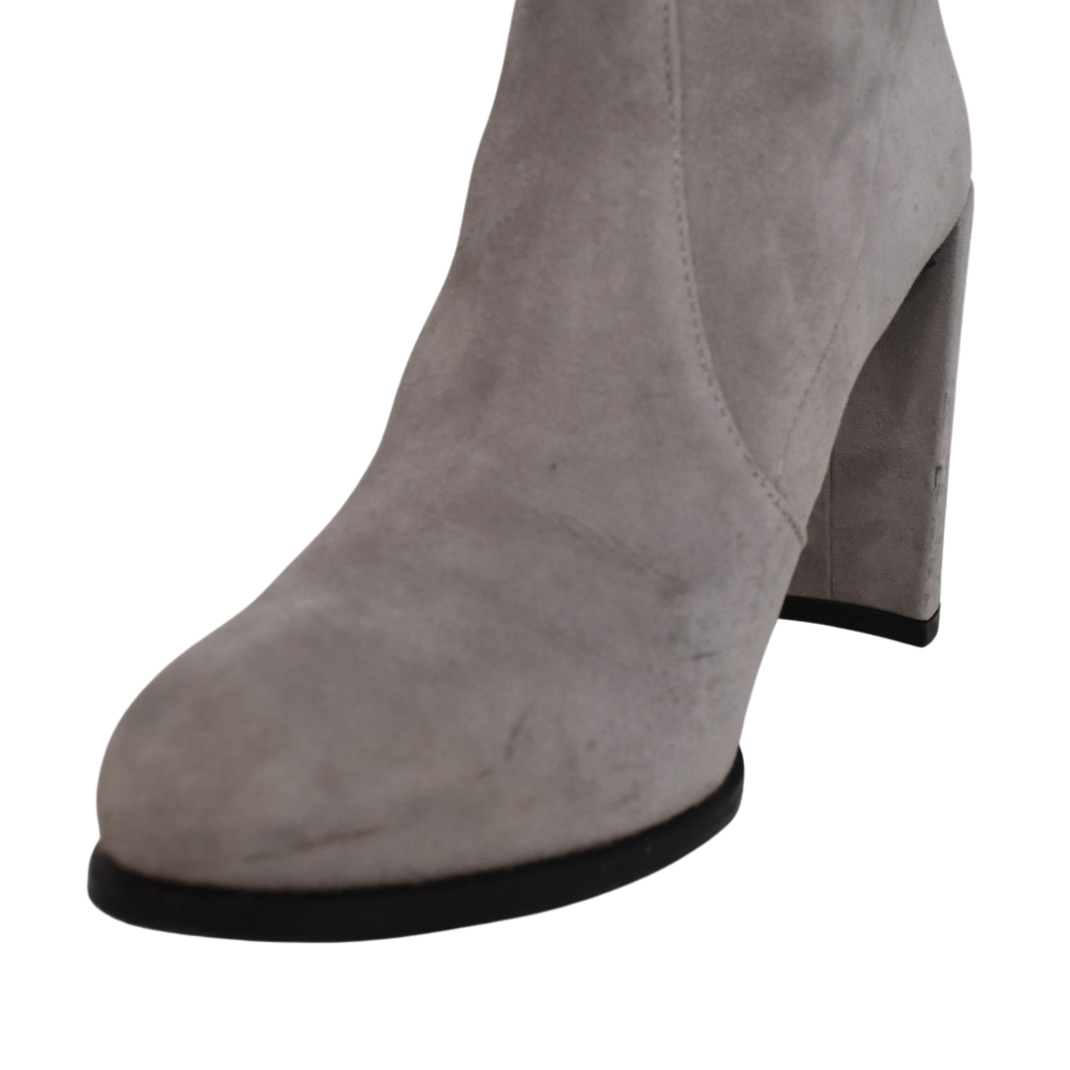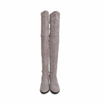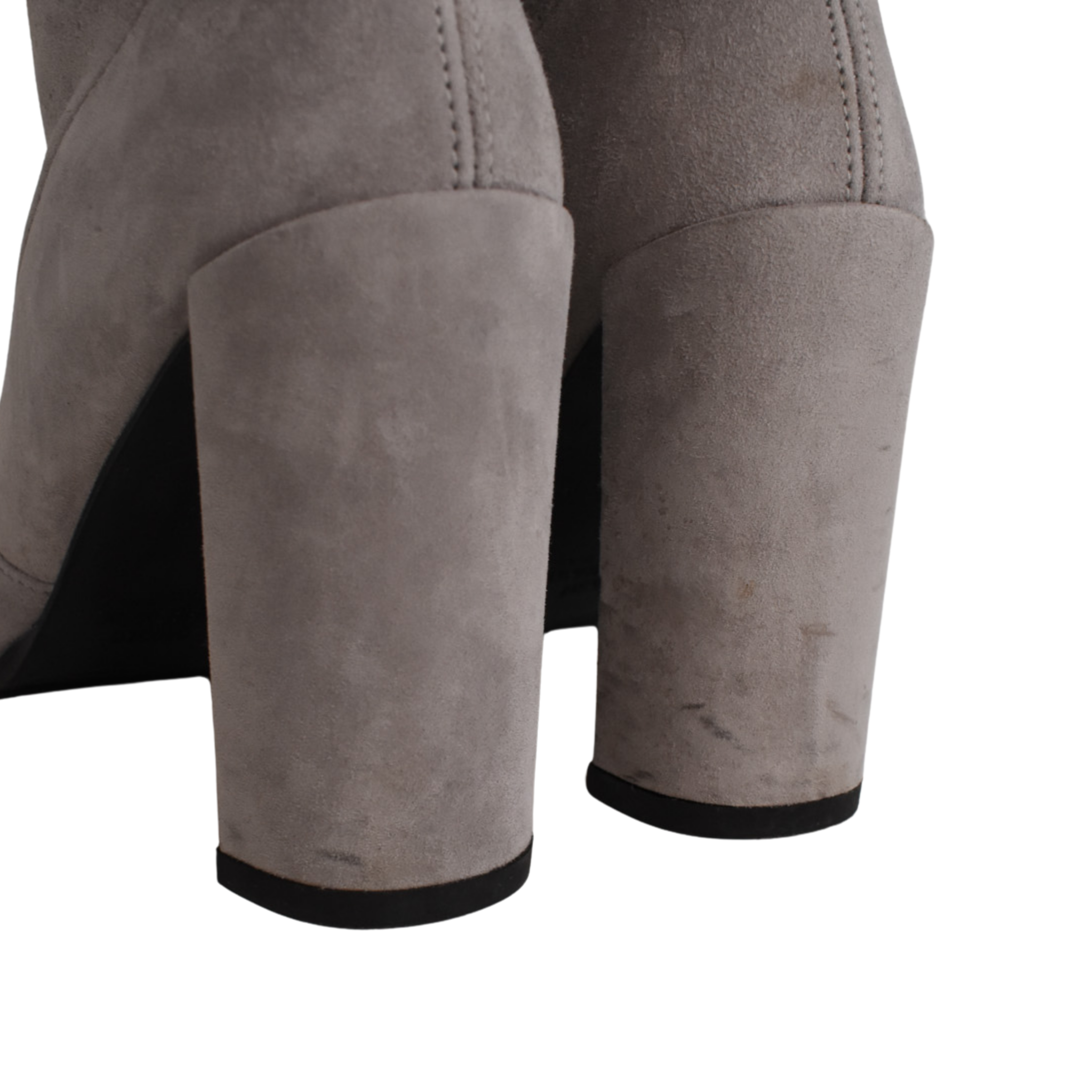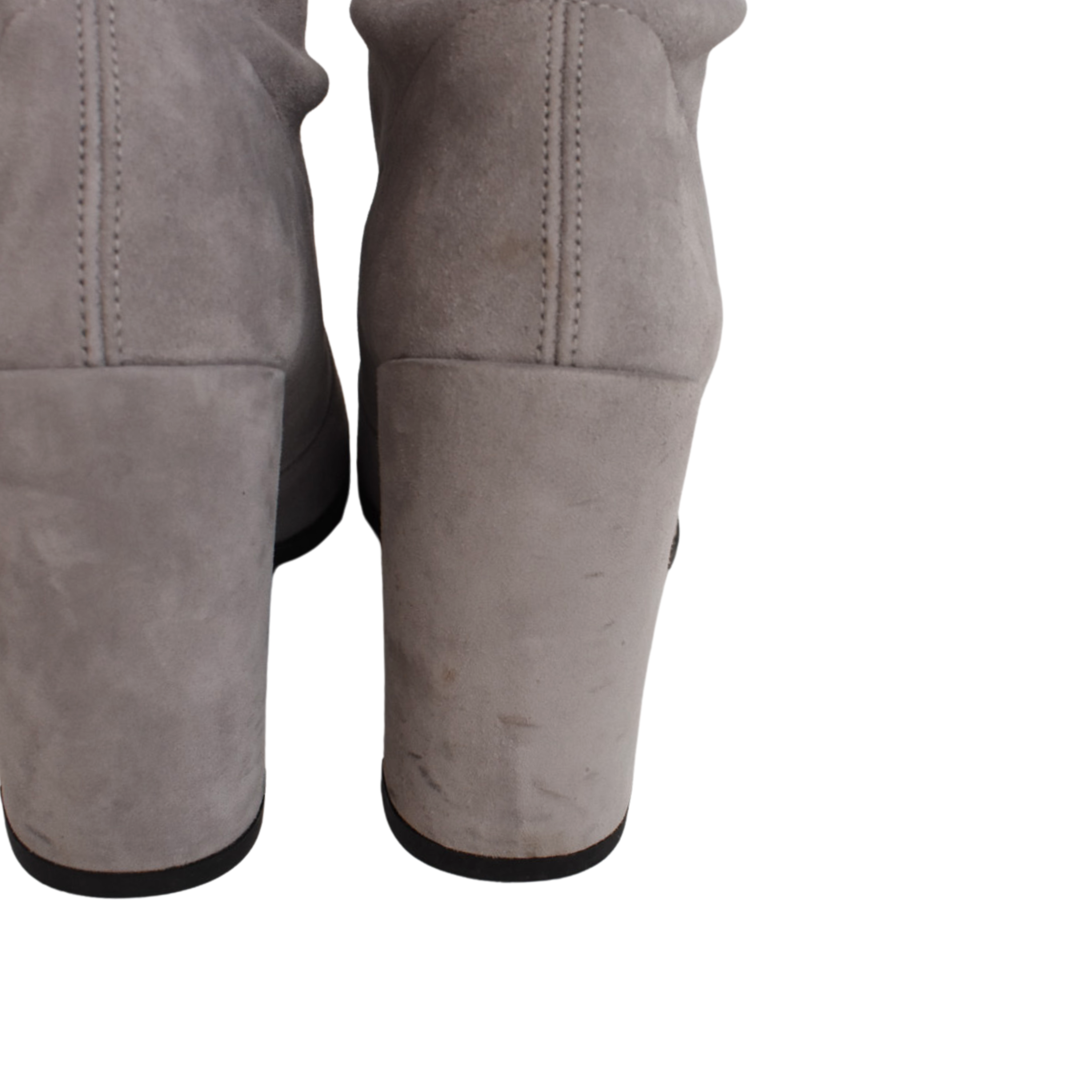 Stuart Weitzman 'Hiline' over the knee heeled boots in a light grey suede. Features an almond toe, a block heel, and a drawstring at the back.