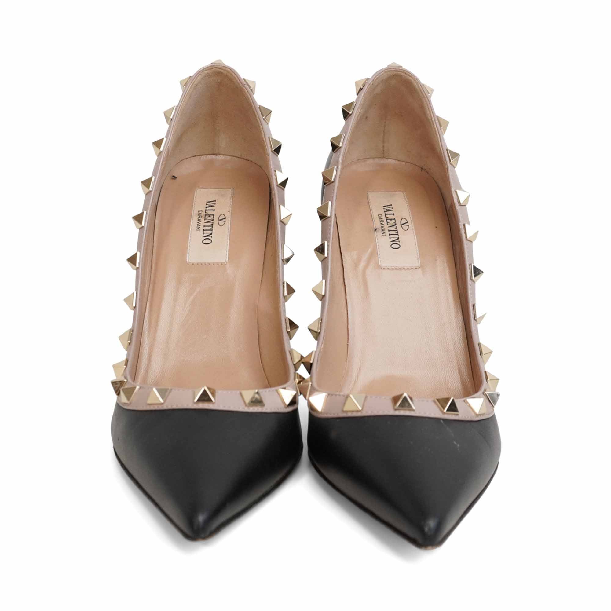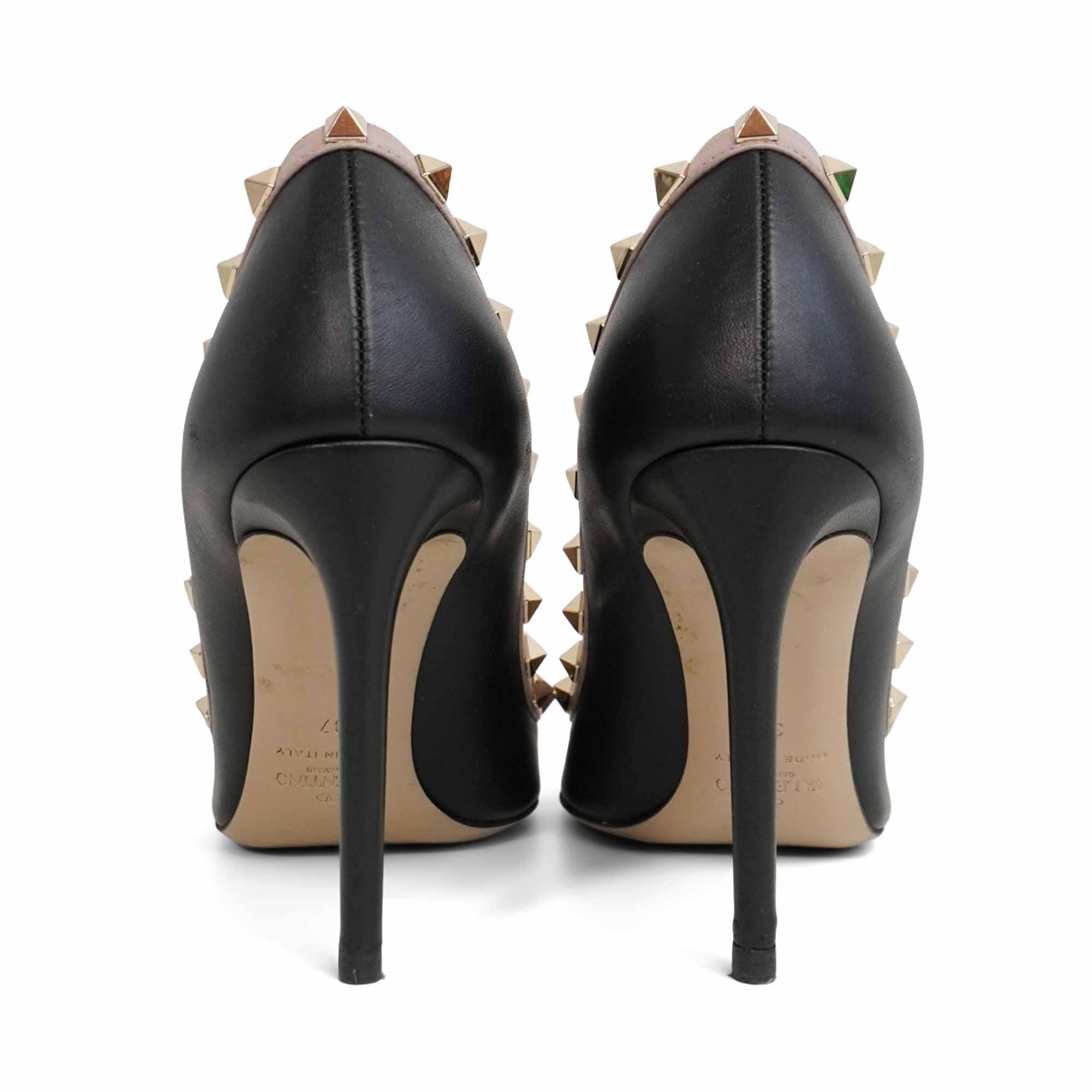 Valentino 'Rockstud' pointed toe, stiletto pumps in black leather. Features a blush pink trim with gold tone rockstuds all around foot.