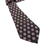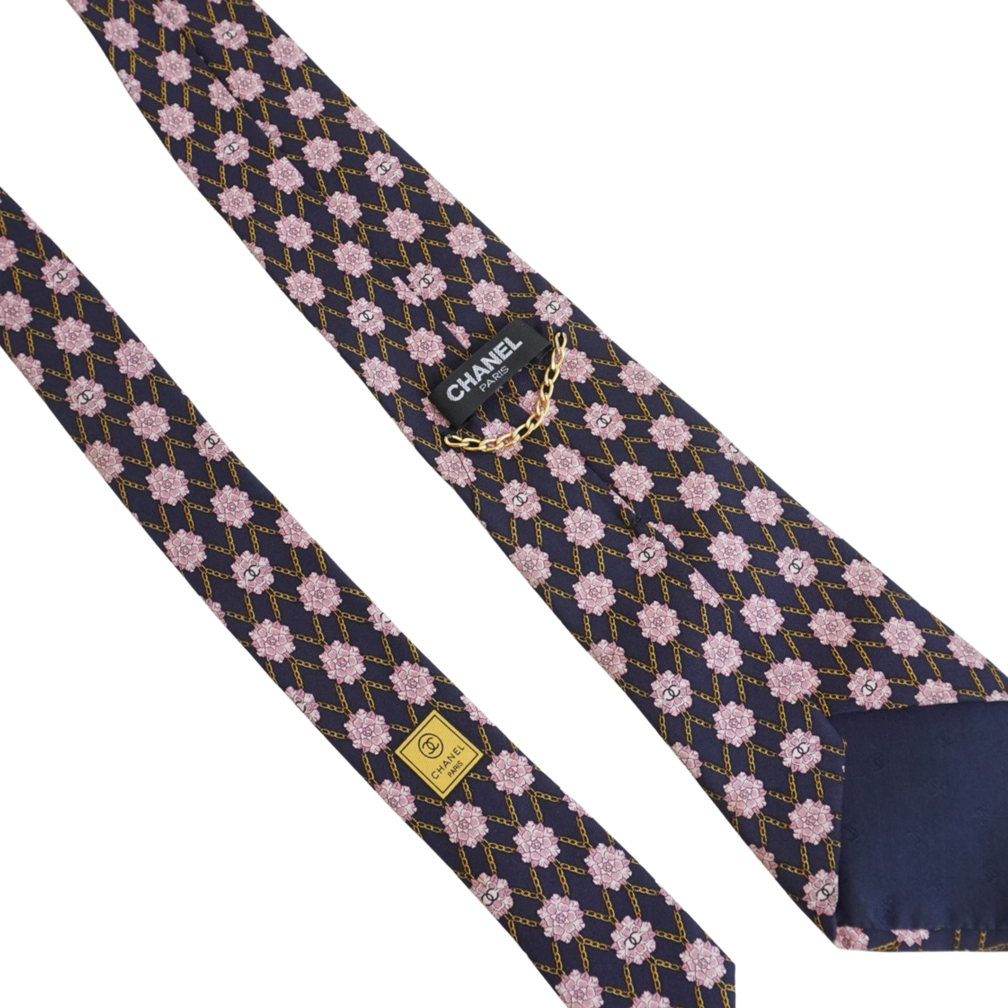 Chain navy silk tie with gold chain link and pink camellia flower print featuring small CC logos throughout.