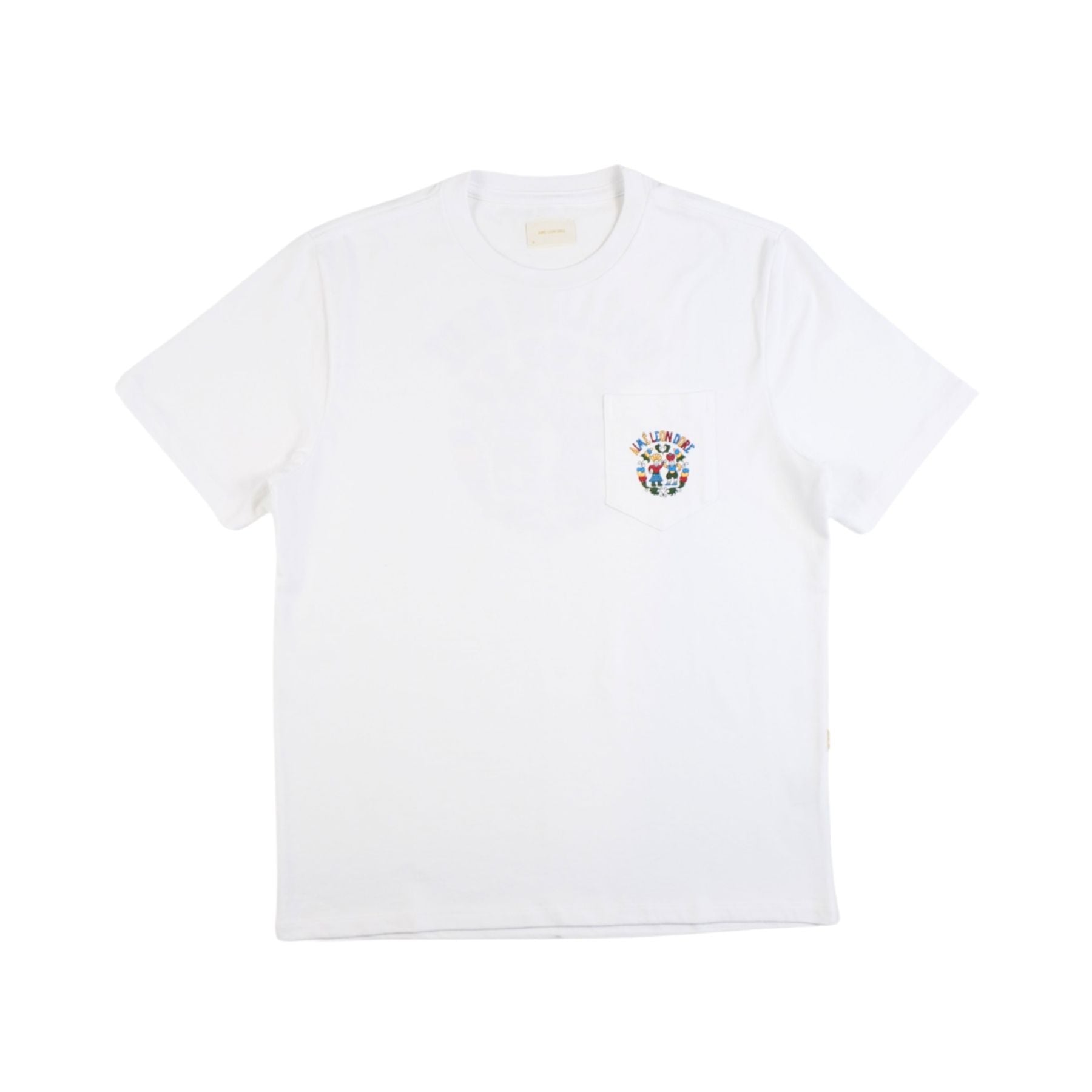 Aime Leon Dore white t-shirt with chest pocket and multicolour logo graphics on the front and back.