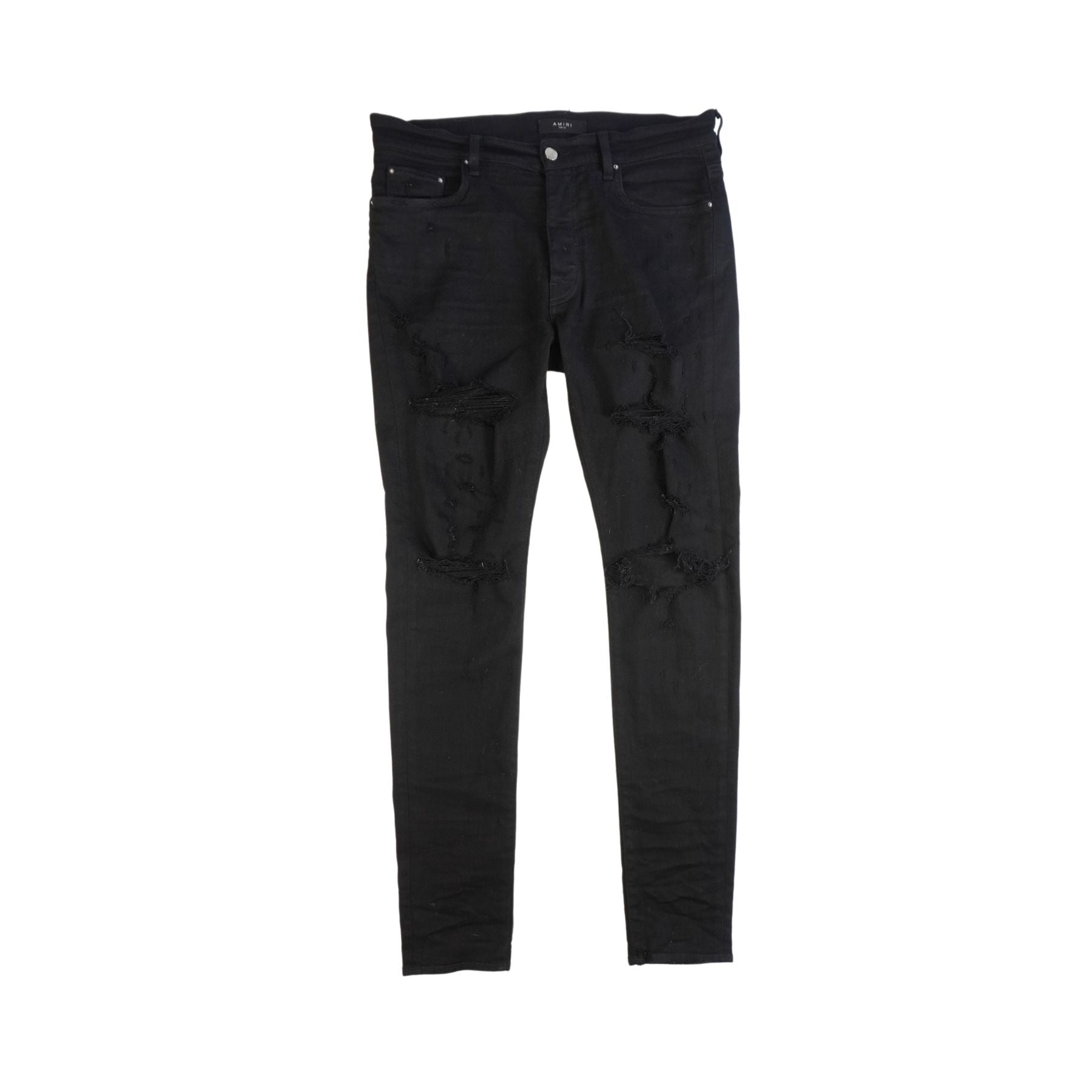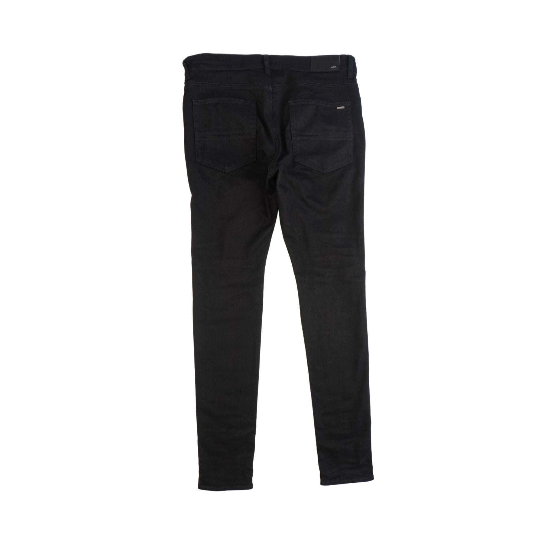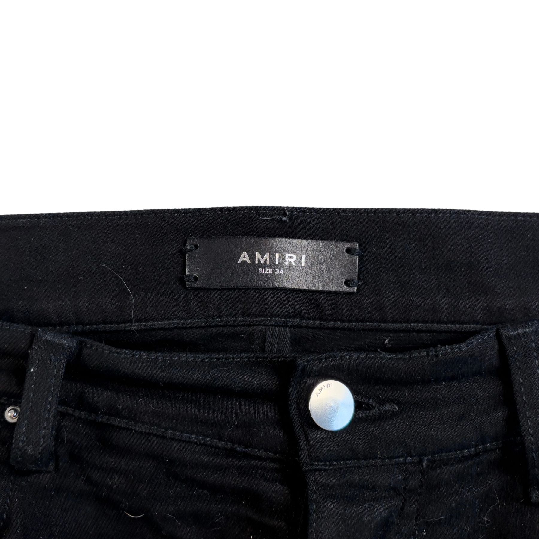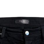 Amiri skinny jeans in black denim with distressing on the thighs, logo plaque on the back pocket in silver hardware, and a black leather logo patch on the waistband.