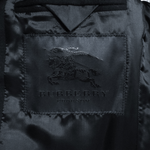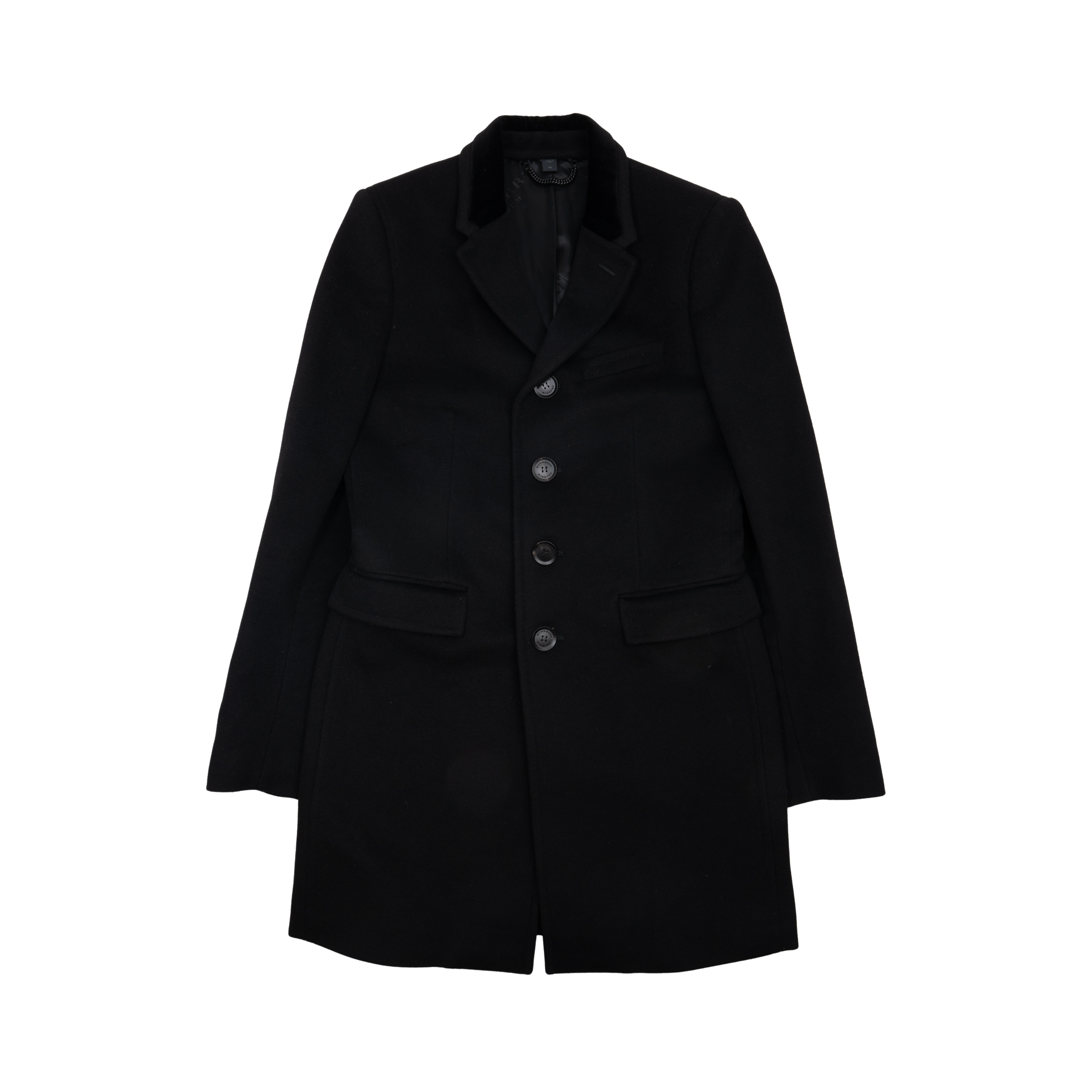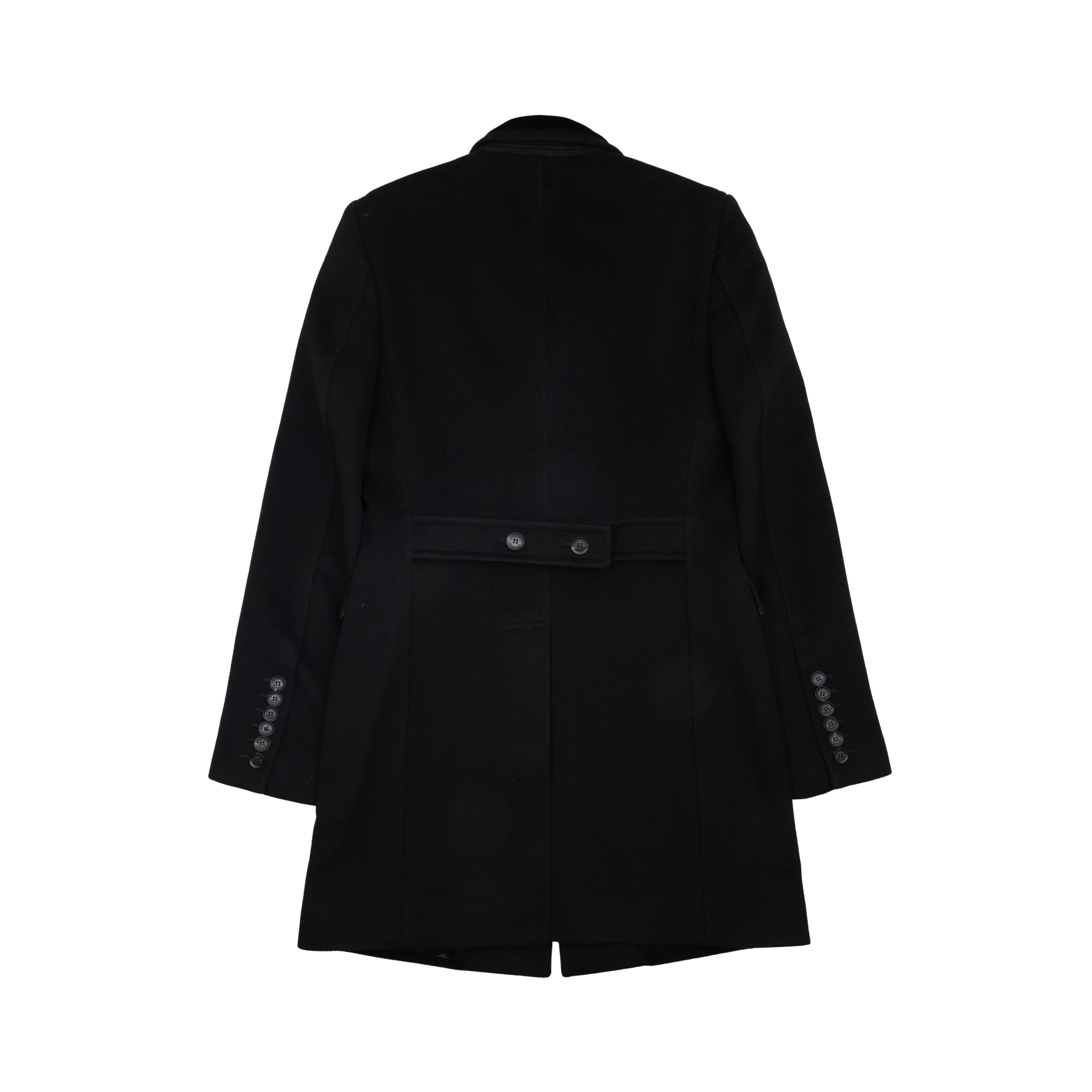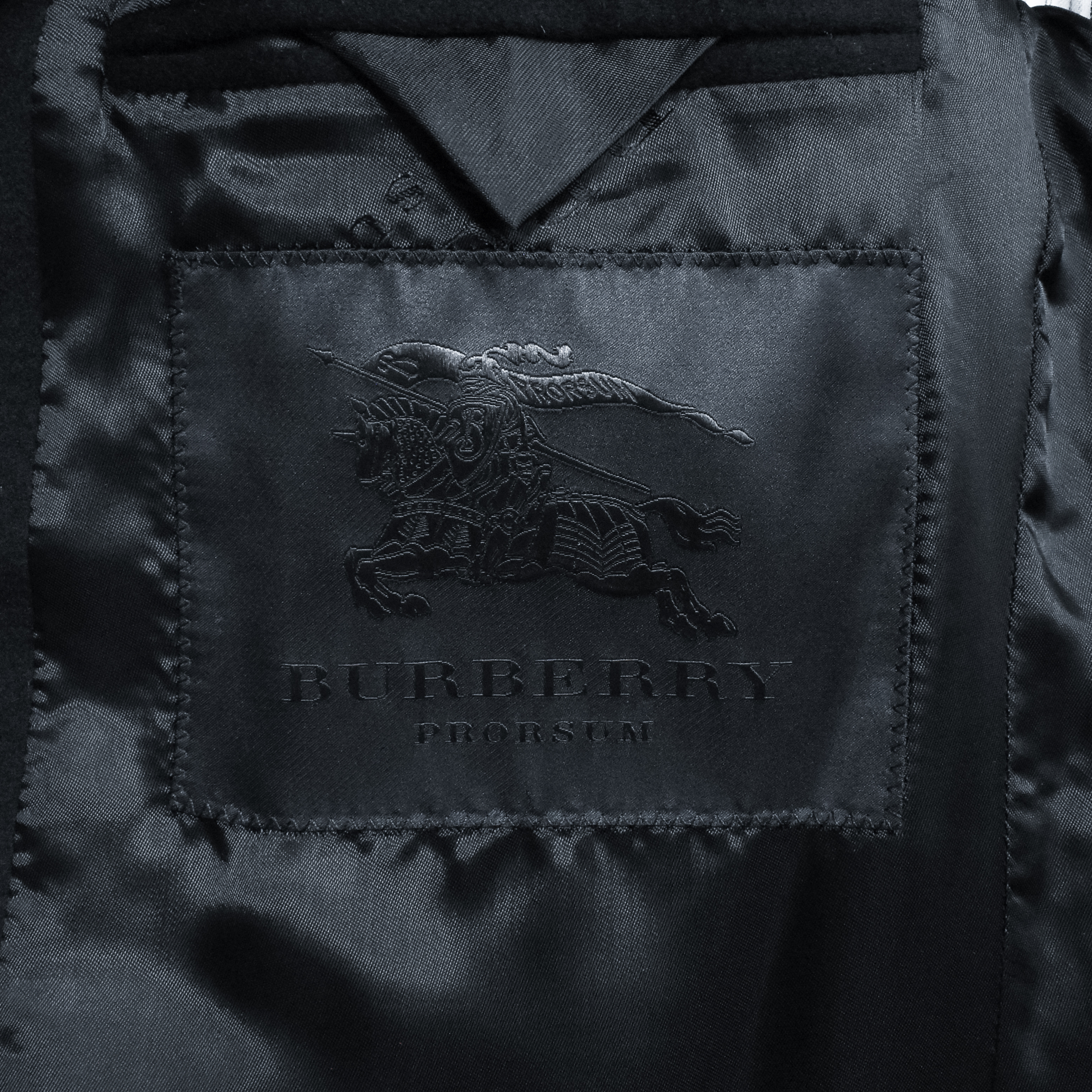 Burberry mid-length jacket in black wool and cashmere blend with three pocket styling, velvet notch collar, back vent and back martingale strap.