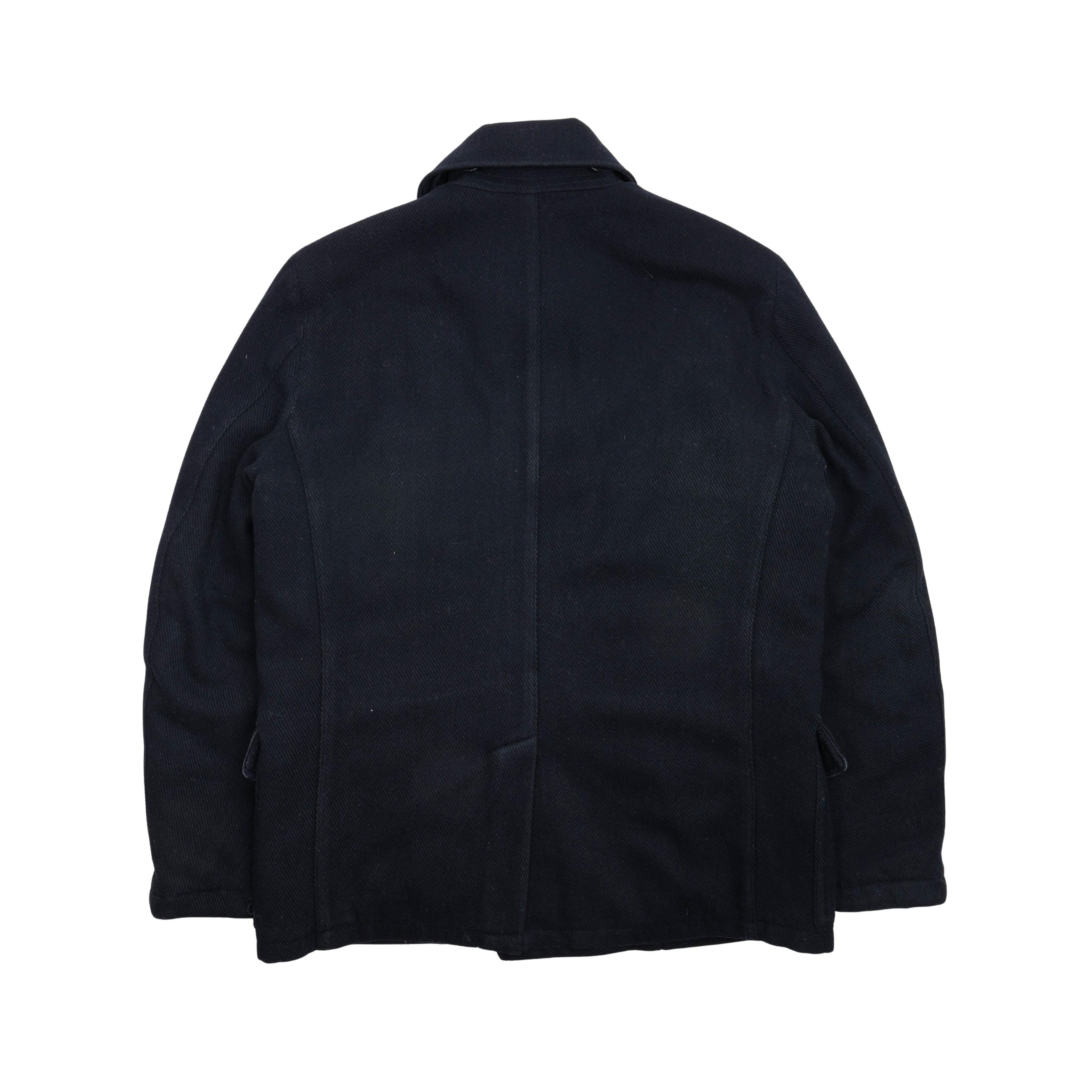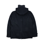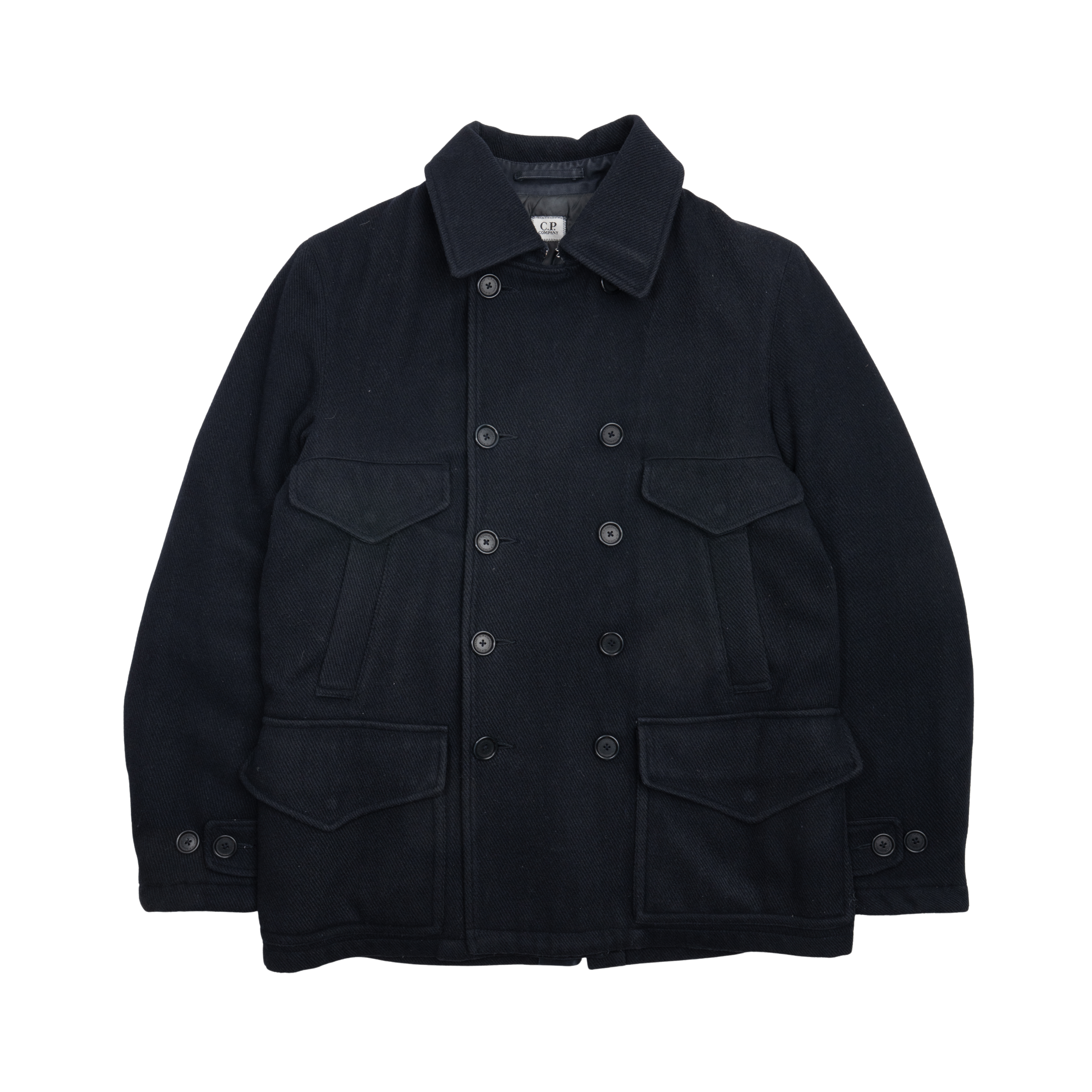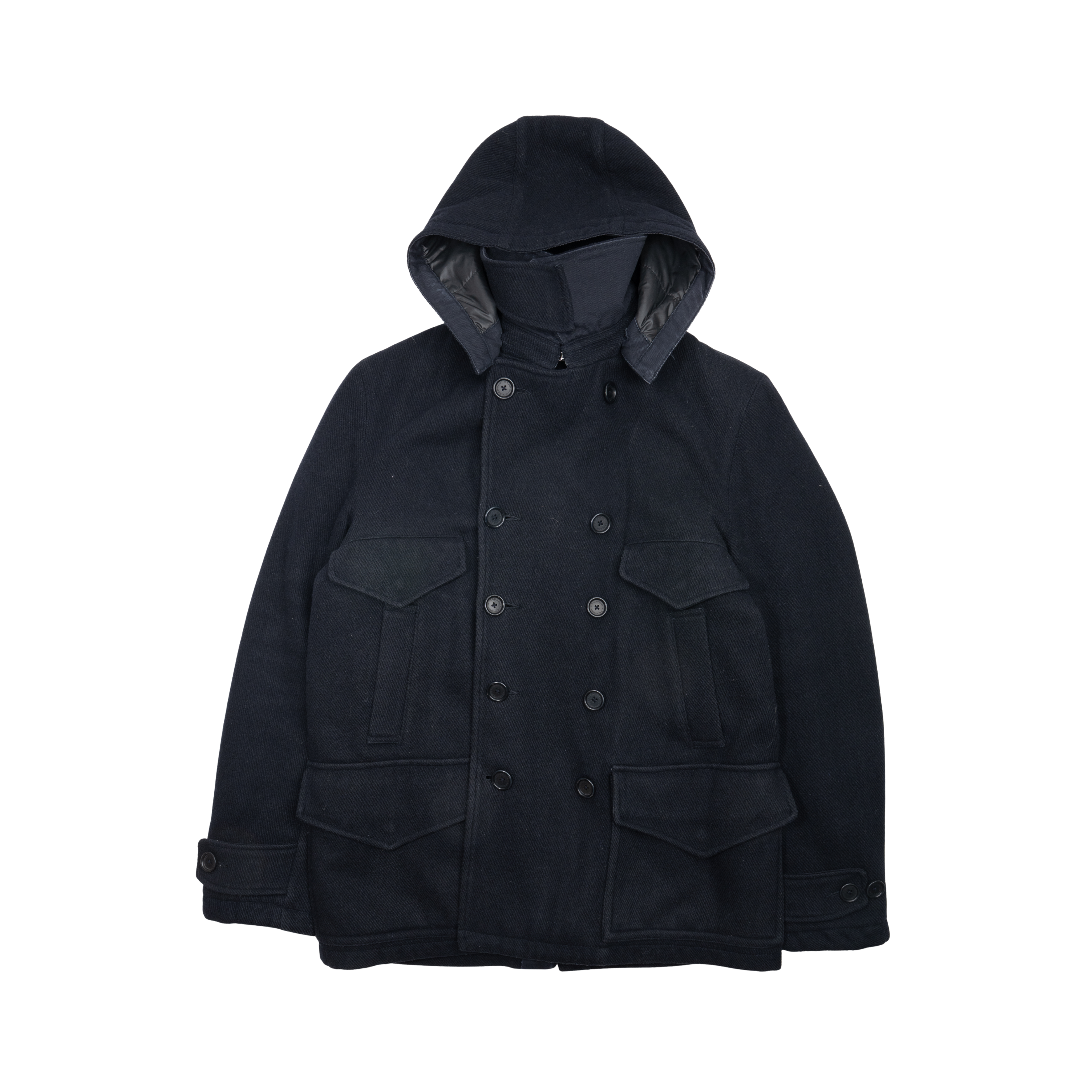 CP Company double-breasted jacket in navy wool with four front flap pockets and two front slip pockets. Features a back vent, detachable hood and a full nylon lining.