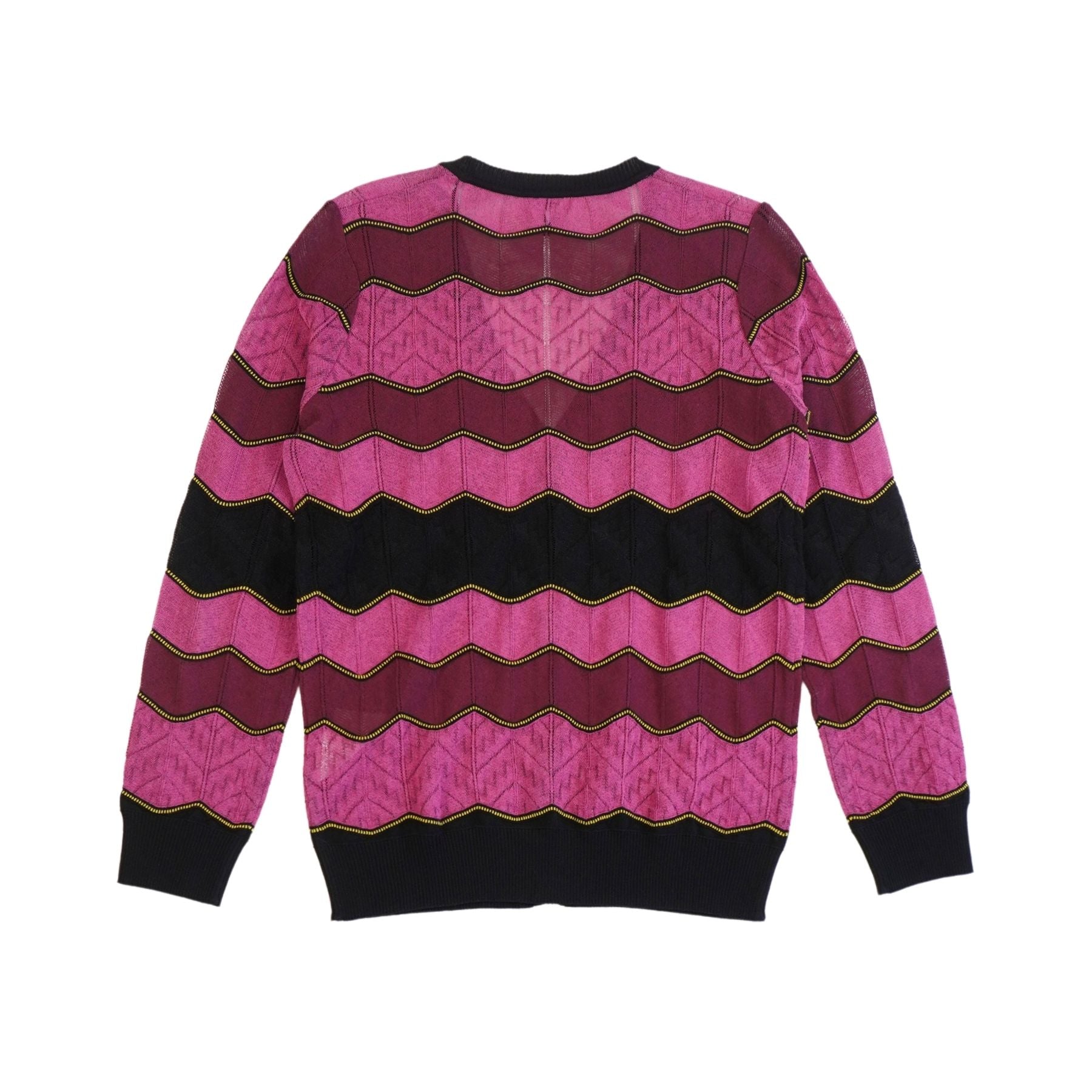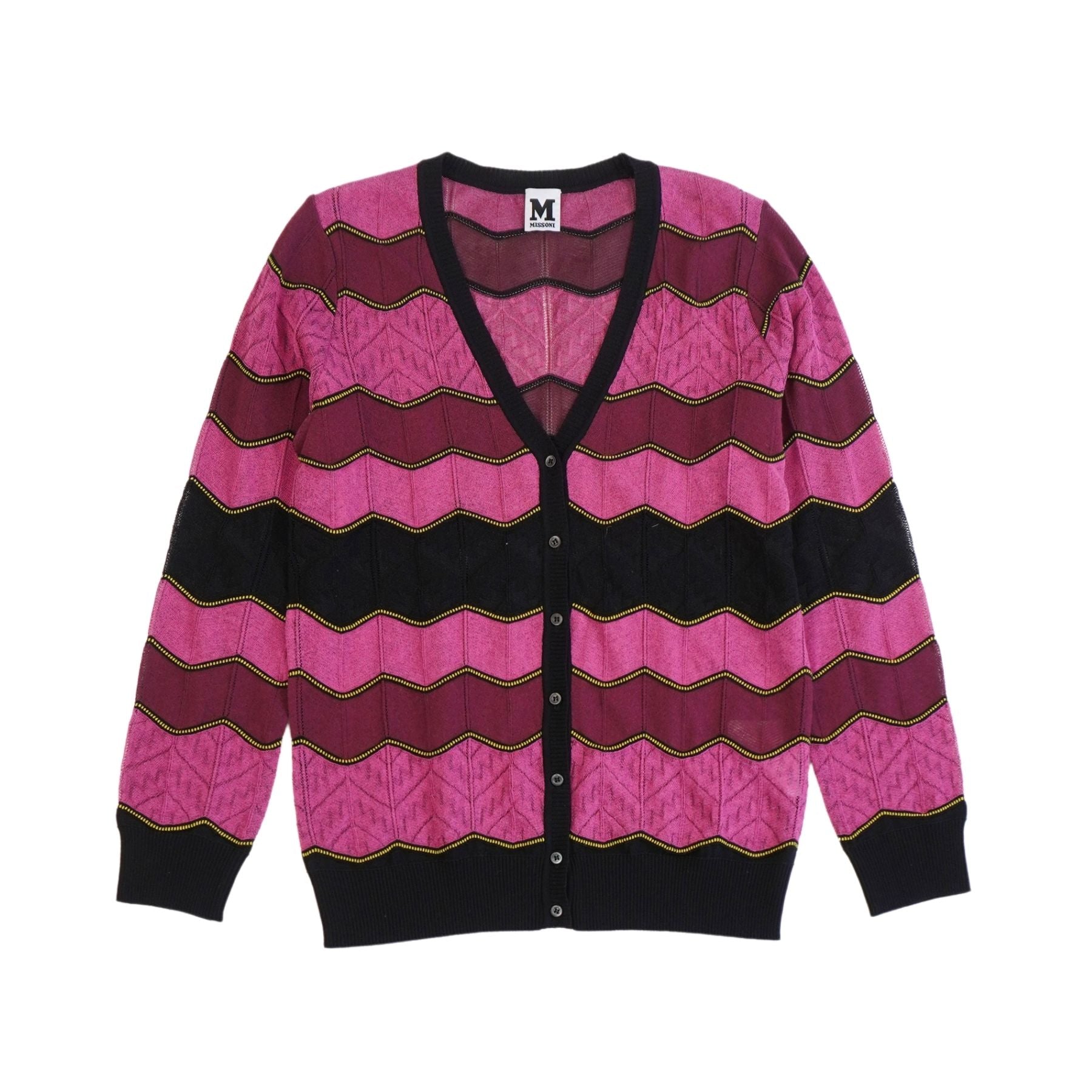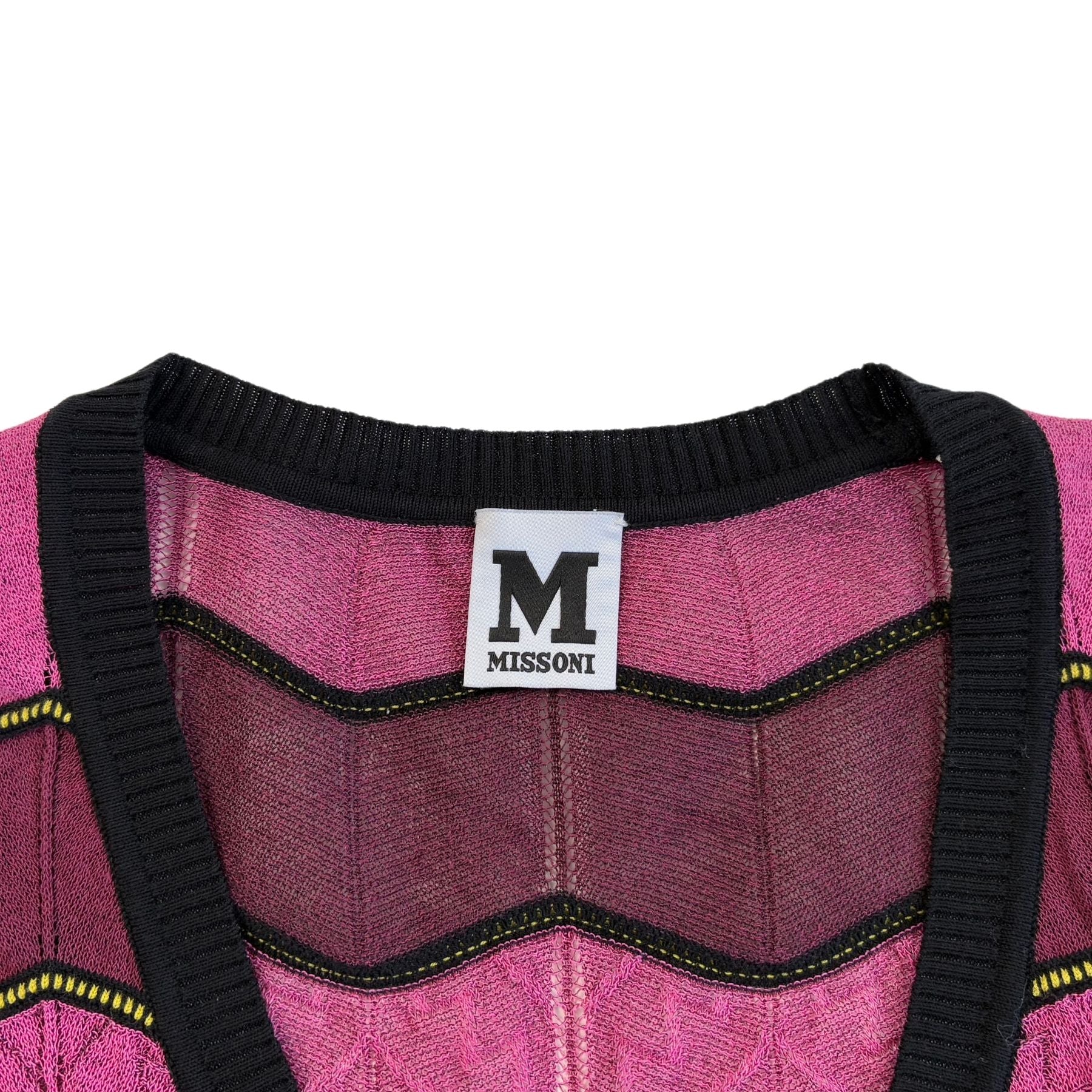 Missoni cardigan sweater in magenta and black zig-zag sheer knit with a yellow stripe trim, black ribbed cuffs and trim, and a black shell button closure.