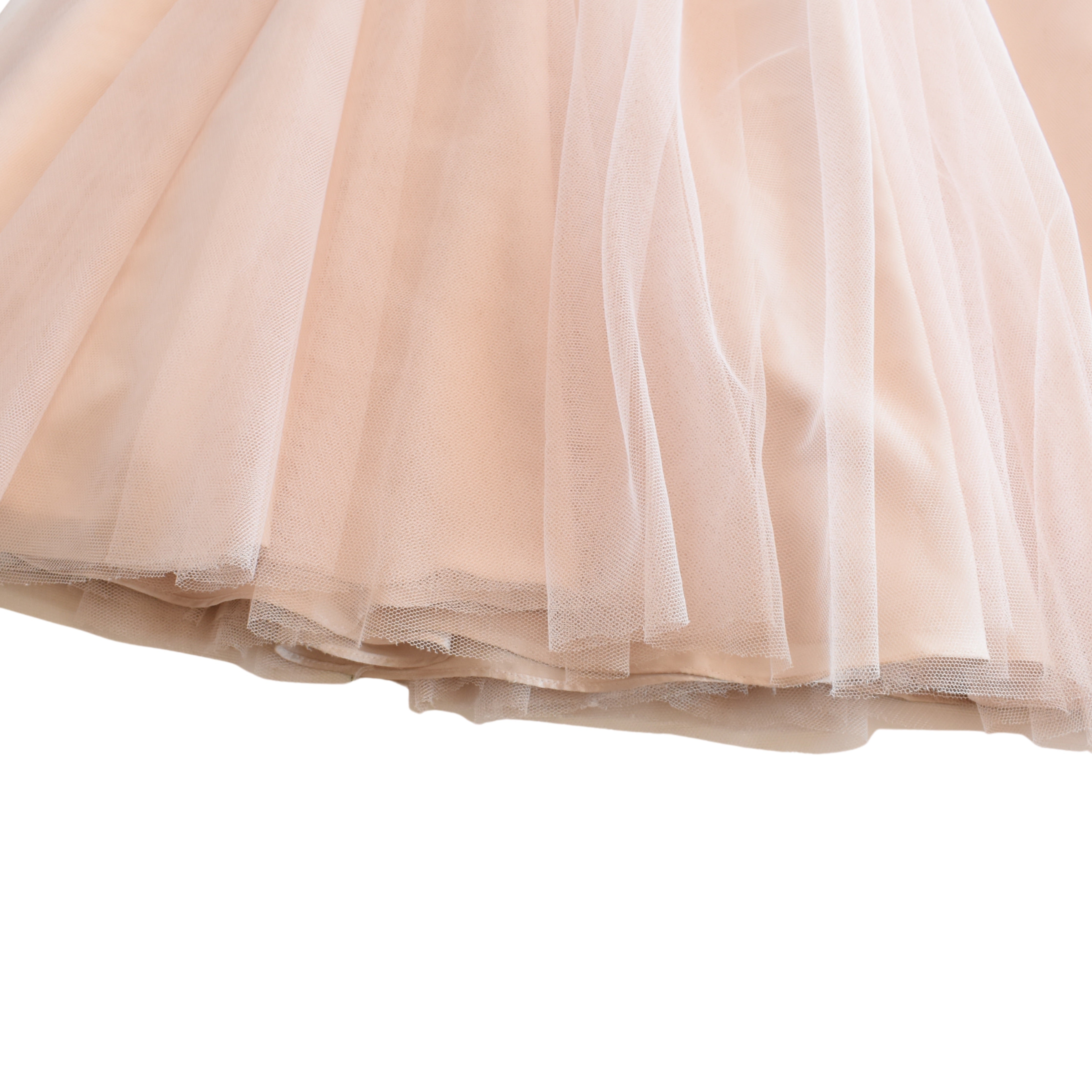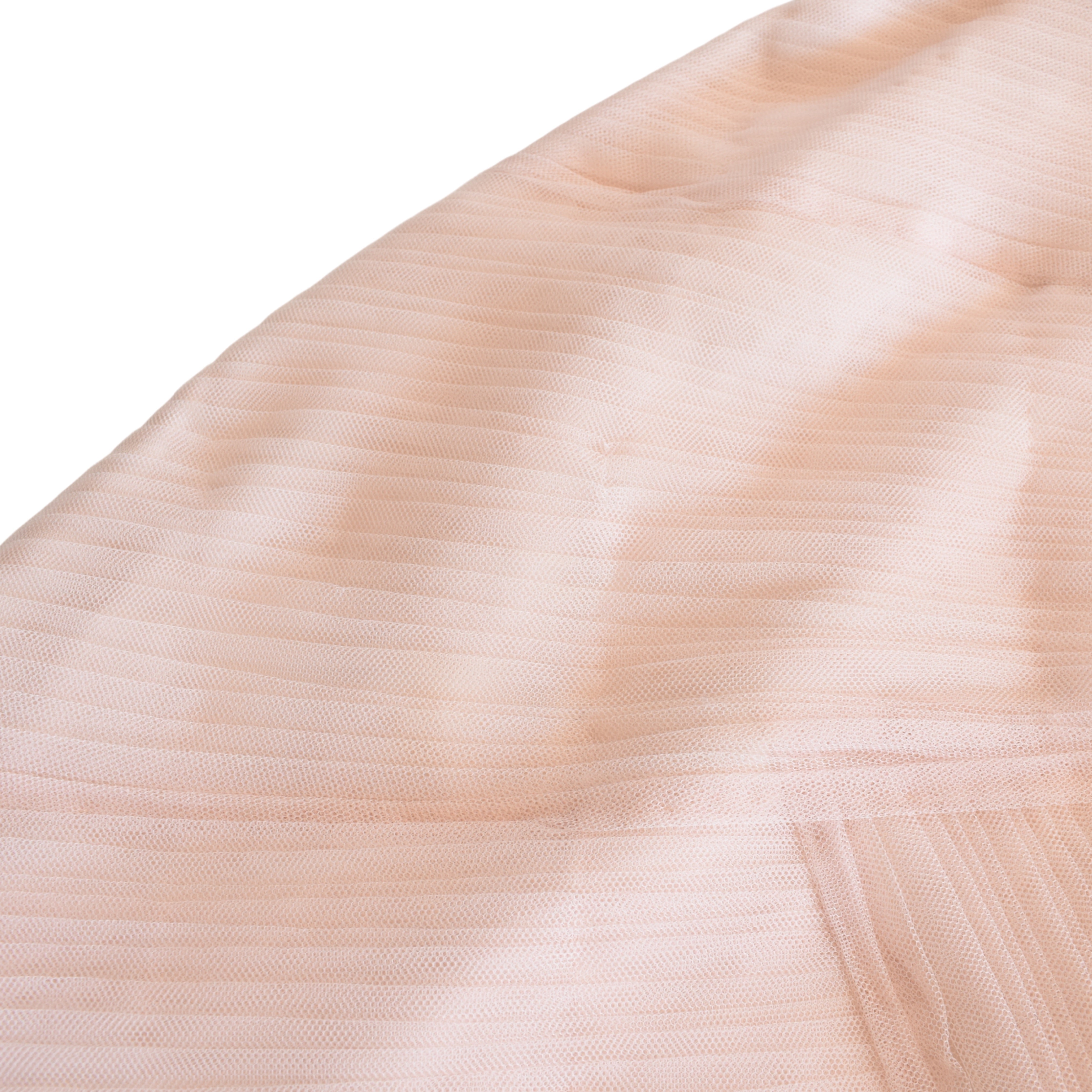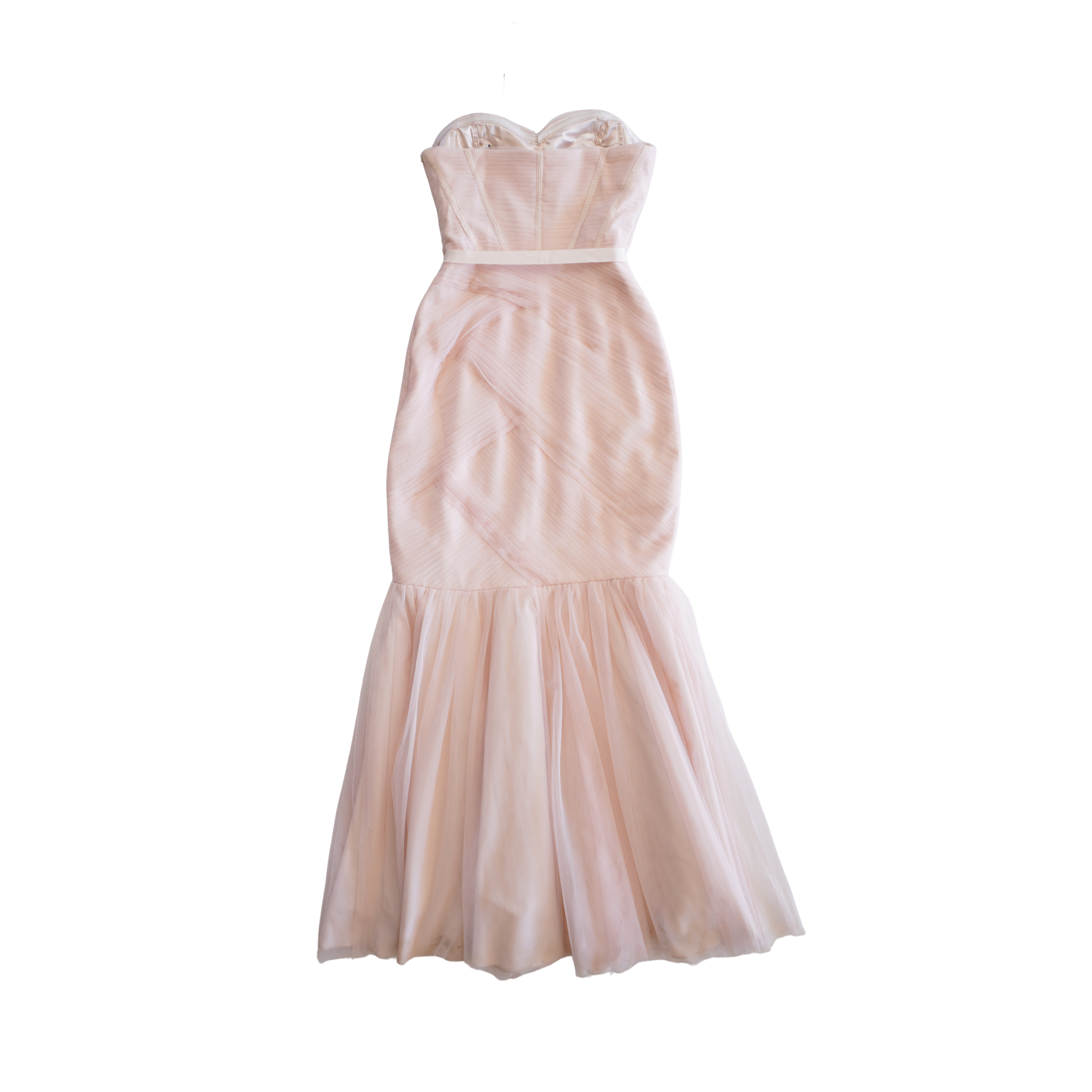 Monique Lhiullier strapless bridesmaids dress in pink mesh with bodice and body pleating and flared mermaid hem. Featuring a pink ribbon at the waist and sweetheart neckline.