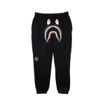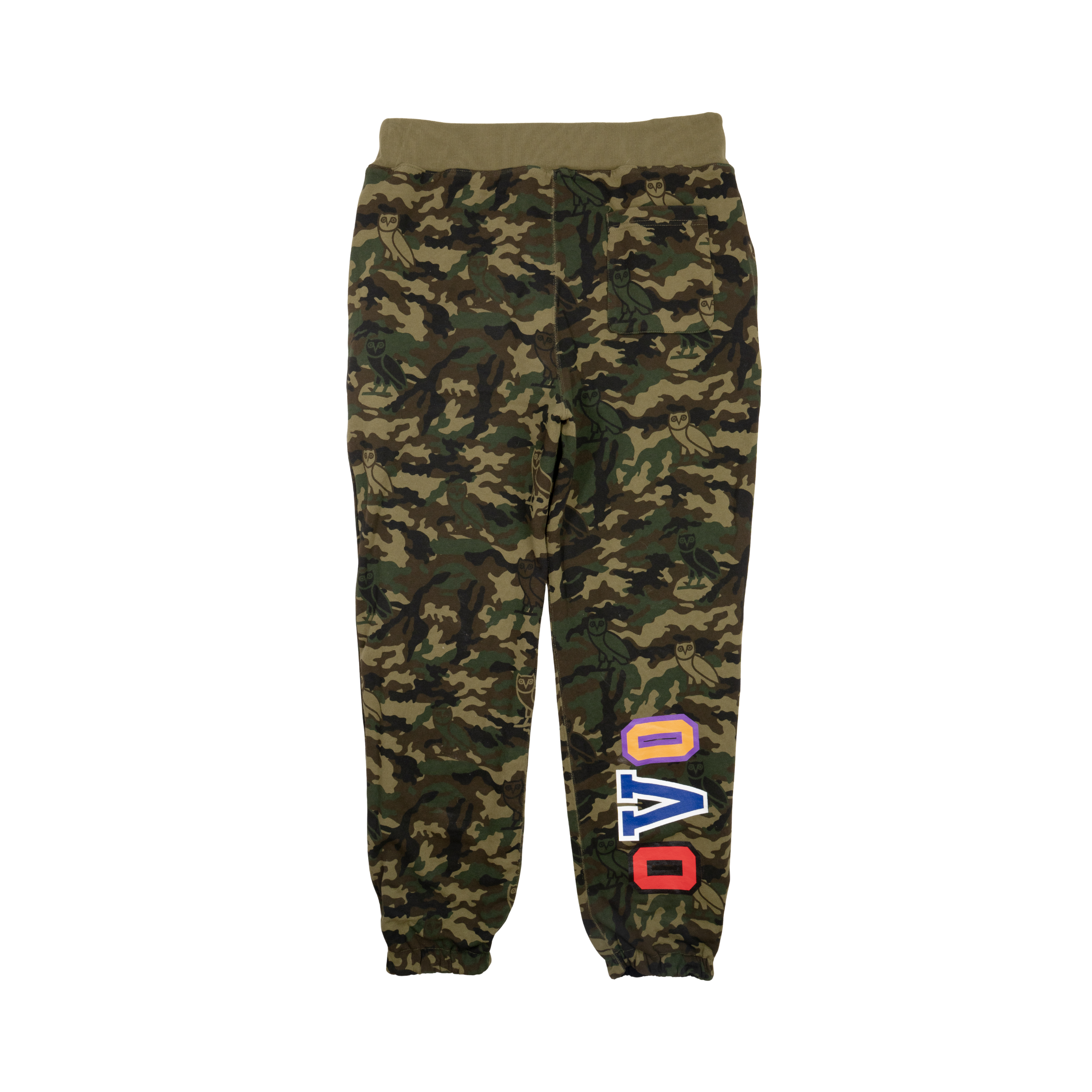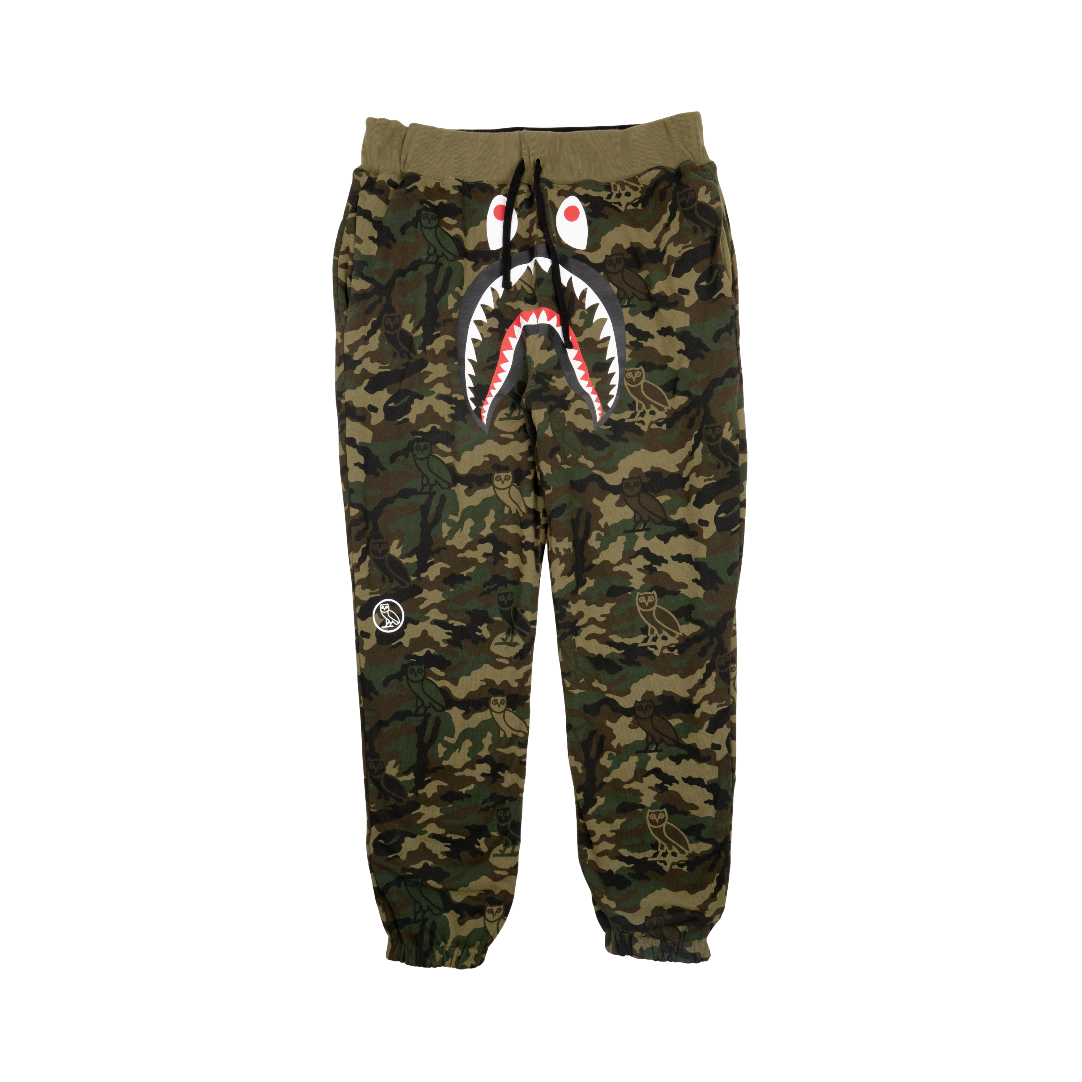 Bape x OVO reversible tapered shark face sweatpants. Features one black side and one ovo owl 'woodland' camo print side, both with shark face motif and OVO logo in Bape font on the back of the calf, a drawstring waist, side hand pockets and back pockets, and elasticized ankles. From the 2021 collection.