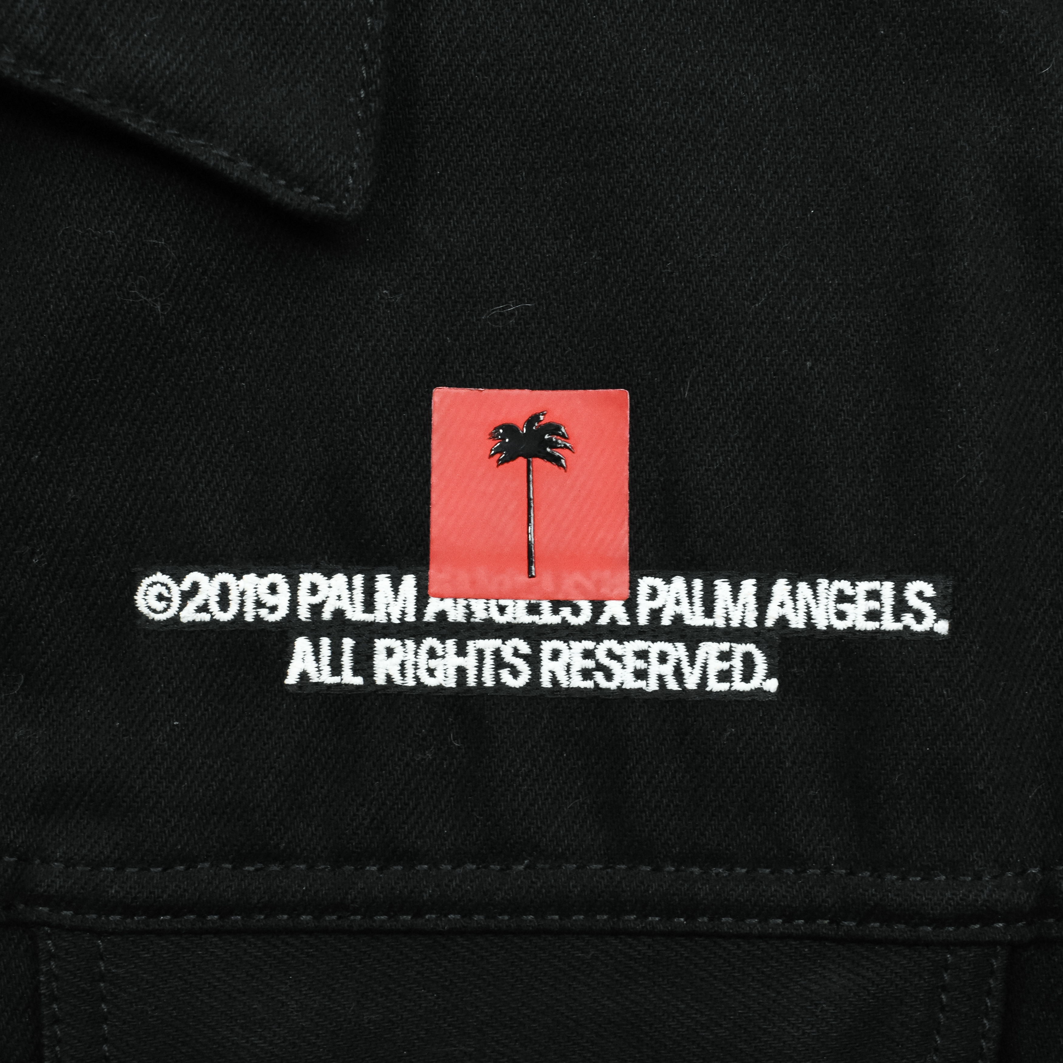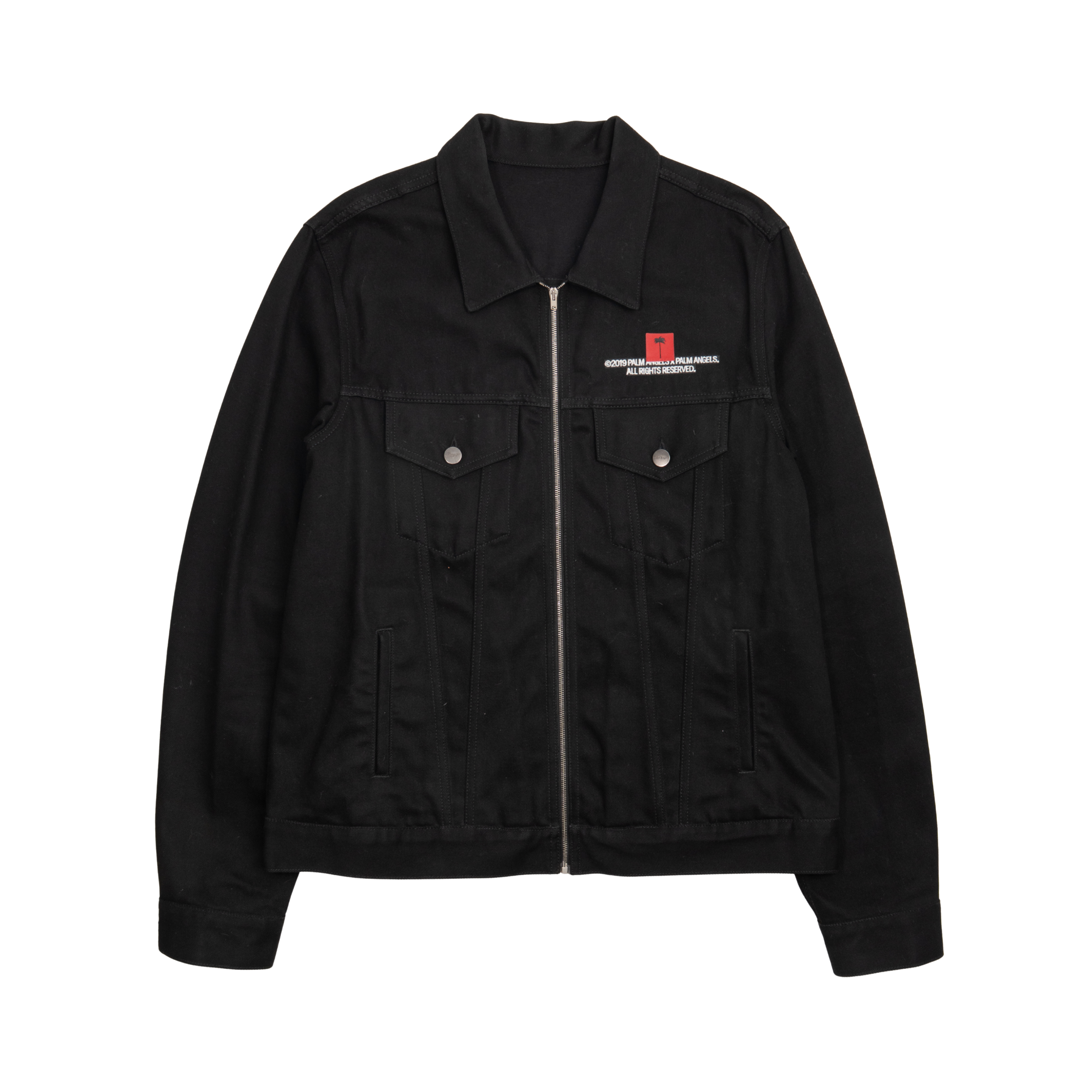 Palm Angels trucker jacket in black denim with chest pockets, side slip pockets and zipper closure in silver hardware. Features white embroidered logo with red palm tree print on the chest and large red palm tree print on the back.