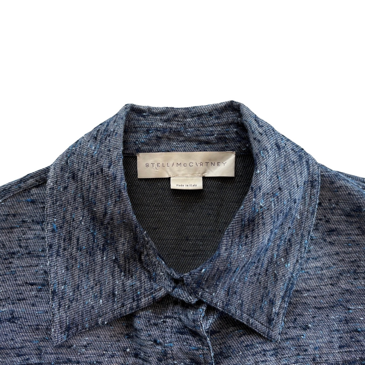Stella McCartney sleeveless button-down dress in blue chambray with a front pleat, zipper fly, side seam pockets and chest flap pockets.