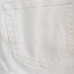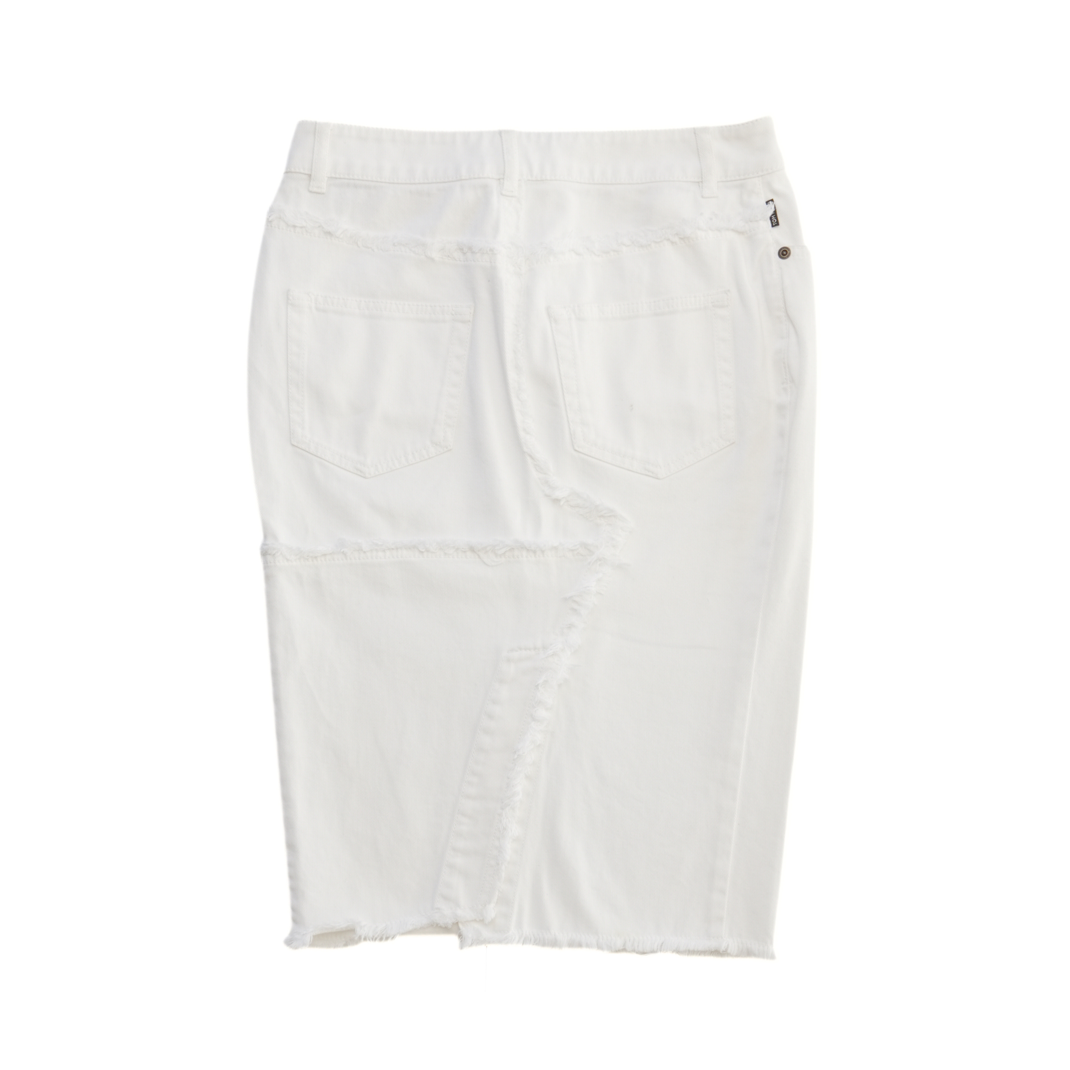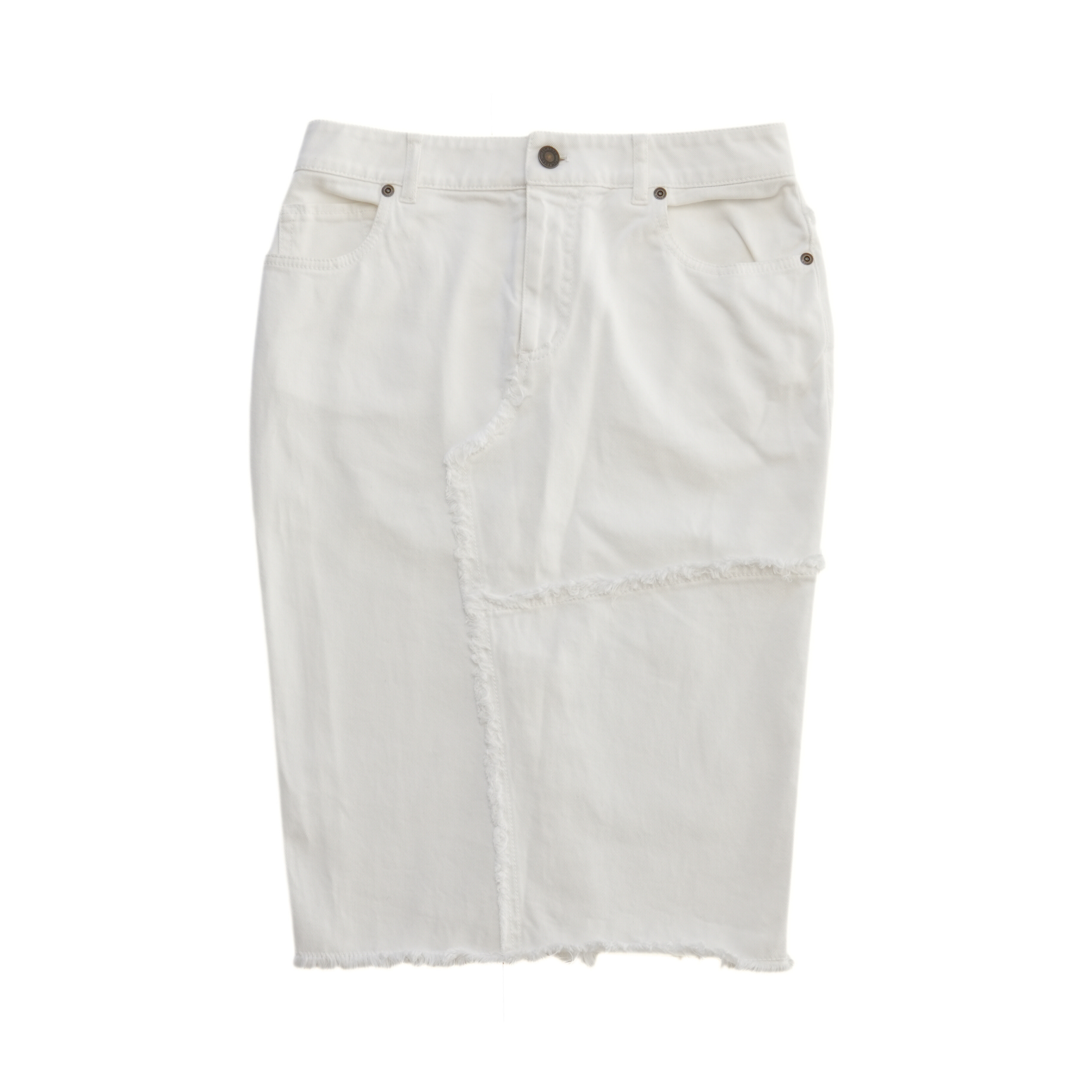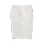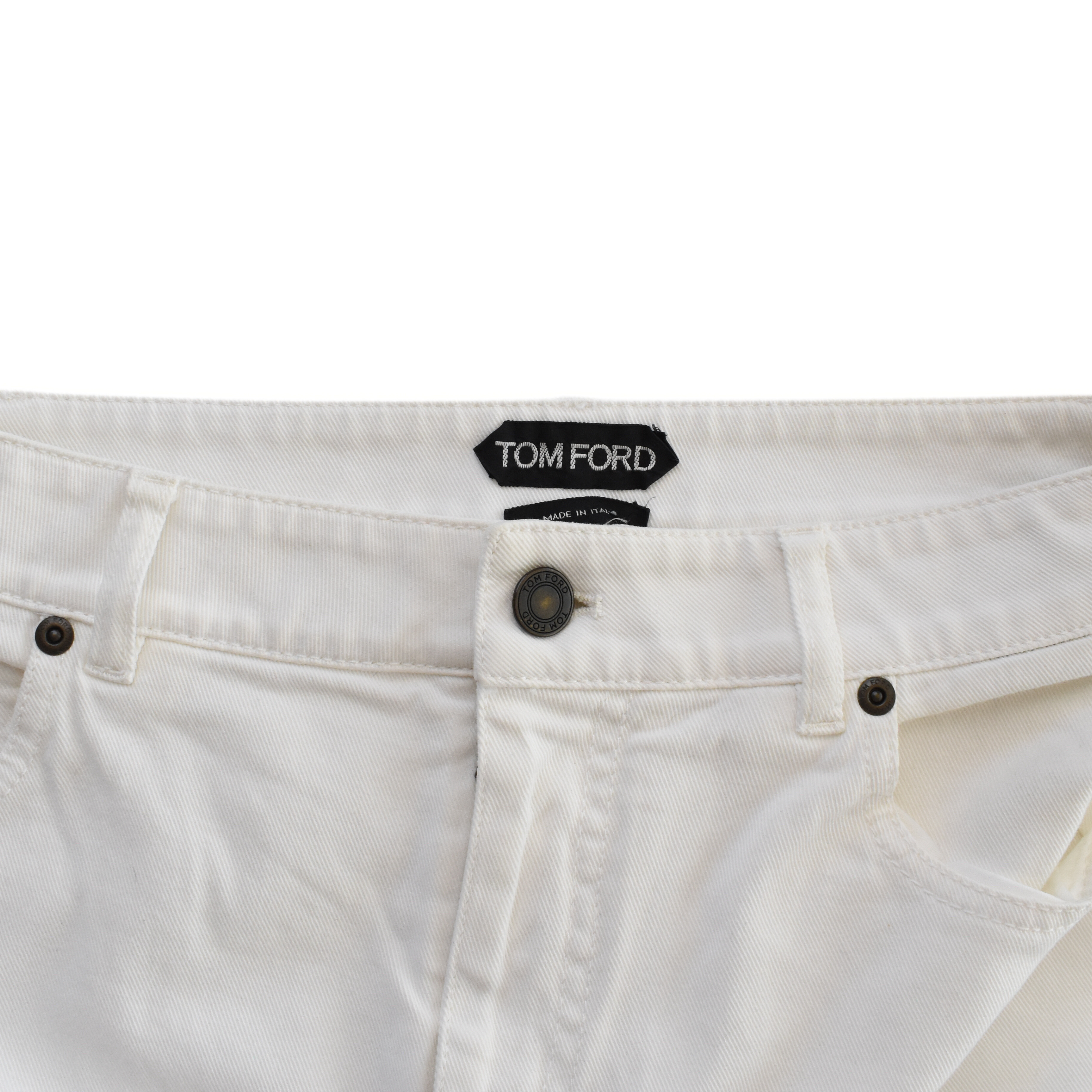 Tom Ford knee-length pencil skirt in white cotton denim with raw edges throughout, dark brass button hardware, and a small black logo tab on the back.