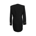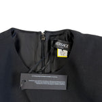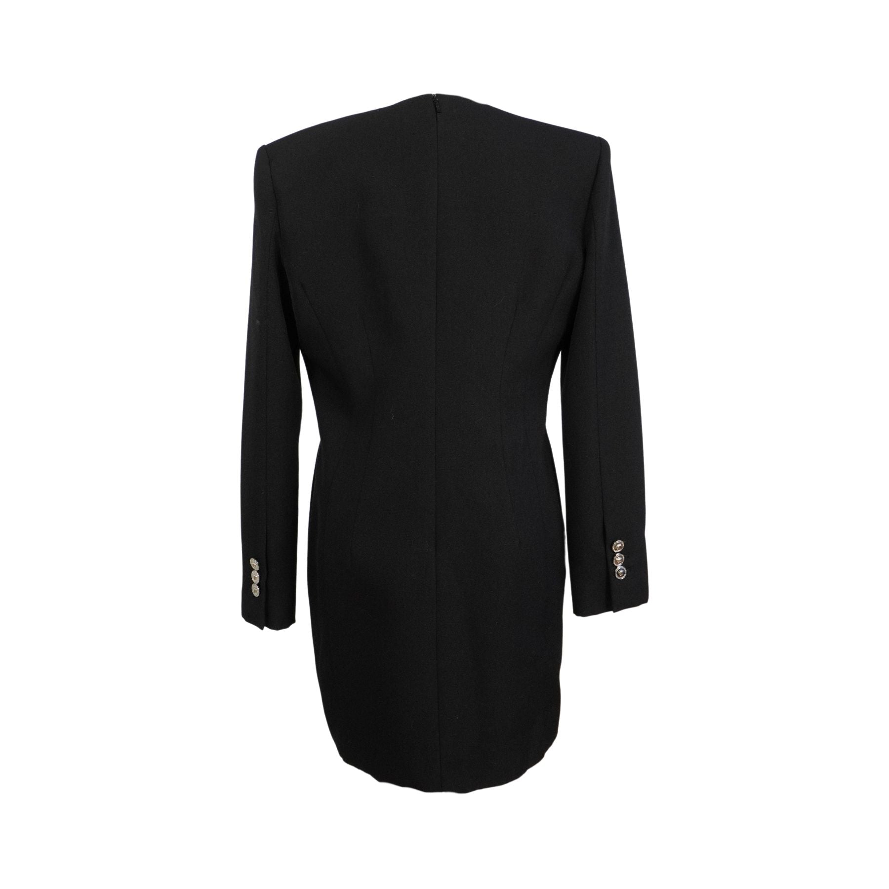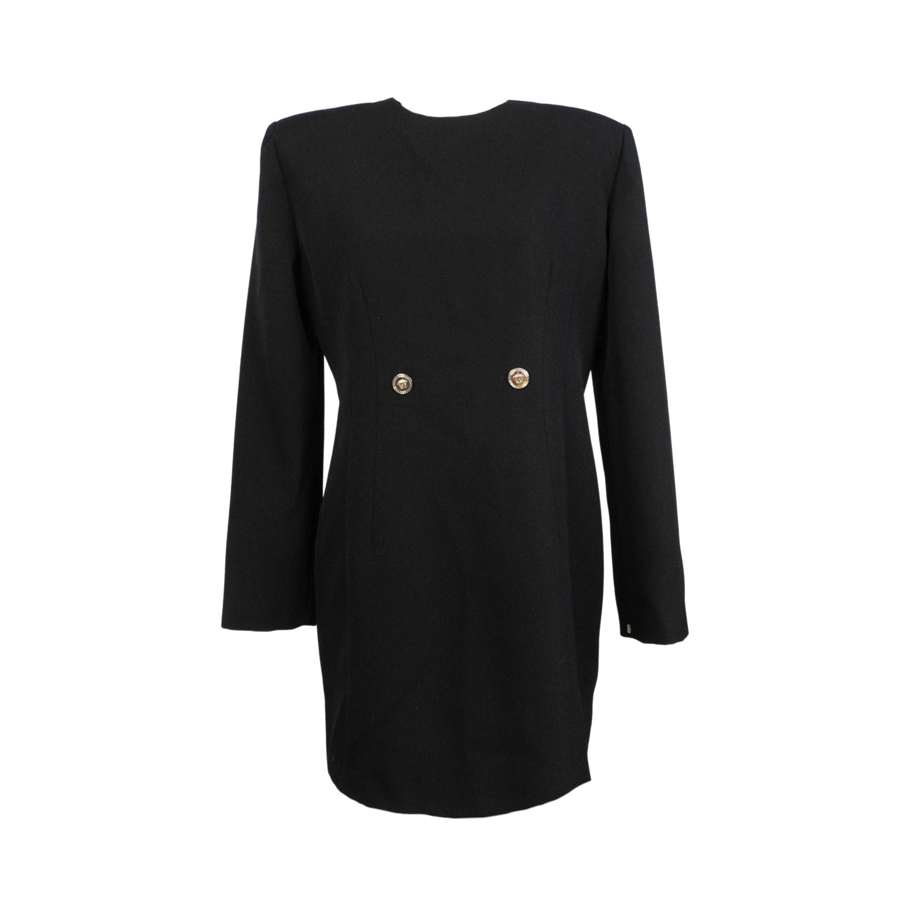 Versace 'Hourglass' mini dress in black wool with padded shoulders and silver crested buttons at the waist and cuffs.
