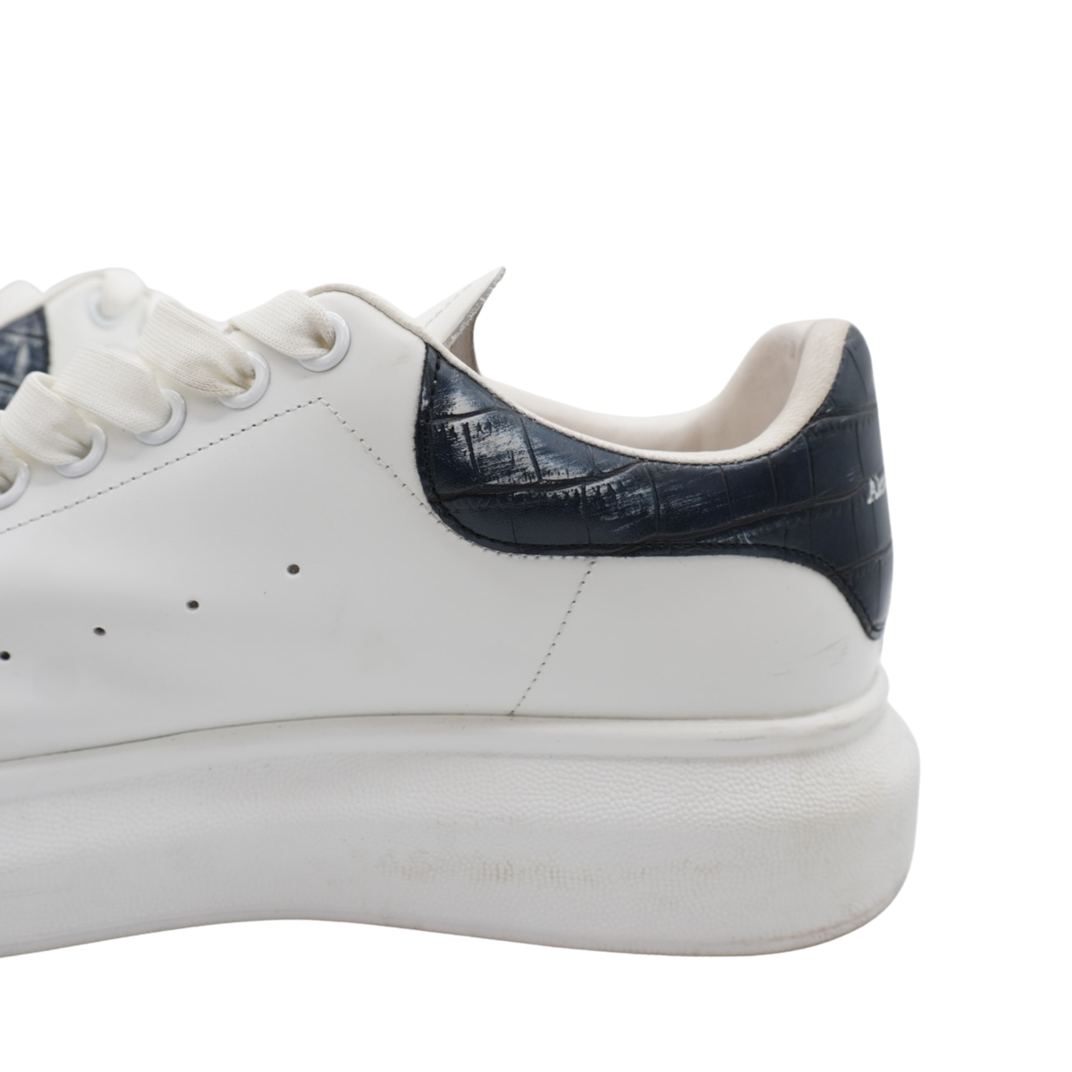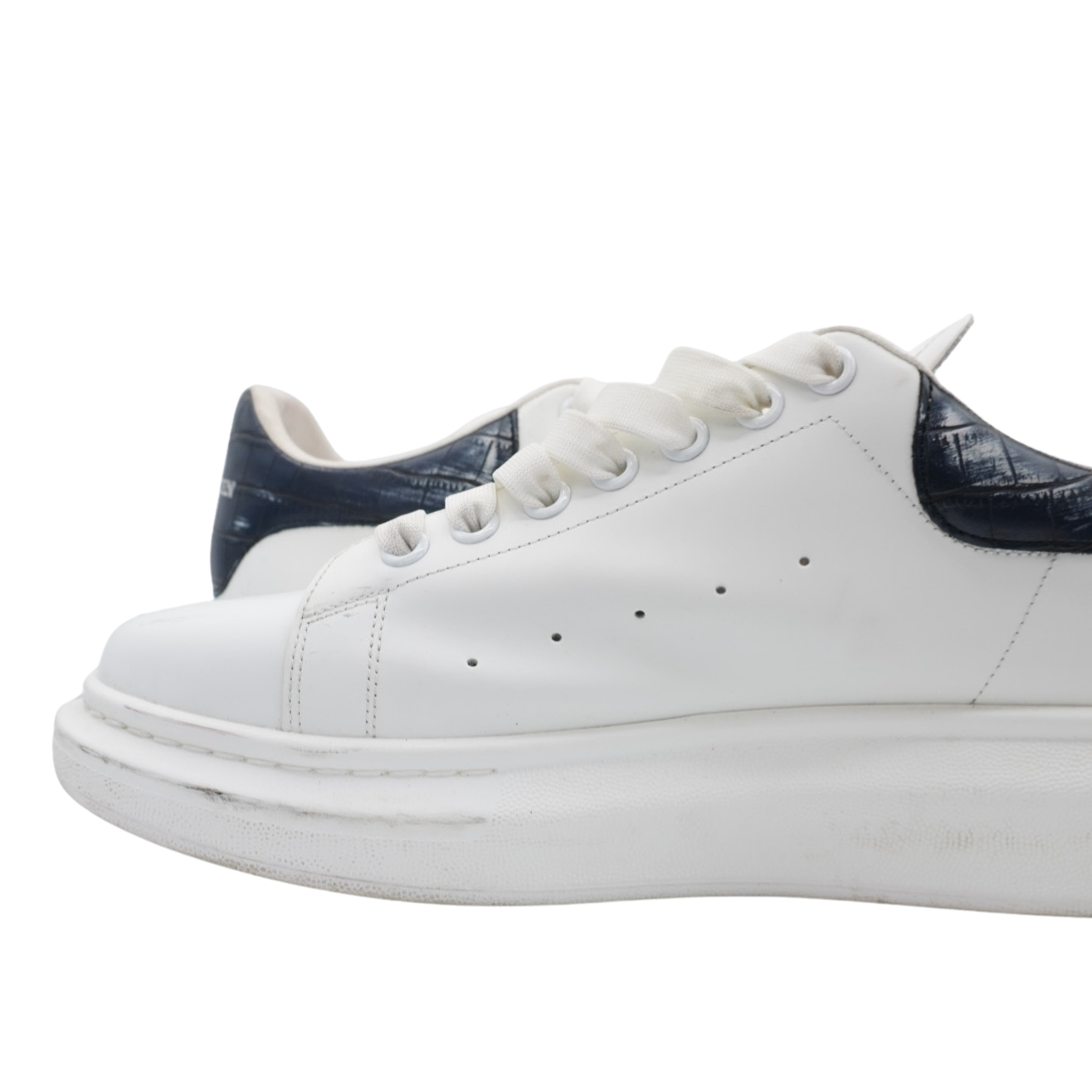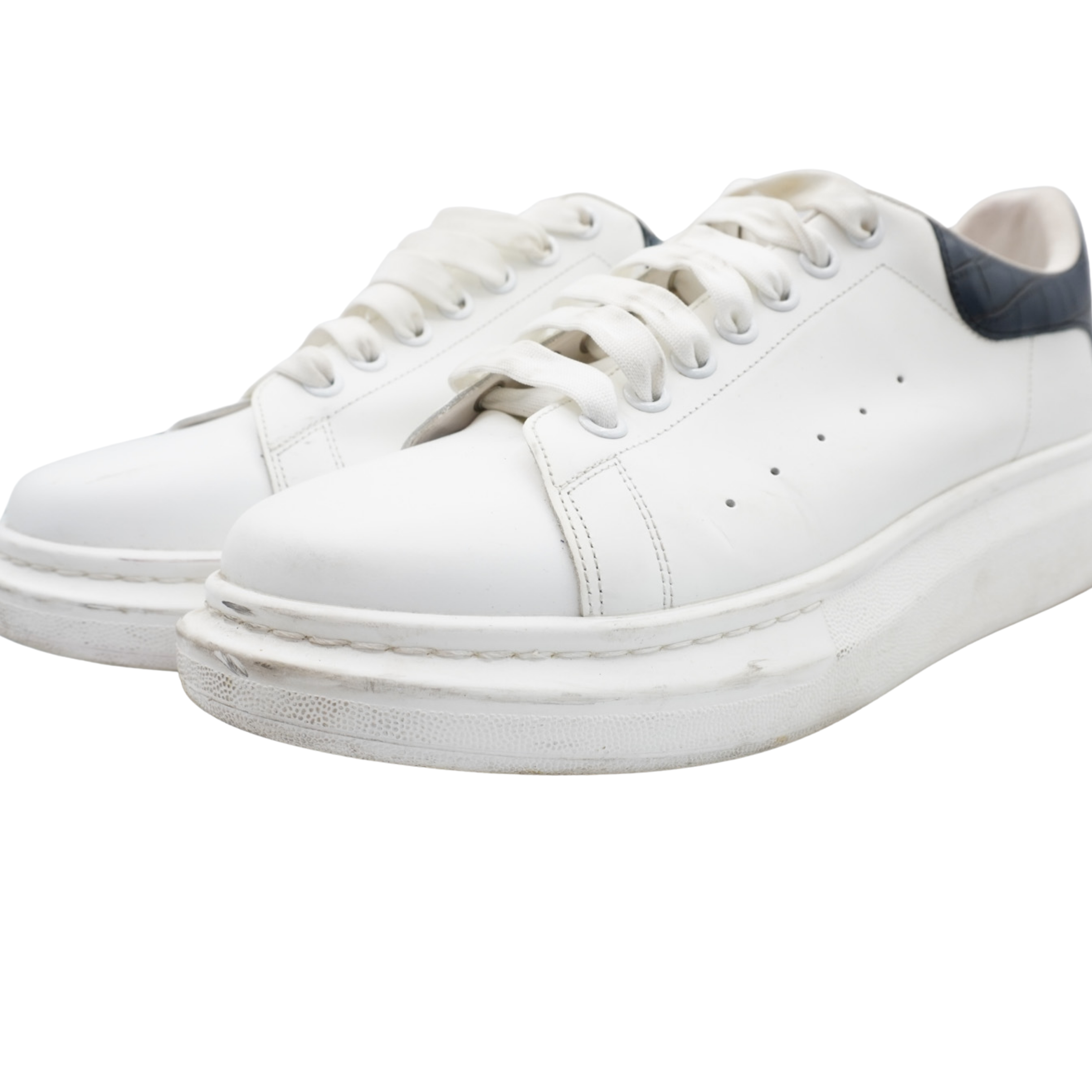 Alexander McQueen 'Larry' chunky lowtop sneakers in white leather with a navy croc embossed heel detail with a round toe and flat white laces.