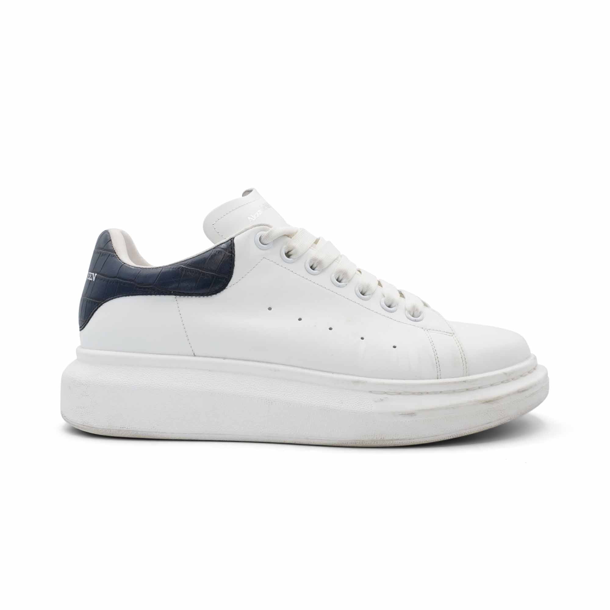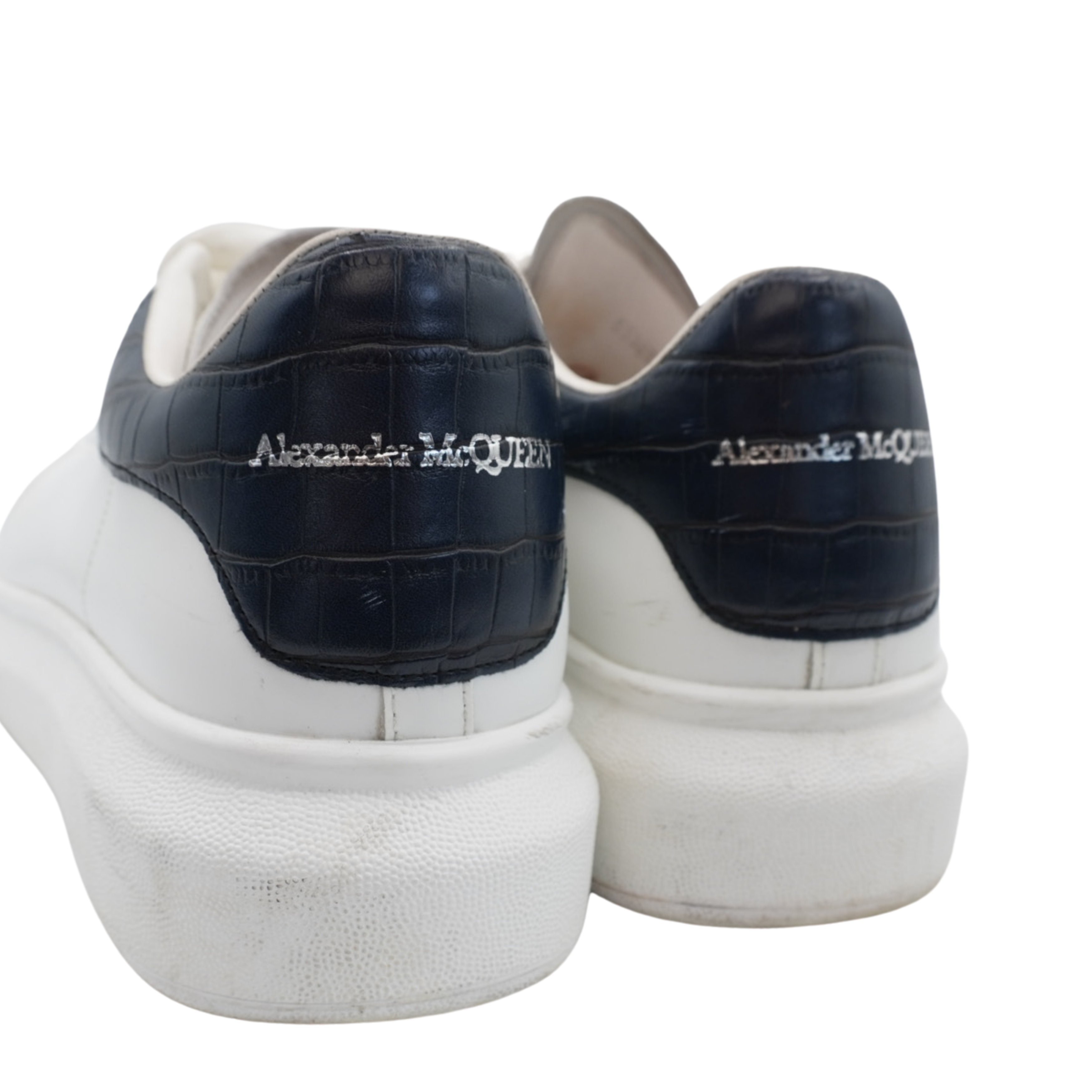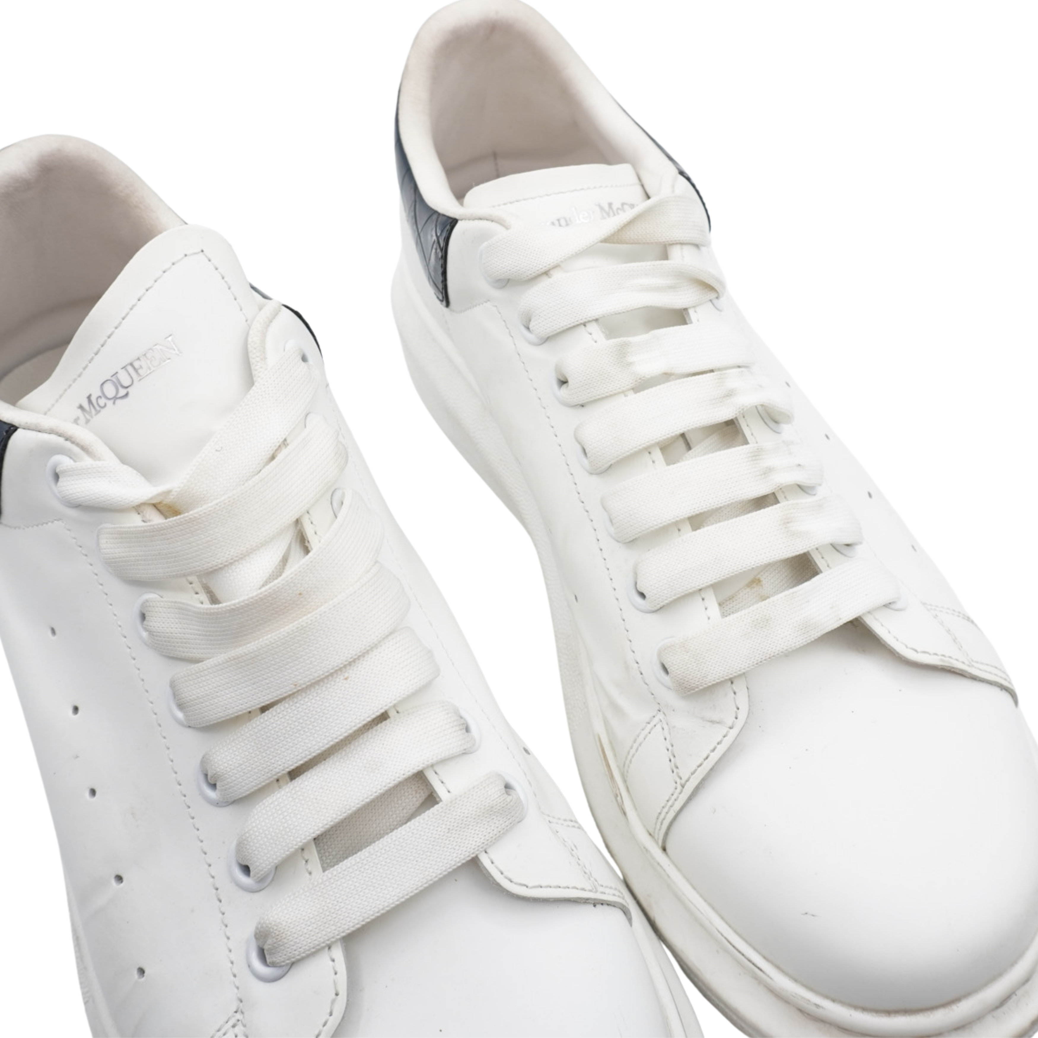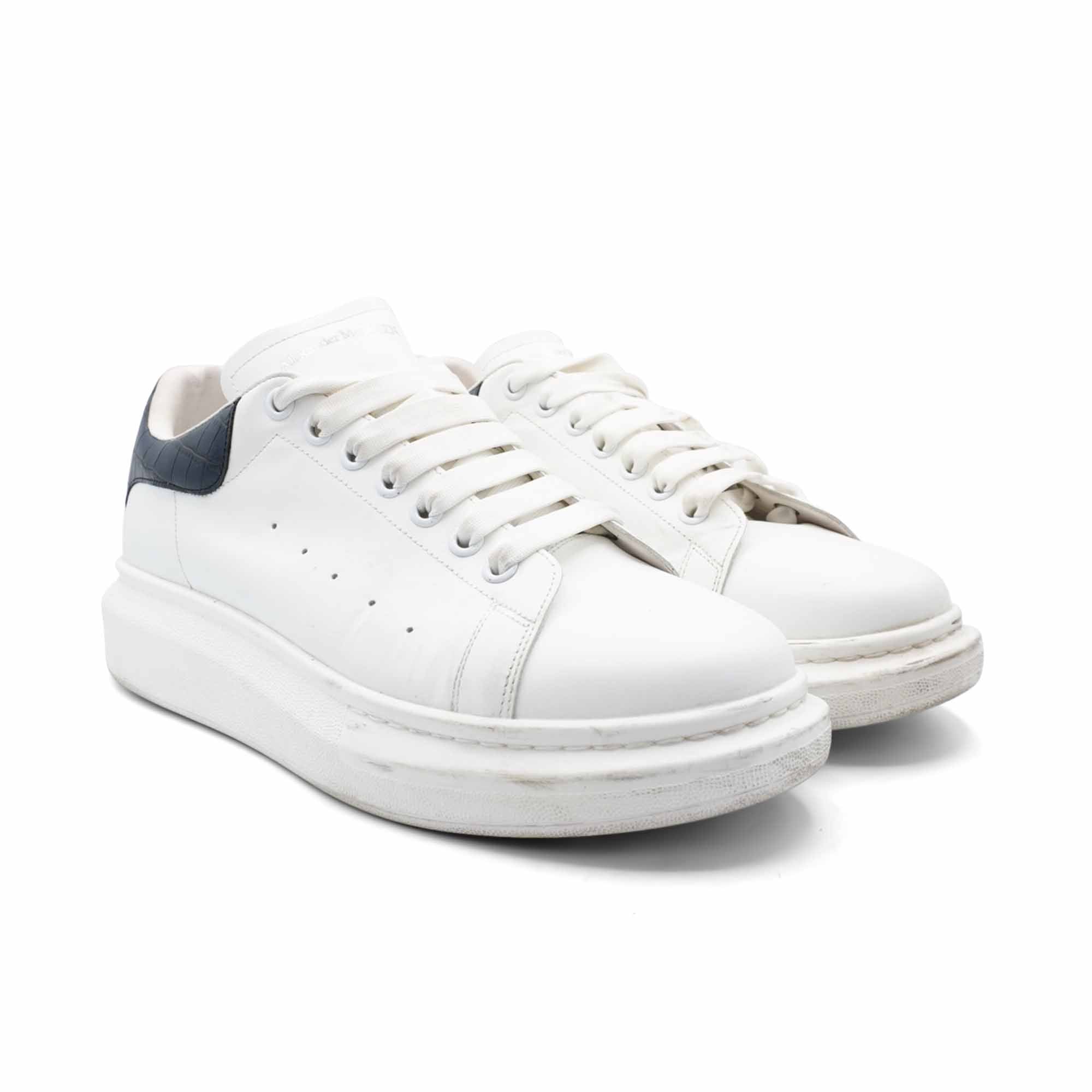 Alexander McQueen 'Larry' chunky lowtop sneakers in white leather with a navy croc embossed heel detail with a round toe and flat white laces.
