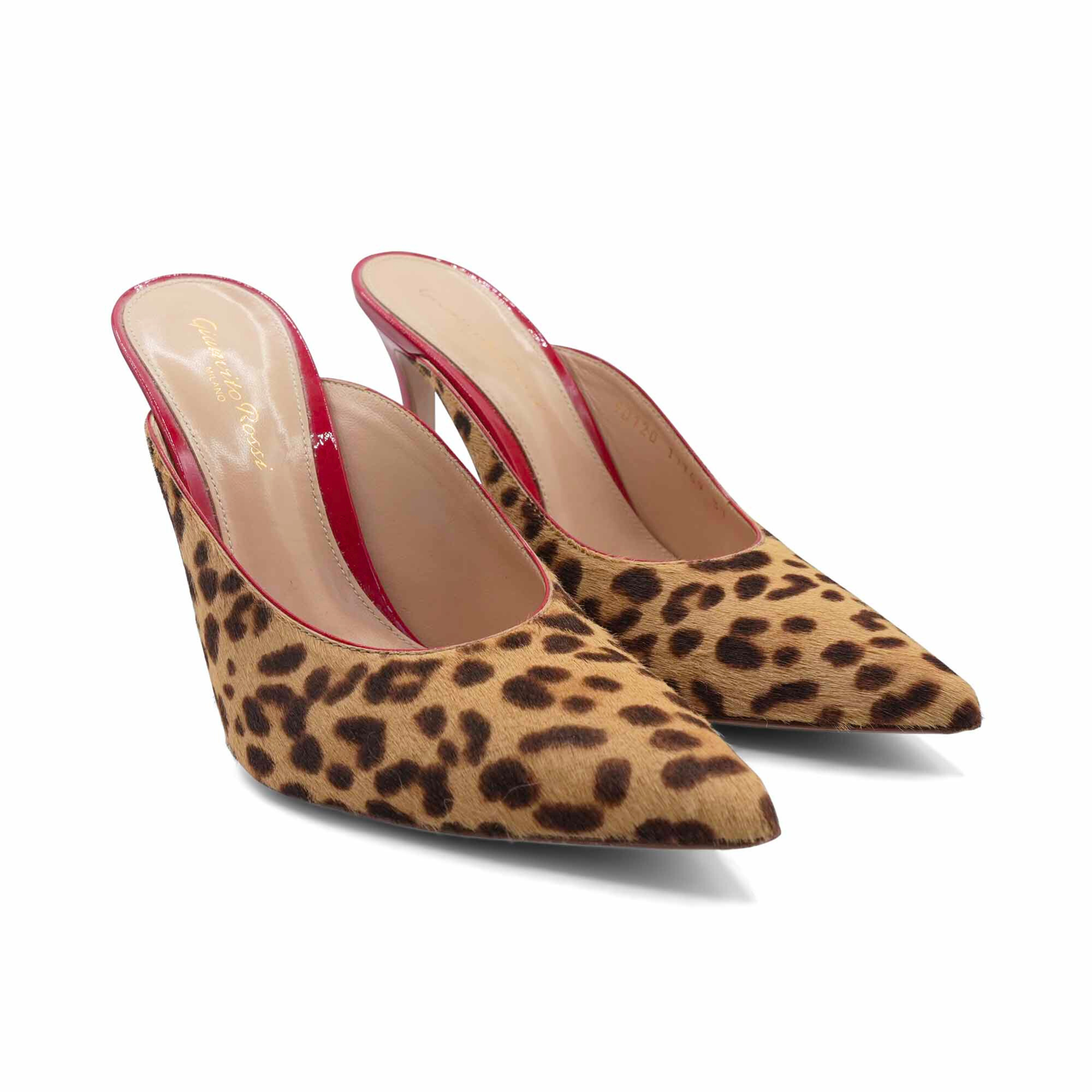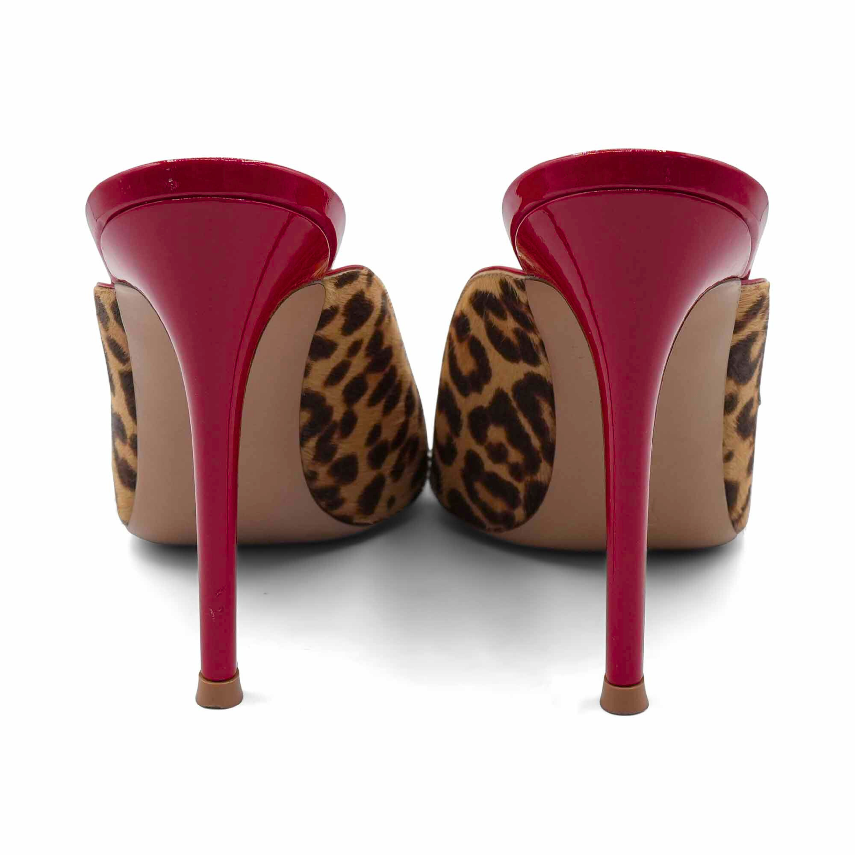 Gianvito Rossi 'Lyle' pointed toe mules in leopard print calf hair with red patent leather heels and piping.