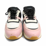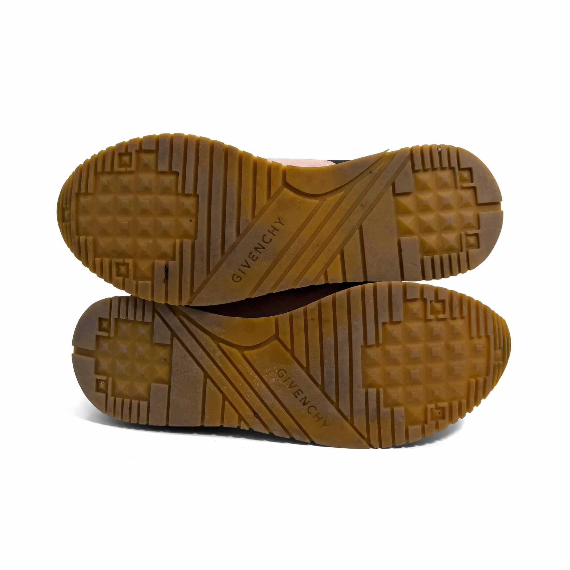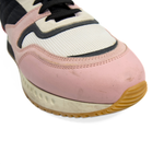 Givenchy low-top sneakers in pink suede and white mesh with red heel detailing and black flat laces.