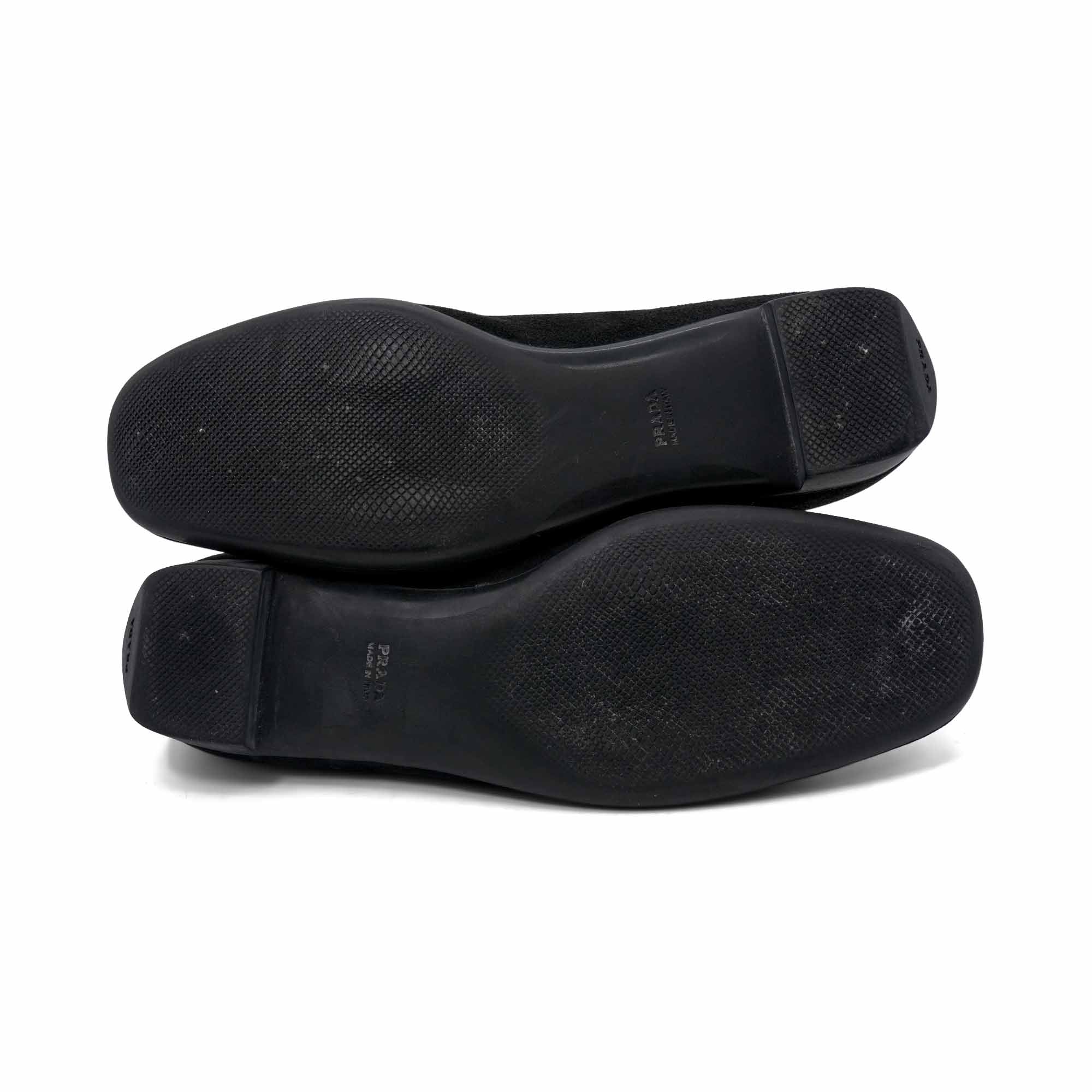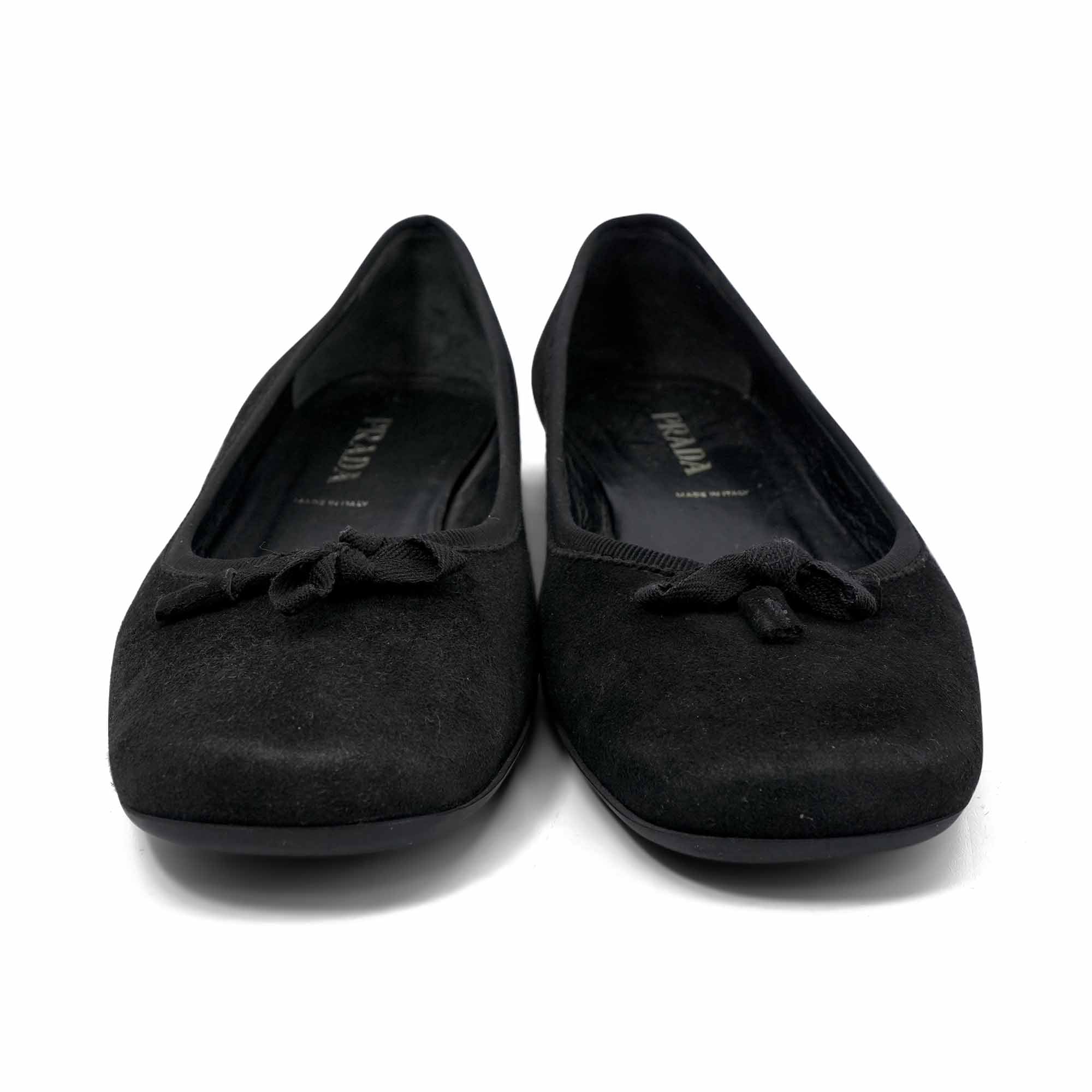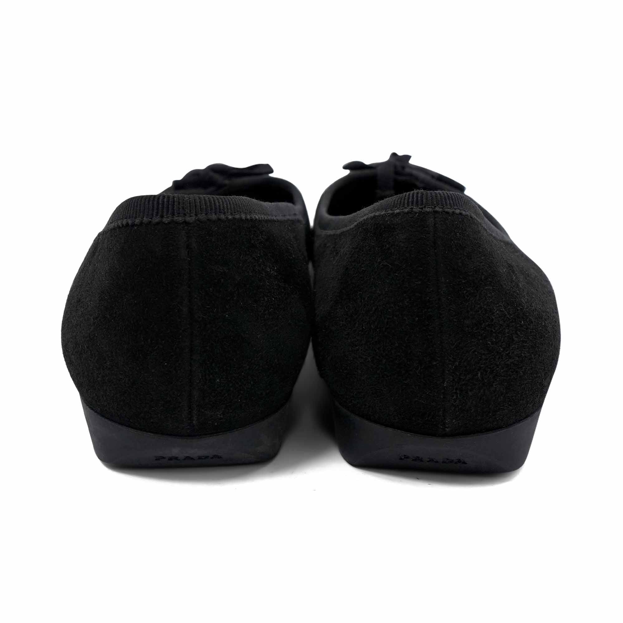 Prada ballet flats in black suede with rubber soles, a ribbon trim, and a bow detail.