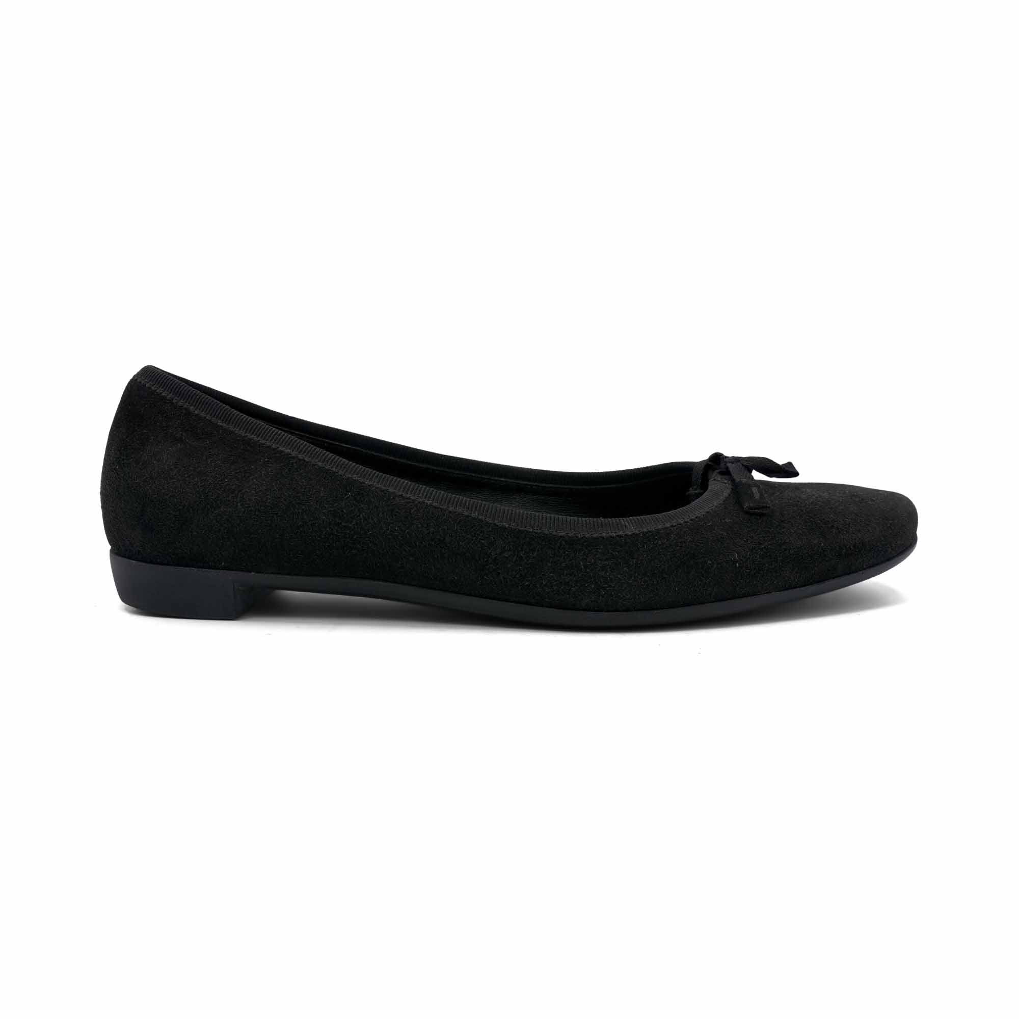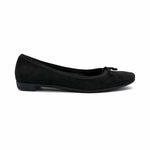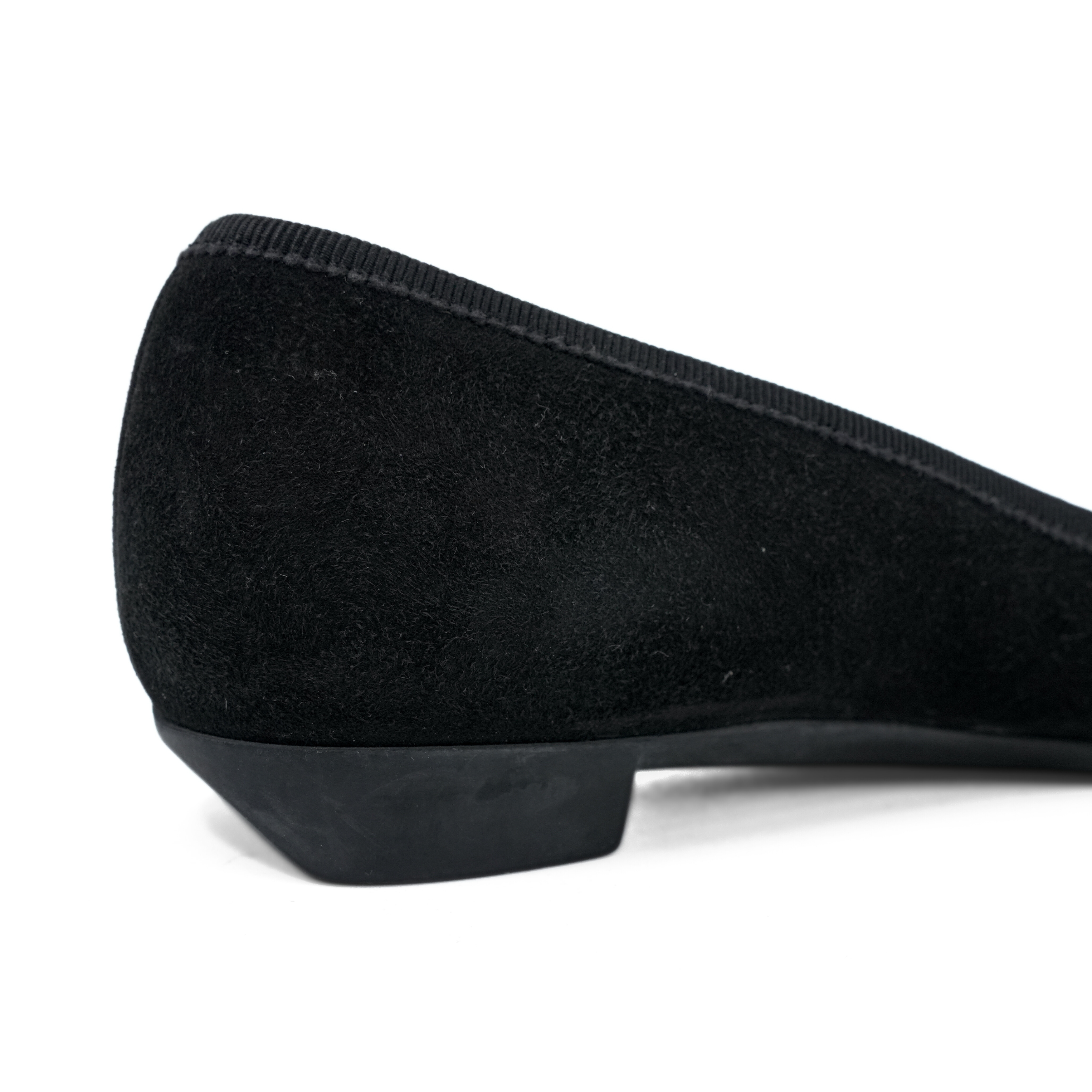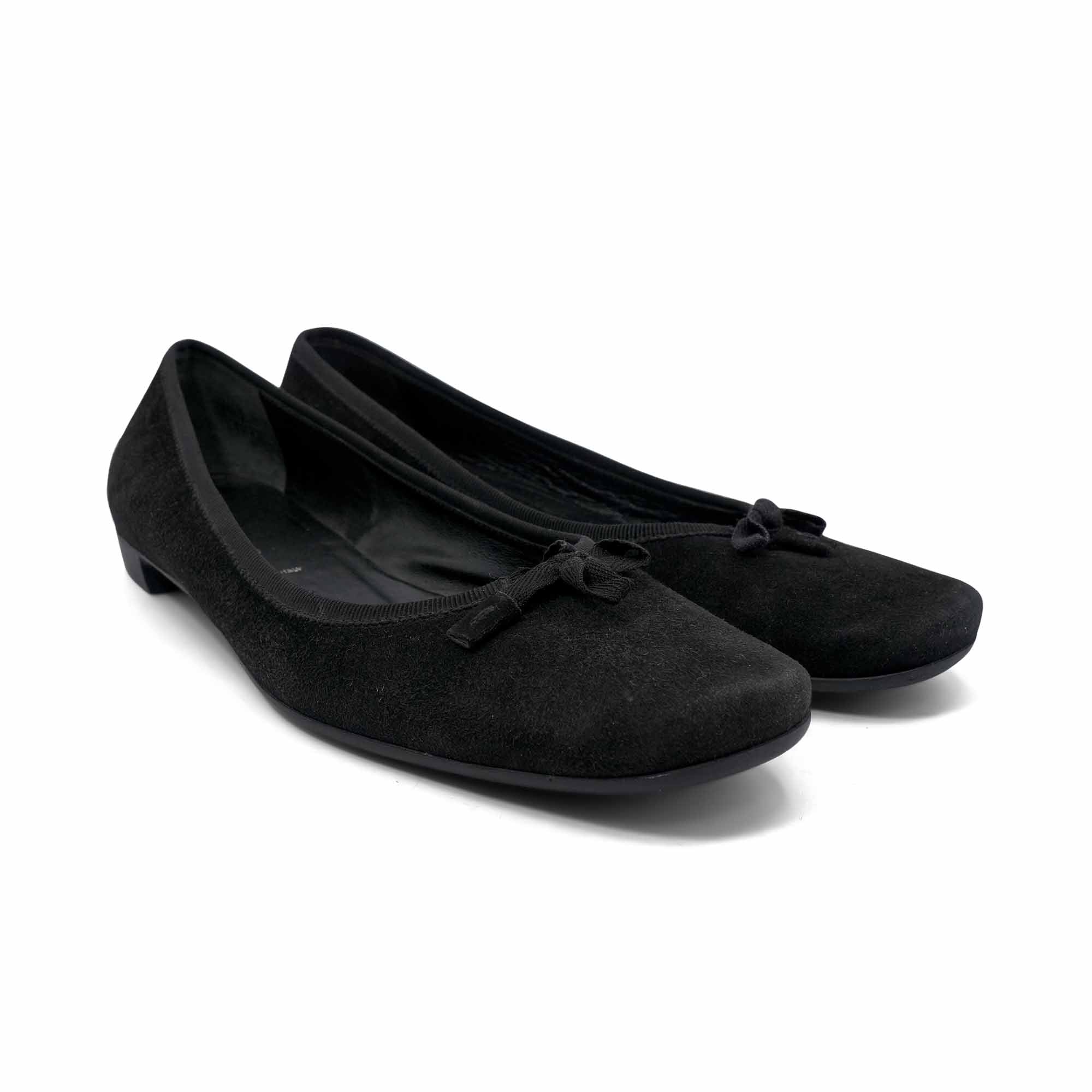 Prada ballet flats in black suede with rubber soles, a ribbon trim, and a bow detail.