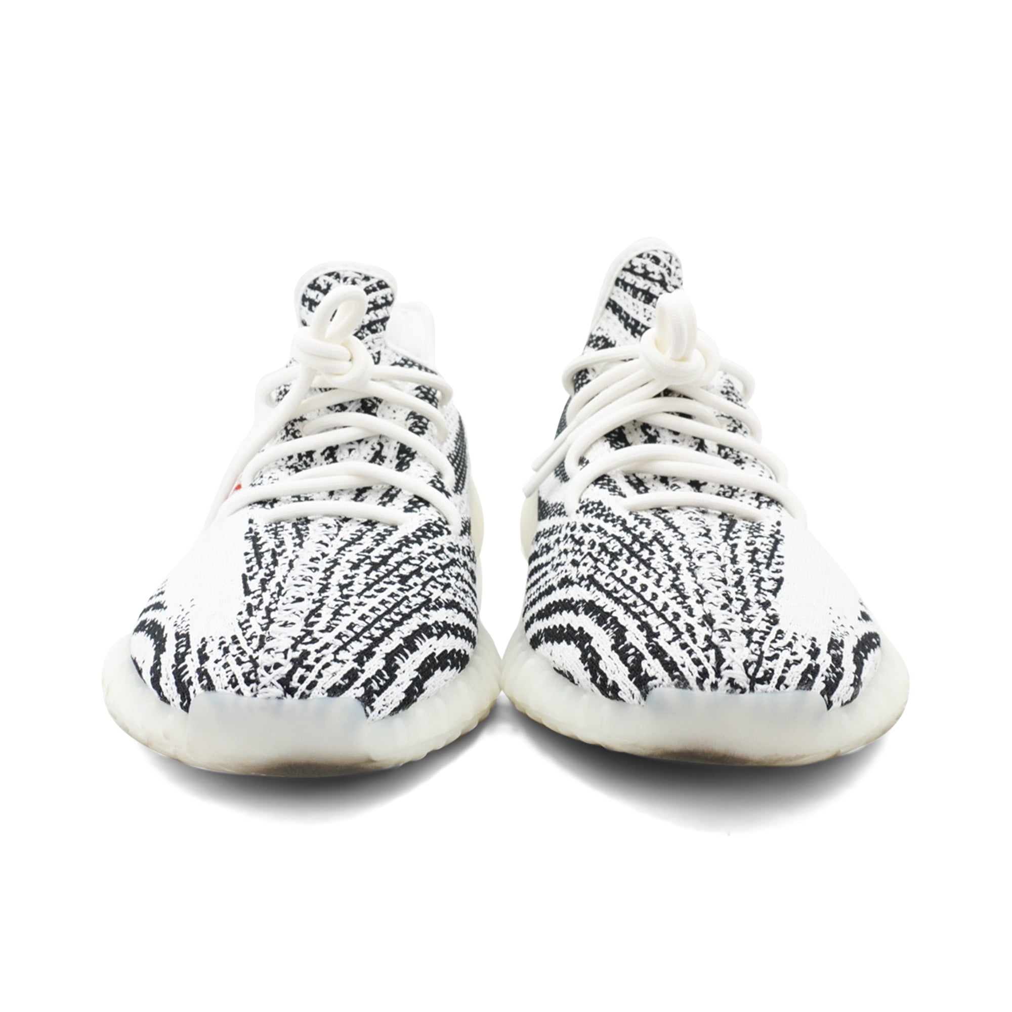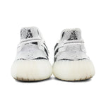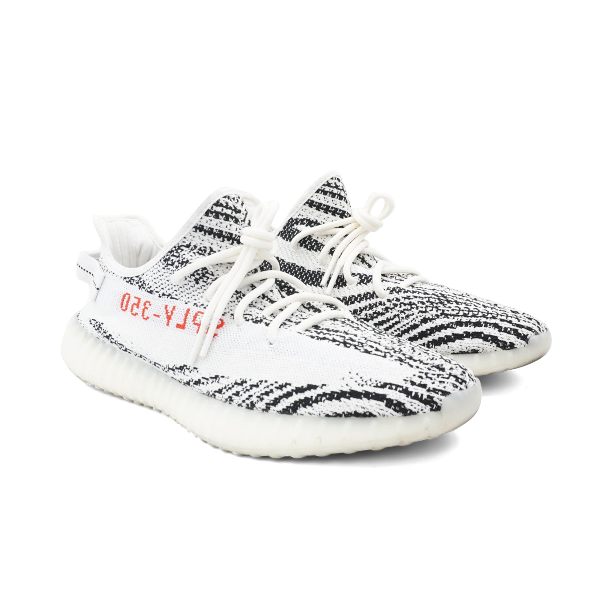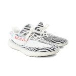 Yeezy 'Boost 350 V2' sneakers in white and black striped prime knit with red logo text, white laces and ribbed soles.
