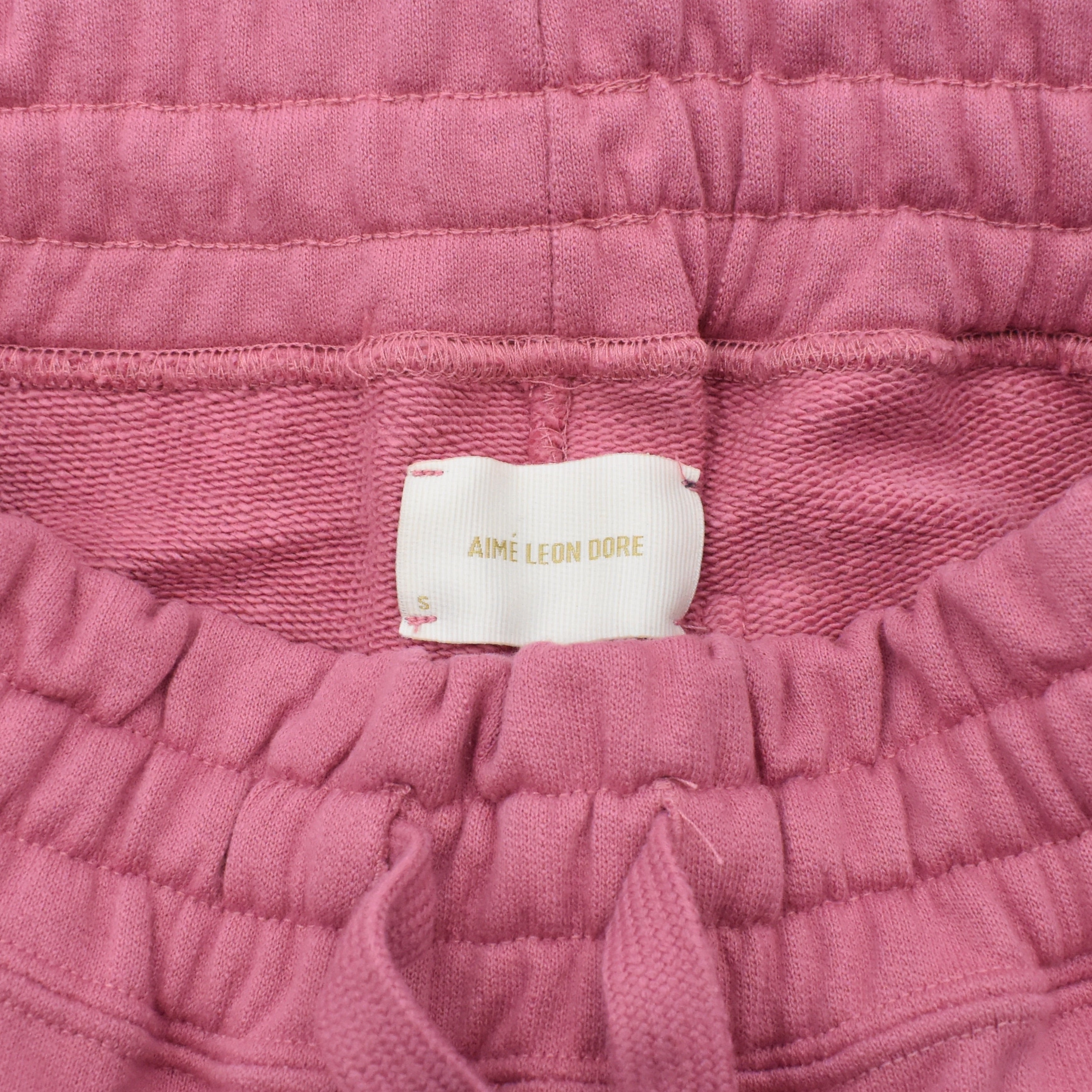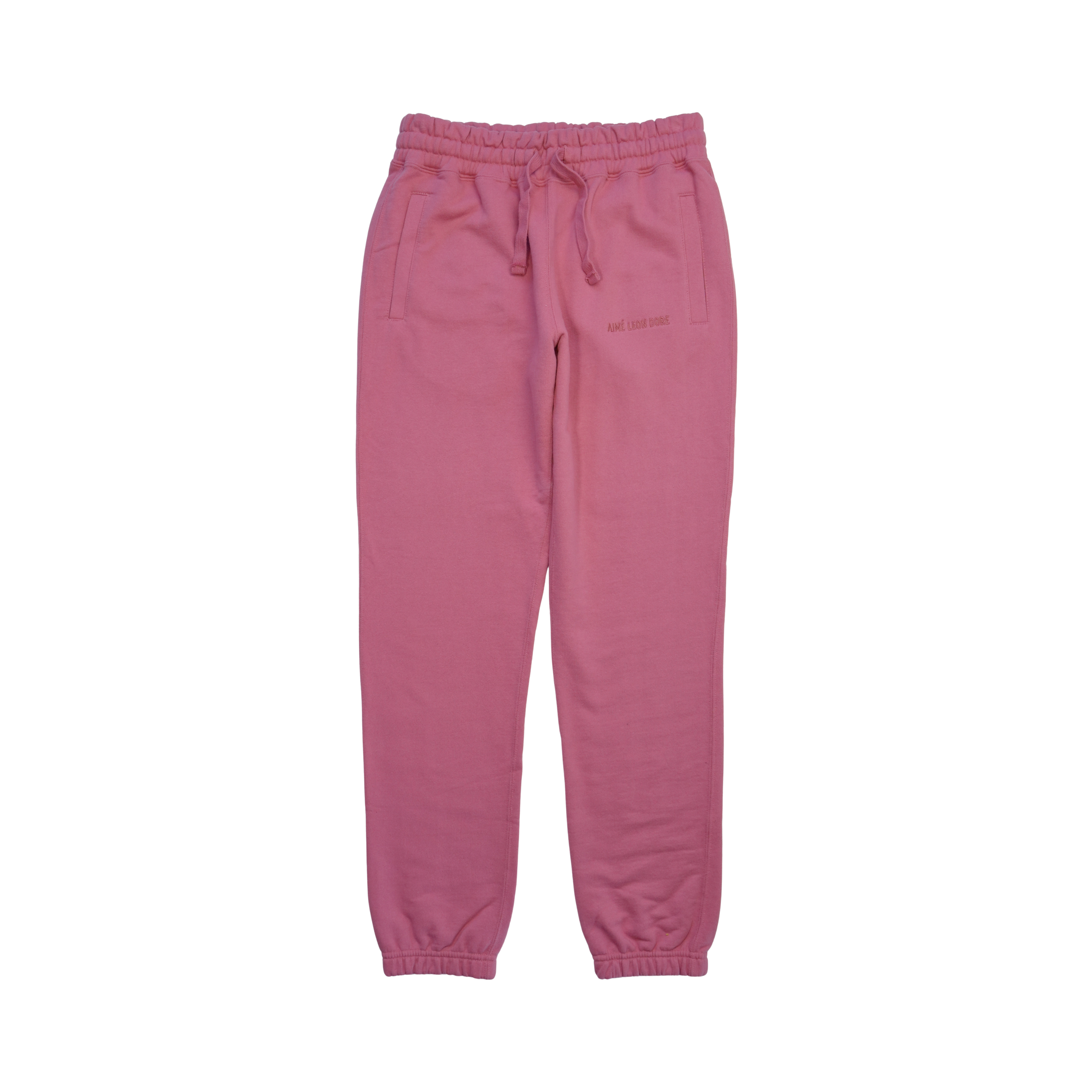 Aime Leon Dore dusty pink sweat pants with tonal logo embroidery, slit pockets at the hips, and patch pockets on the back.