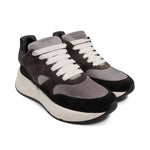 Alexander McQueen 'Oversized Runner' sneaker in grey and black suede with white rubber sole and with black leather heel. Featuring white logo text across the back.